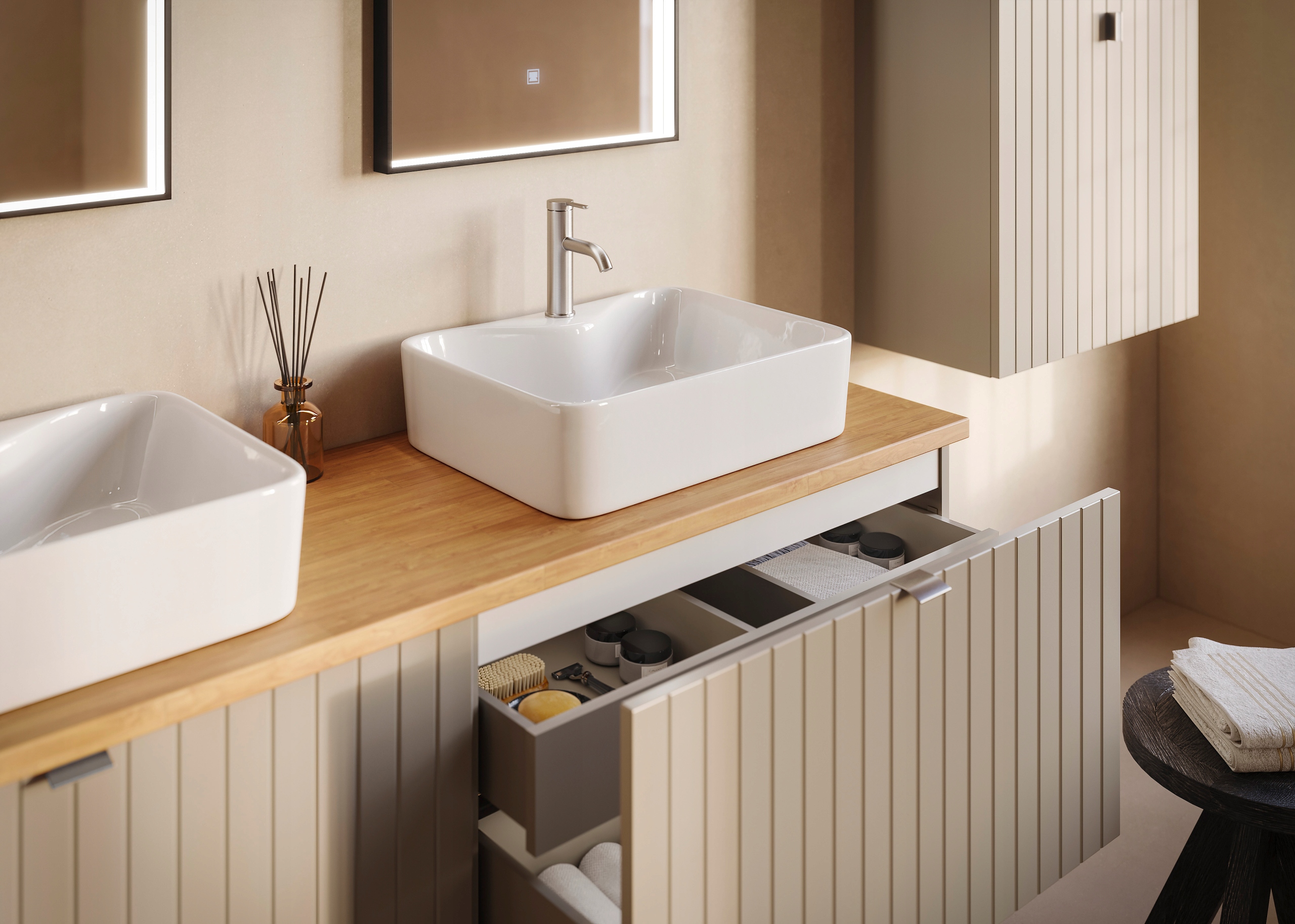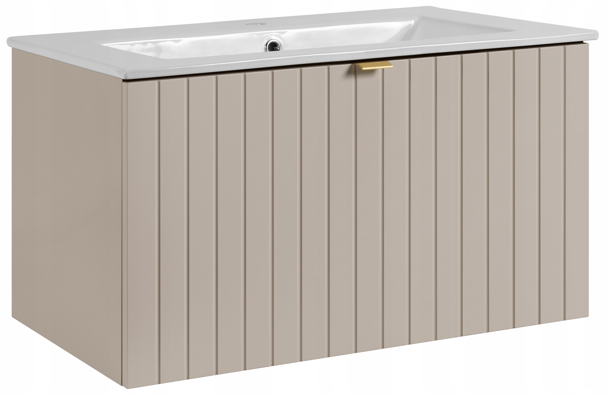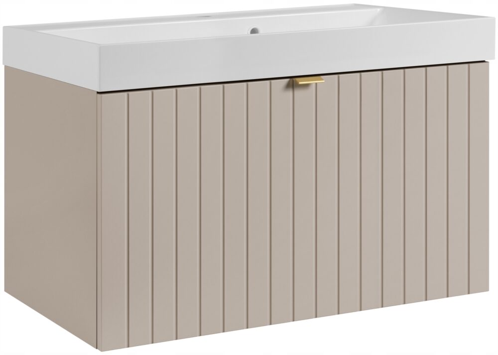 Kolekcja HARMO łączy elegancki design z funkcjonalnymi rozwiązaniami, które doskonale komponują się z nowoczesnymi łazienkami. Pionowo frezowane fronty z płyty MDF w kaszmirowym półmacie podkreślają subtelny i nowoczesny charakter mebla, a wisząca konstrukcja dodaje lekkości i ułatwia sprzątanie. Szafka o szerokości 80 cm została wyposażona w pojemną szufladę zewnętrzną na prowadnicach Hettich Quadro z funkcją cichego domyku oraz dodatkową wewnętrzną szufladkę idealną do przechowywania drobnych akcesoriów. W zestawie znajduje się umywalka ceramiczna w białym połysku oraz trzy warianty uchwytów: czarny, złoty i srebrny szczotkowany. Meble wyprodukowane w Polsce z wysokiej jakości materiałów.
