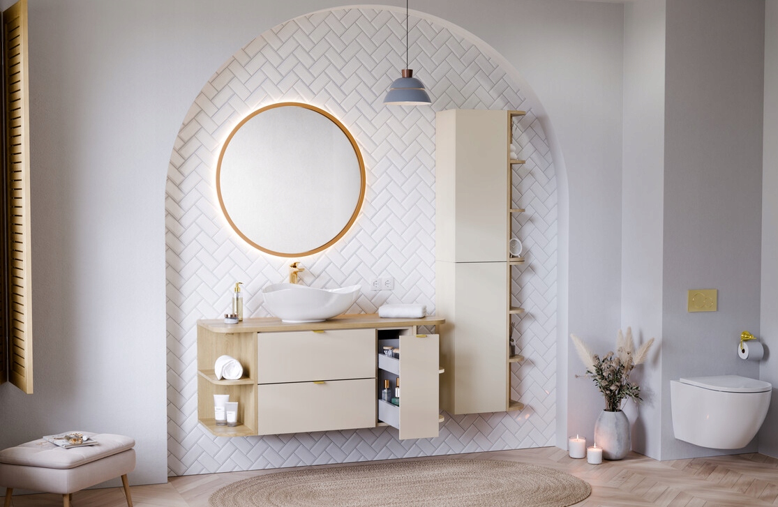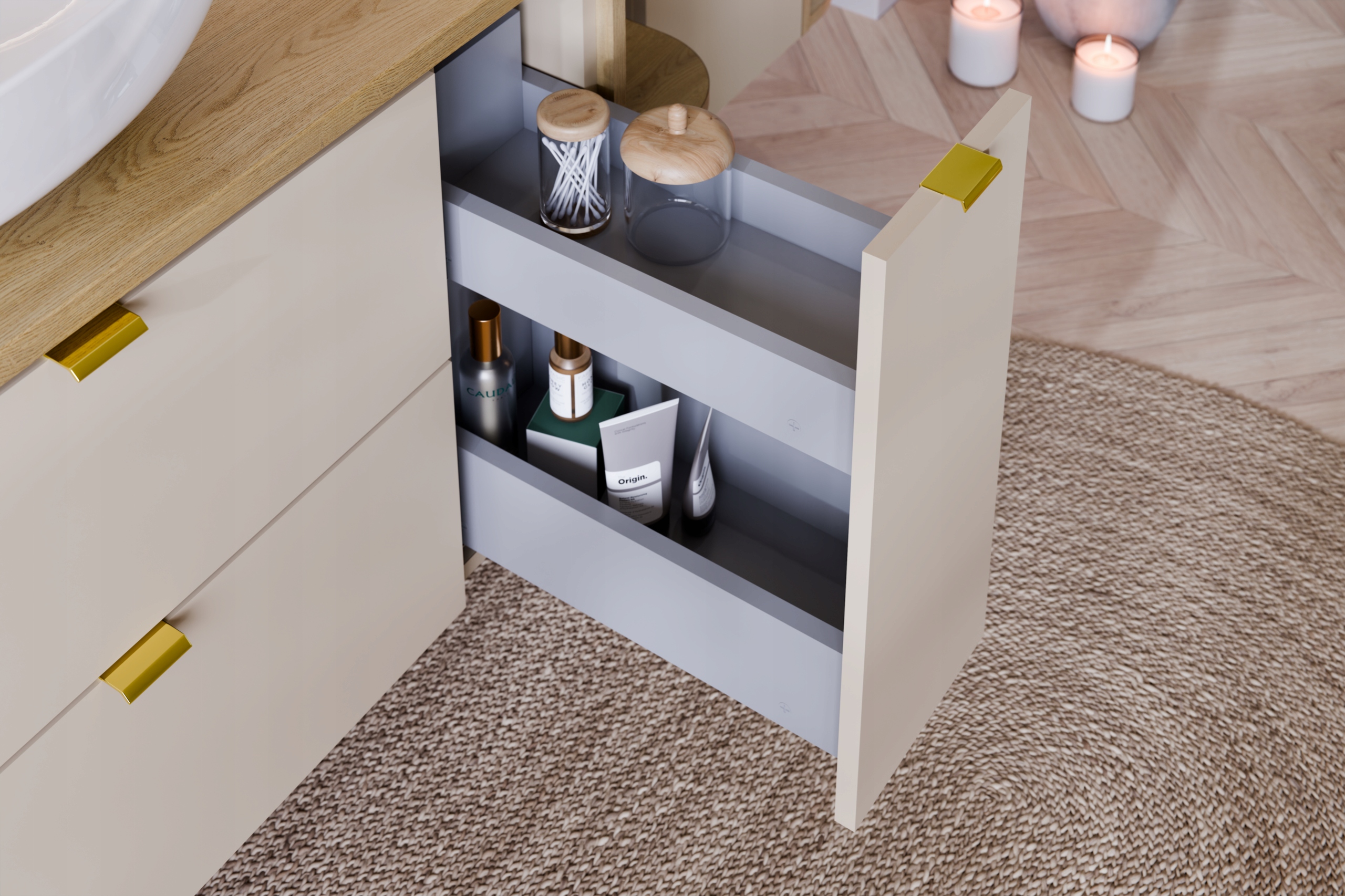 Zestaw składa się z szafki pod umywalkę o szerokości 60 cm oraz szafki cargo o szerokości 20 cm, połączonych blatem o długości 80,6 cm. Funkcjonalne wnętrza i przemyślana konstrukcja gwarantują wygodne przechowywanie niezbędnych akcesoriów, a szafka cargo umożliwia wygodny dostęp do kosmetyków dzięki systemowi wysuwanych koszy. Elementy są uniwersalne, dlatego cargo można zamontować z prawej lub lewej strony, dopasowując układ do wnętrza.