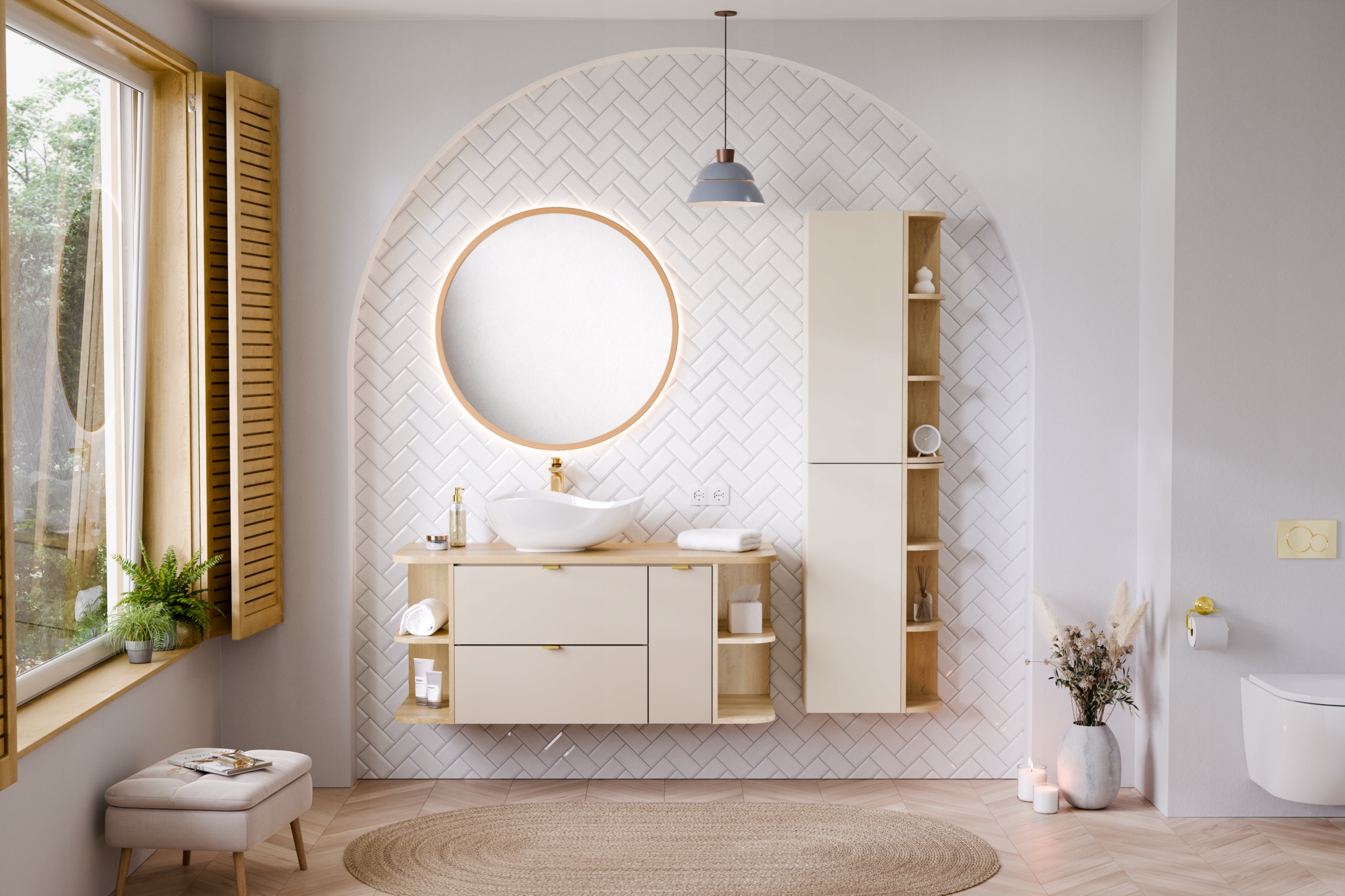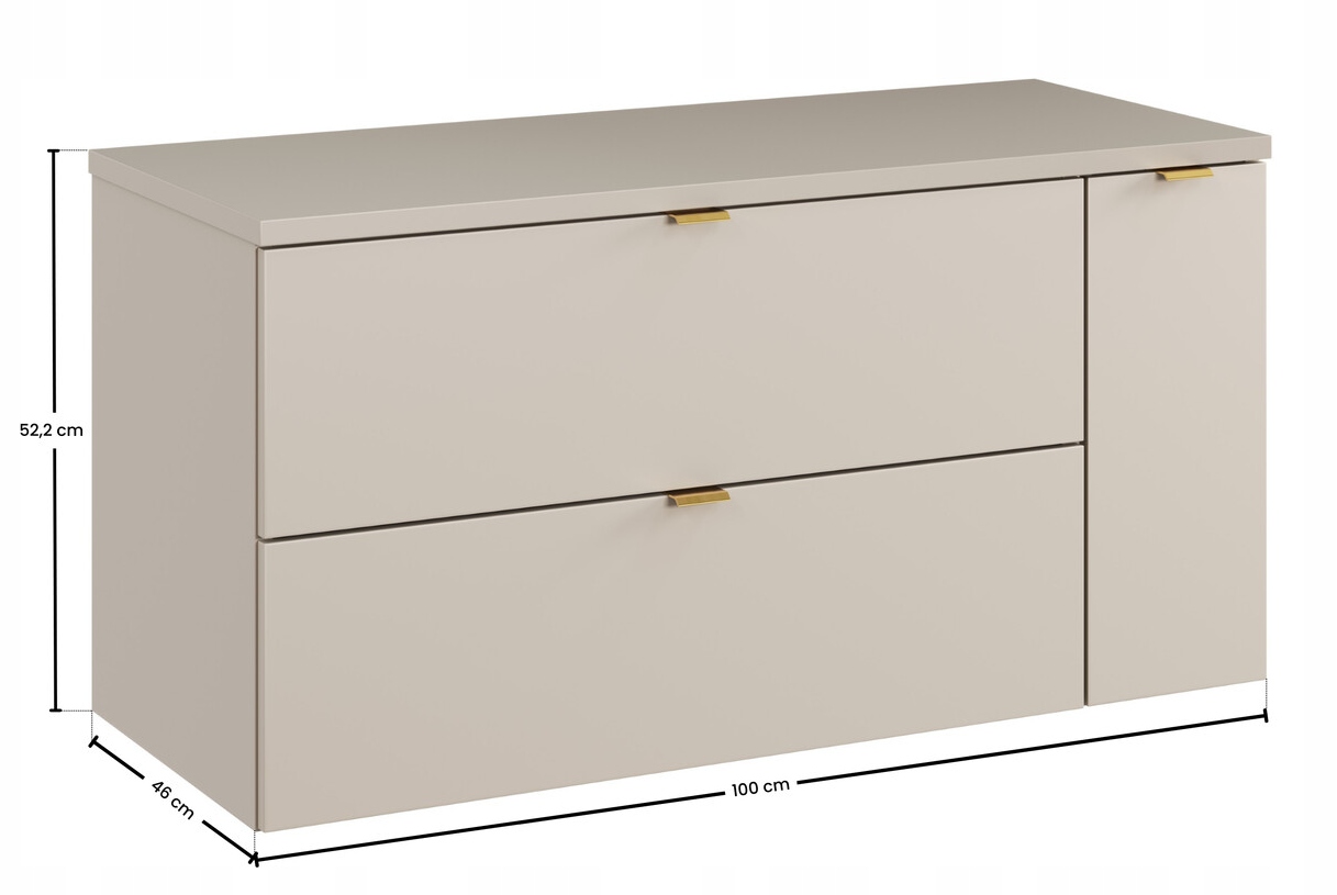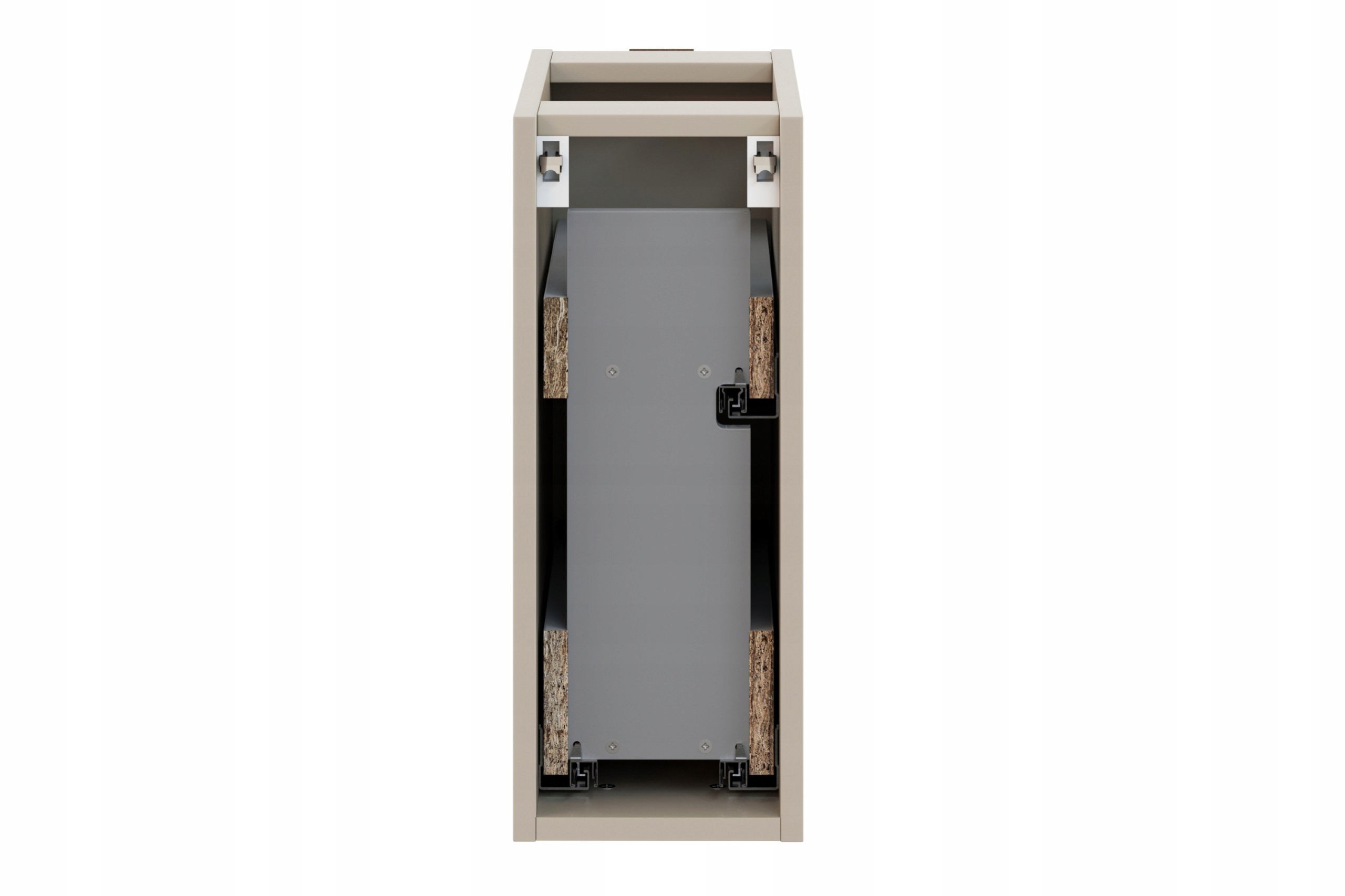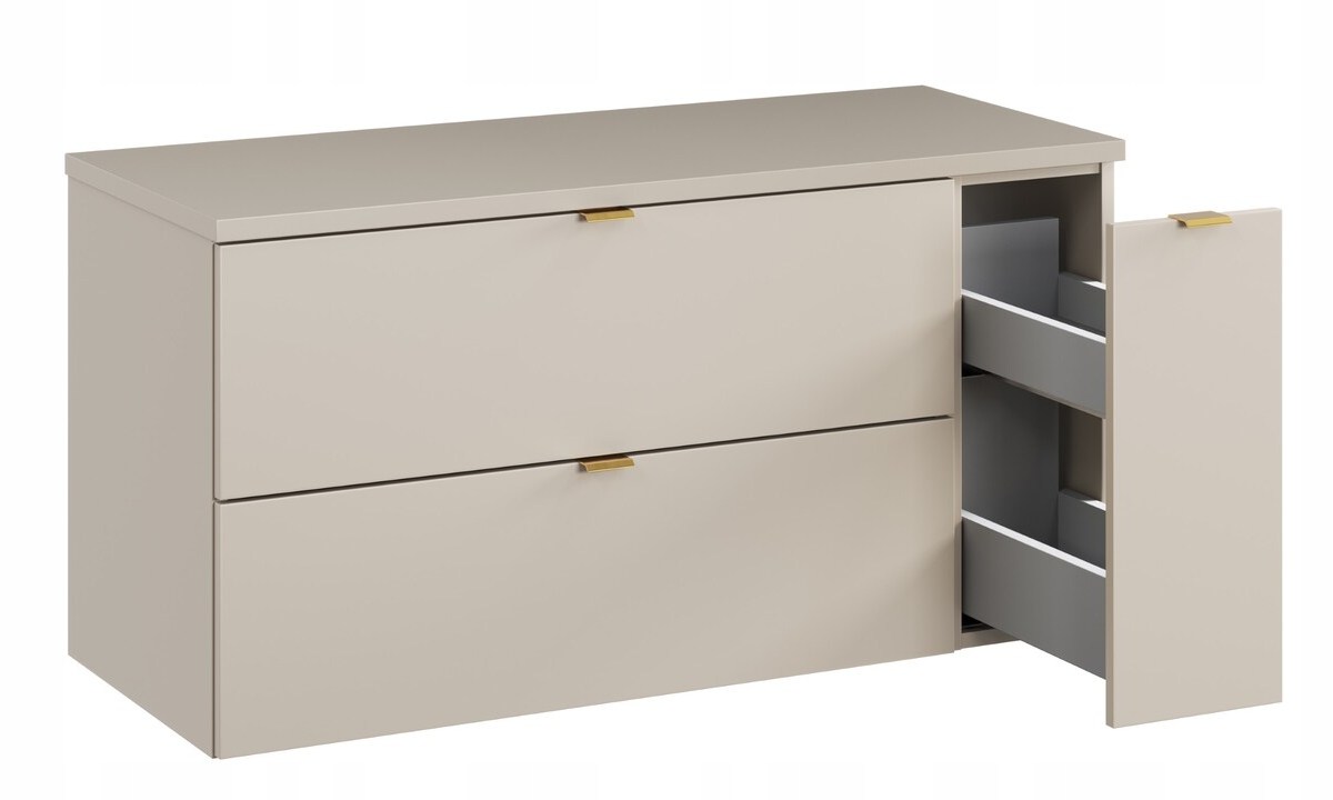 Zestaw o szerokości 100 cm składa się z szafki pod umywalkę o szerokości 80 cm oraz wąskiej szafki cargo o szerokości 20 cm, połączonych blatem w kolorze kaszmir mat. Szafka pod umywalkę zapewnia wygodną przestrzeń do przechowywania dzięki pojemnym szufladom z cichym domykaniem, natomiast cargo oferuje dwupoziomowy system wysuwany, który ułatwia uporządkowanie drobnych akcesoriów. Układ mebli można dowolnie konfigurować, ponieważ moduł cargo jest uniwersalny i może znajdować się po każdej stronie.