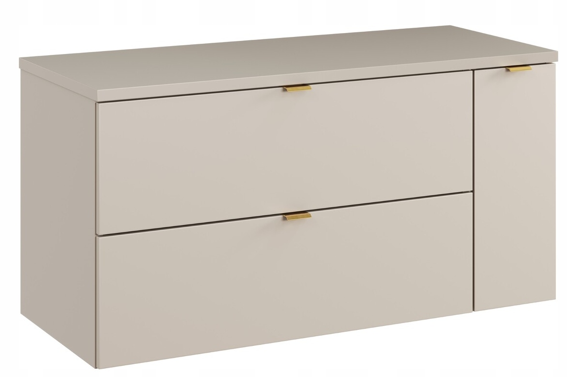 Korpusy i fronty wykonano z płyty laminowanej o grubości 16 mm w jednolitym kolorze kaszmir mat, natomiast blat powstał z trwałej płyty MDF laminowanej w tym samym odcieniu. W zestawie znajdują się trzy warianty uchwytów: złoty połysk, chrom połysk oraz czarny mat, co pozwala na pełne dopasowanie wyglądu mebla do stylu wnętrza. Całość przeznaczona jest do montażu wiszącego i została wyprodukowana w Polsce. BLAT W ZESTAWIE.