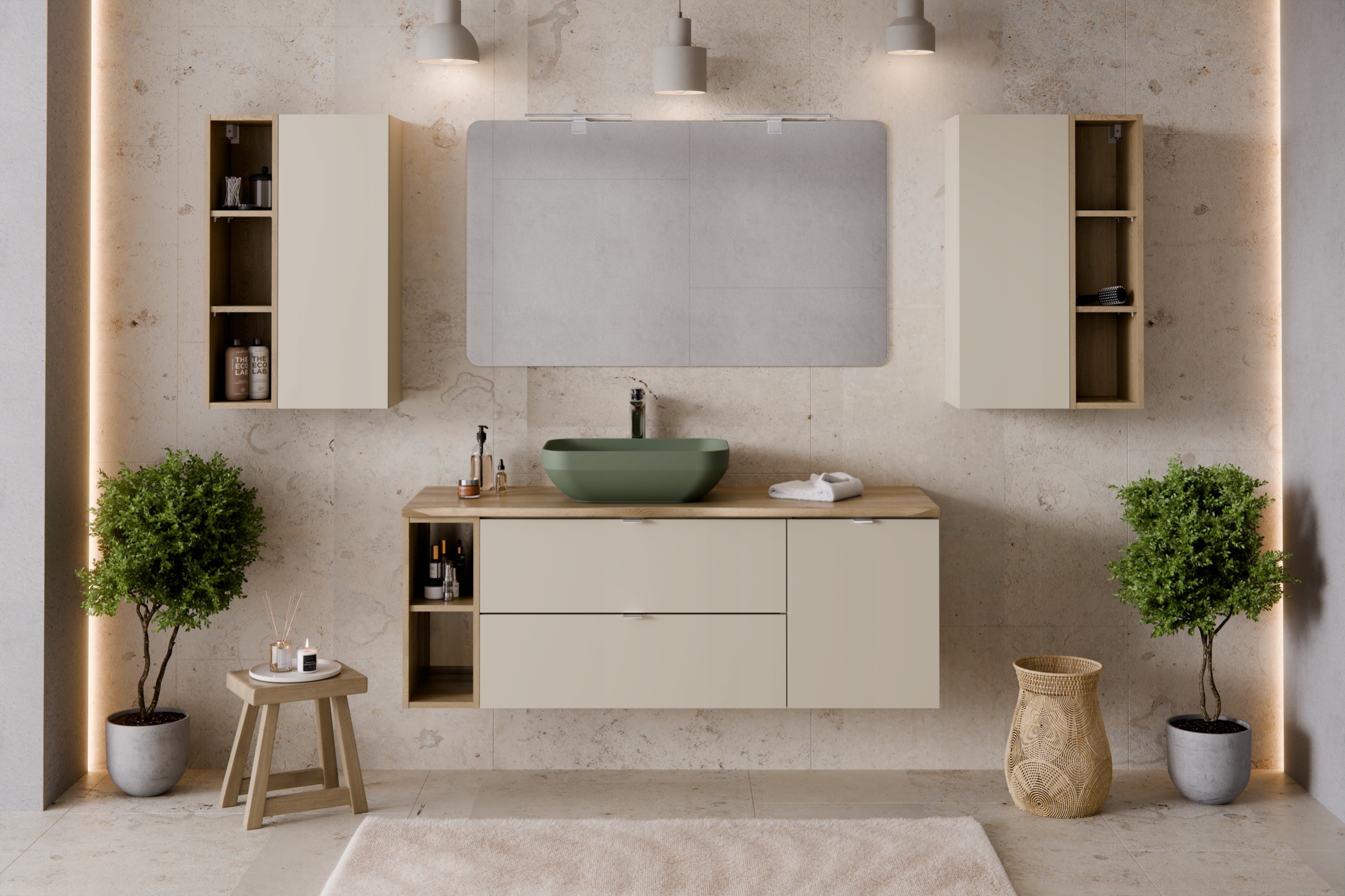 Korpusy i fronty wykonano z płyty laminowanej 16 mm w kolorze kaszmir mat, natomiast regał i blat powstały z materiałów w dekorze Dąb Cremona, wiernie odwzorowujących naturalną strukturę drewna. Całość tworzy lekką, nowoczesną zabudowę wiszącą, wykonaną z materiałów odpornych na wilgoć i łatwych do utrzymania w czystości. BLAT W ZESTAWIE.