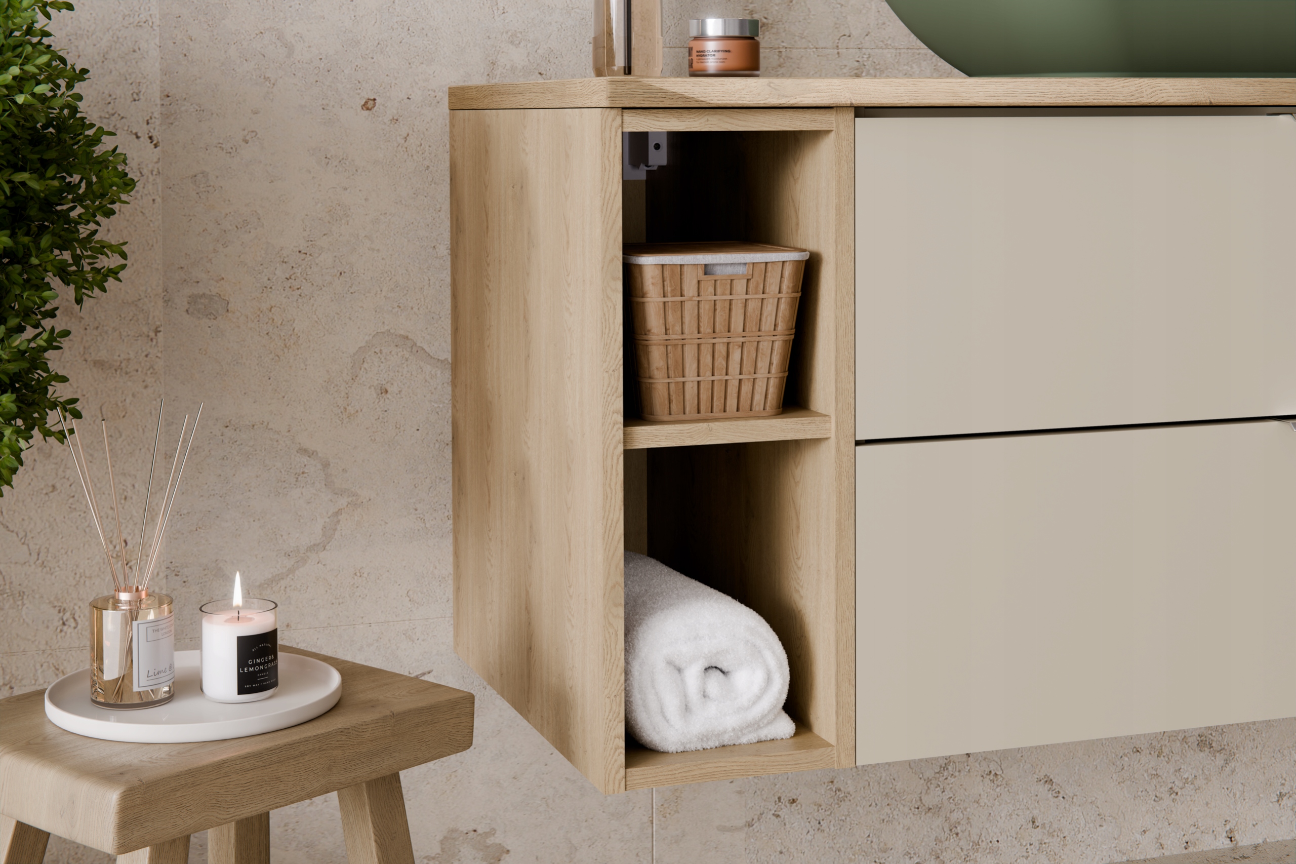 Kolekcja Dalia Cashmere łączy subtelny odcień kaszmiru z ciepłym dekorem Dąb Cremona, tworząc harmonijną i elegancką kompozycję do nowoczesnych wnętrz. Matowe wykończenie oraz prosta forma podkreślają minimalistyczny charakter zestawu, a naturalny akcent drewna wprowadza do łazienki atmosferę spokoju i przytulności. To połączenie, które świetnie sprawdzi się zarówno w małych, jak i większych pomieszczeniach, nadając im lekkości i stylu.