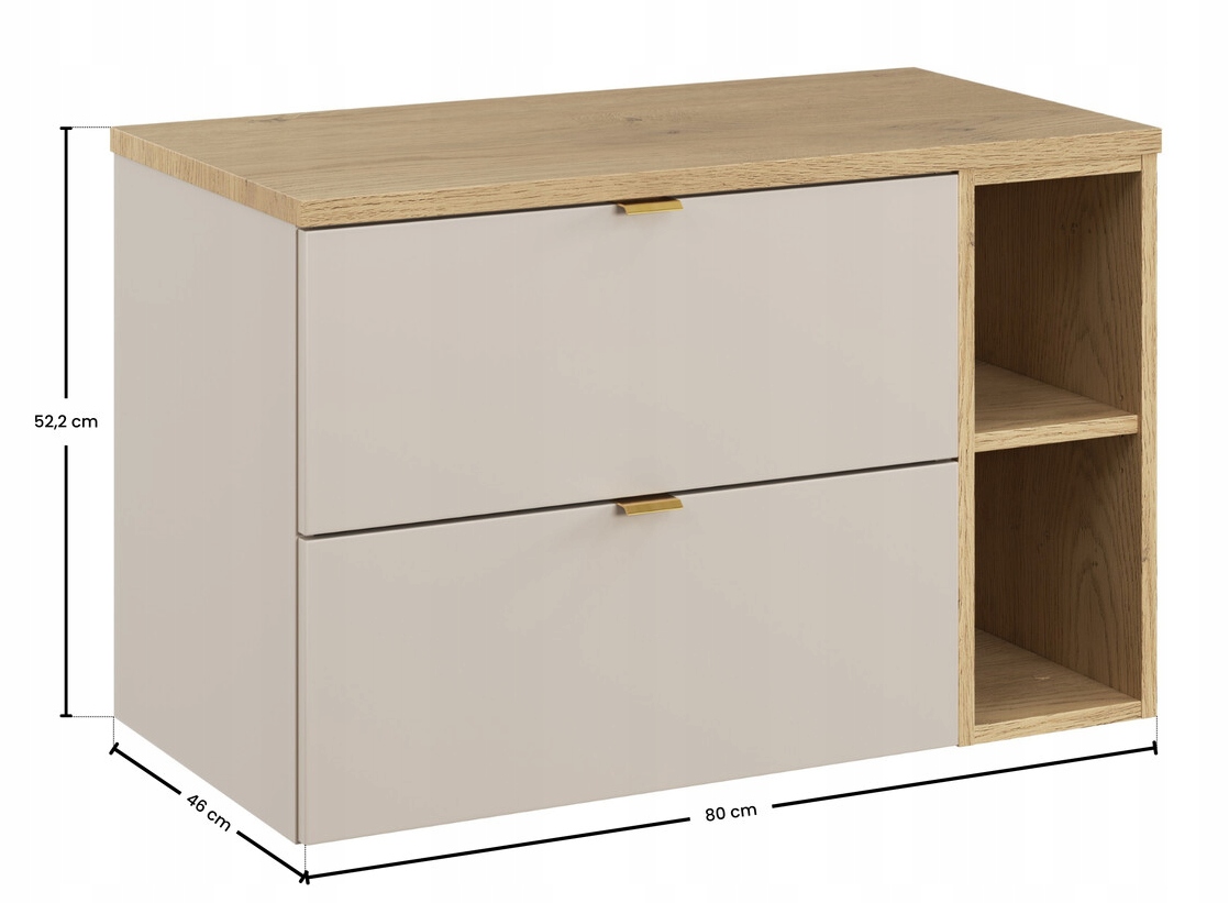 Zestaw składa się z szafki pod umywalkę o szerokości 60 cm oraz otwartego regału o szerokości 20 cm, połączonych blatem w dekorze Dąb Cremona o długości 80 cm. Szafka zapewnia wygodną przestrzeń do przechowywania, natomiast regał z dwiema otwartymi półkami jest praktycznym miejscem na ręczniki, kosmetyki lub dekoracje. Oba moduły są uniwersalne, dzięki czemu regał można zamontować po dowolnej stronie, dopasowując układ do indywidualnej przestrzeni.