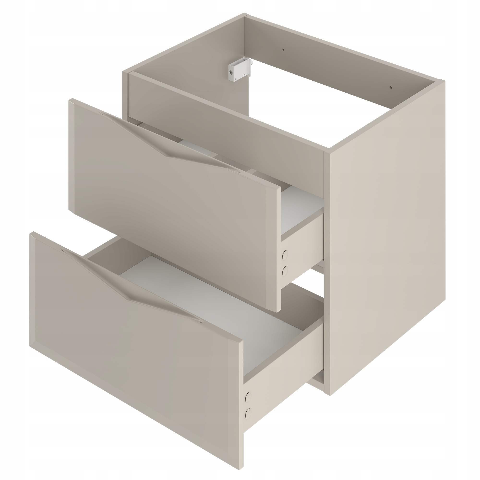 Model o szerokości 60 cm został wyposażony w dwie pojemne szuflady z prowadnicami dolnego montażu i systemem cichego domykania, co zapewnia codzienny komfort użytkowania. Całość uzupełnia blat w kolorze kaszmir, który nadaje bryle spójny wygląd i harmonijnie komponuje się z resztą konstrukcji. Wisząca forma dodaje meblowi lekkości i ułatwia utrzymanie czystości w łazience.
