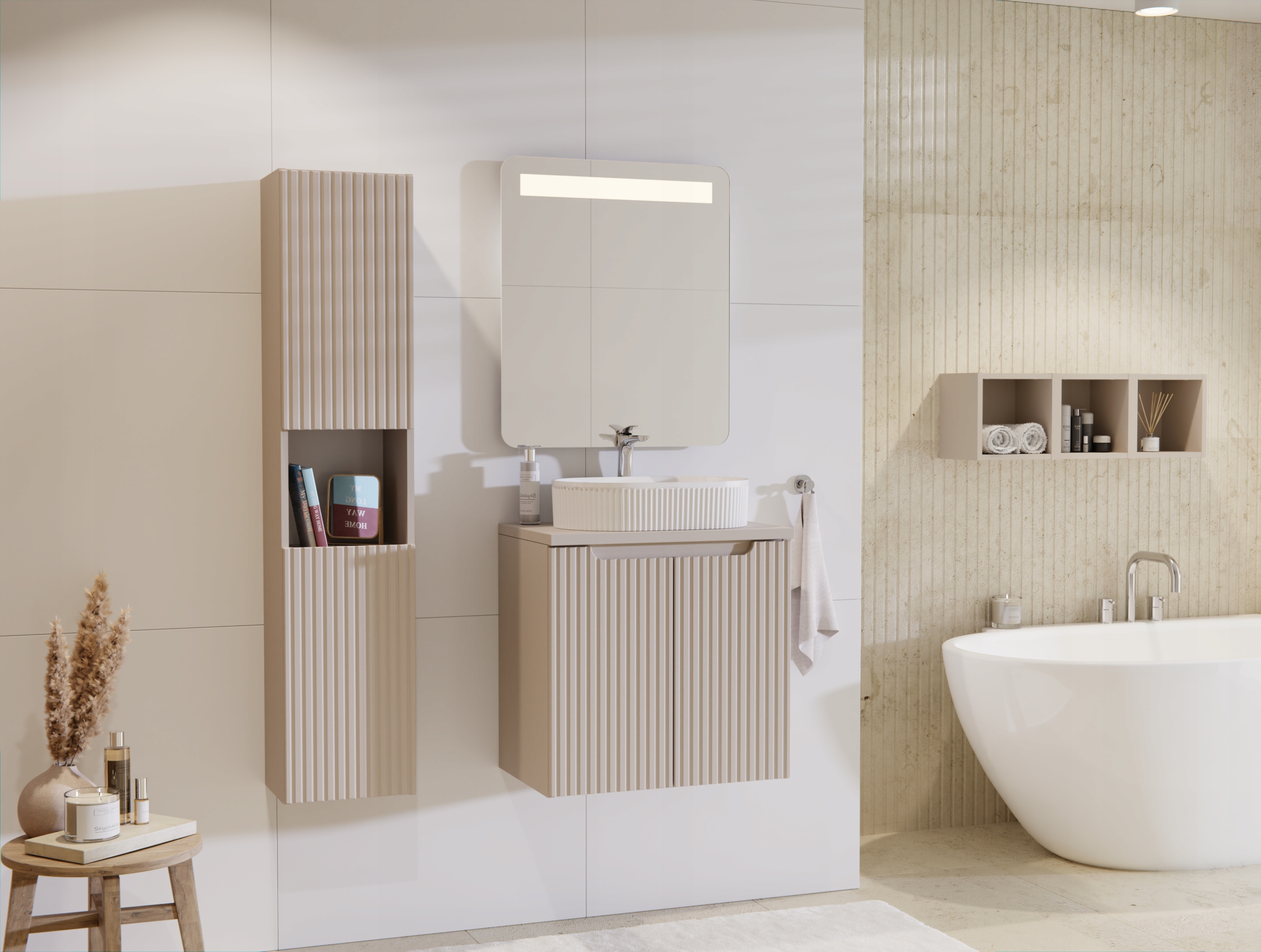 Kolekcja NOVA CASHMERE to eleganckie połączenie kaszmirowego matu z naturalnym dekorem Dąb Coast Evoke. Charakterystyczne pionowe ryflowania frontów oraz zintegrowane podchwyty nadają meblom nowoczesny i ponadczasowy charakter. To rozwiązanie idealne do większych łazienek oraz przestrzeni dla dwóch użytkowników.