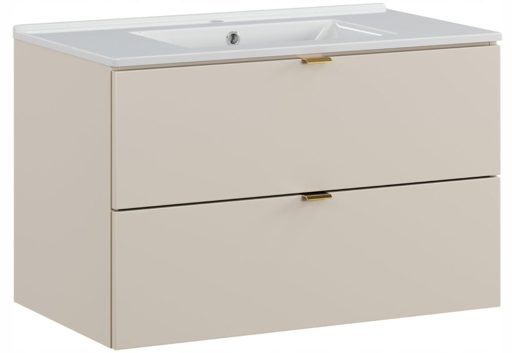 Szafka łazienkowa DALIA 80 cm w eleganckim kolorze kaszmiru z dopasowanym blatem w tym samym odcieniu to idealne połączenie nowoczesnego designu, funkcjonalności i subtelnej estetyki. Jej minimalistyczna forma oraz gładkie, matowe fronty sprawiają, że doskonale wpisuje się w aktualne trendy wnętrzarskie, tworząc harmonijną i spójną całość z pozostałymi elementami wyposażenia łazienki.