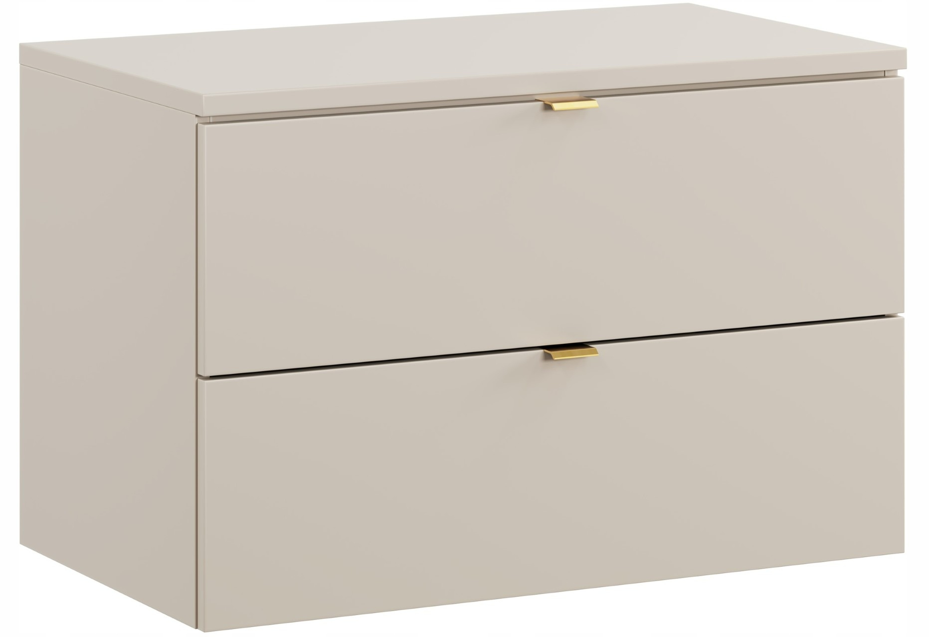 Szafka została wyposażona w dwie pojemne szuflady, które umożliwiają wygodne przechowywanie kosmetyków, ręczników i wszystkich niezbędnych akcesoriów łazienkowych. System cichego i płynnego domykania (SOFT CLOSE) zapewnia wysoki komfort użytkowania, chroniąc mebel przed przypadkowymi uszkodzeniami i podkreślając jego solidne wykonanie. Blat w kolorze kaszmiru tworzy z korpusem spójną powierzchnię, która prezentuje się wyjątkowo elegancko i nowocześnie, stanowiąc doskonałą bazę pod umywalkę nablatową.