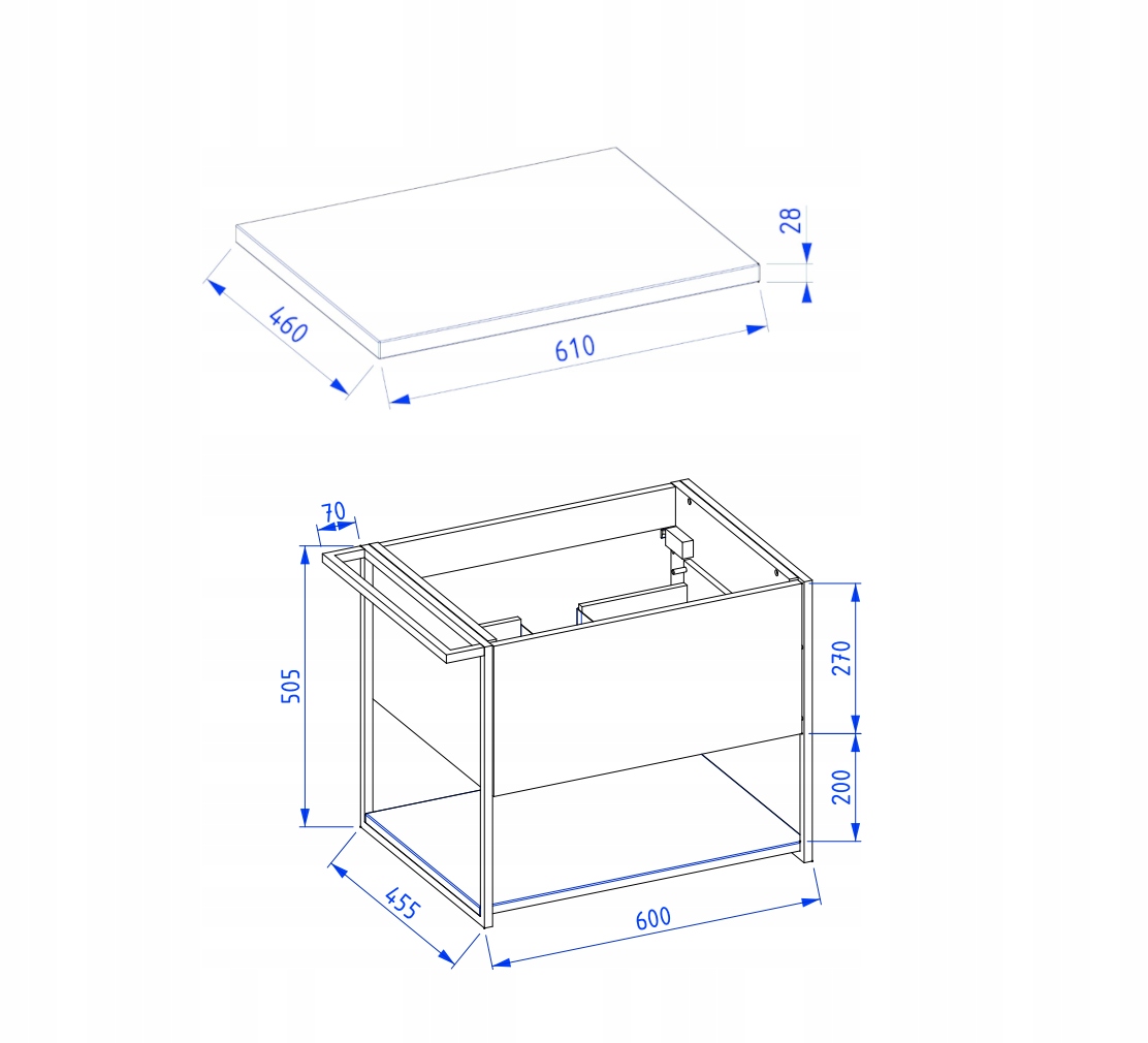 Do zestawu dołączony jest blat z litego drewna dębowego o szerokości 61 cm, głębokości 46 cm i grubości 2,8 cm. Powierzchnia blatu została zabezpieczona lakierem UV, dzięki czemu jest odporna na wilgoć i uszkodzenia. Całkowita wysokość szafki to 50,5 cm, głębokość 45,5 cm. Metalowy wieszak (7 cm szerokości) można zamontować z lewej lub prawej strony, w zależności od indywidualnych potrzeb.