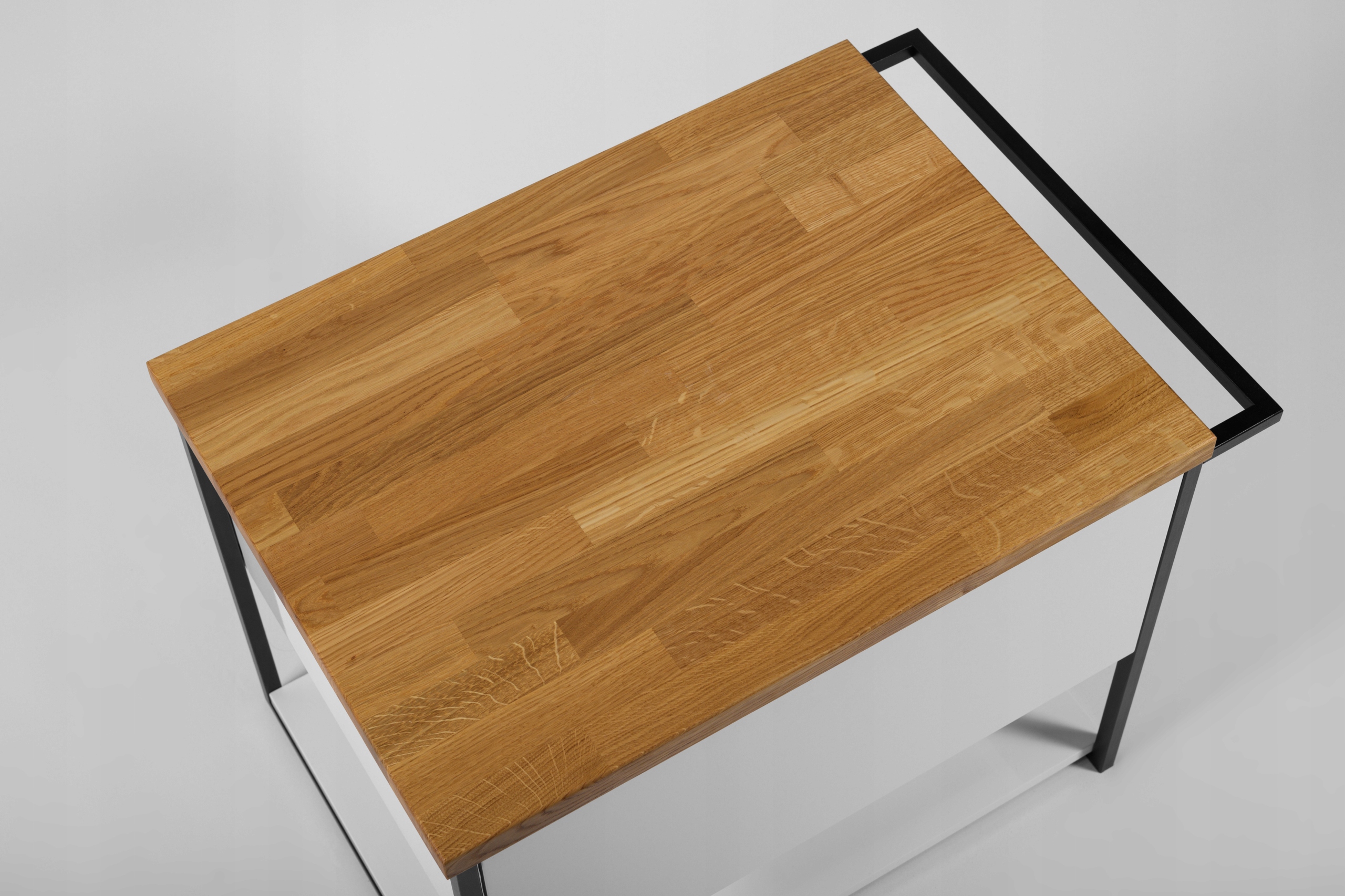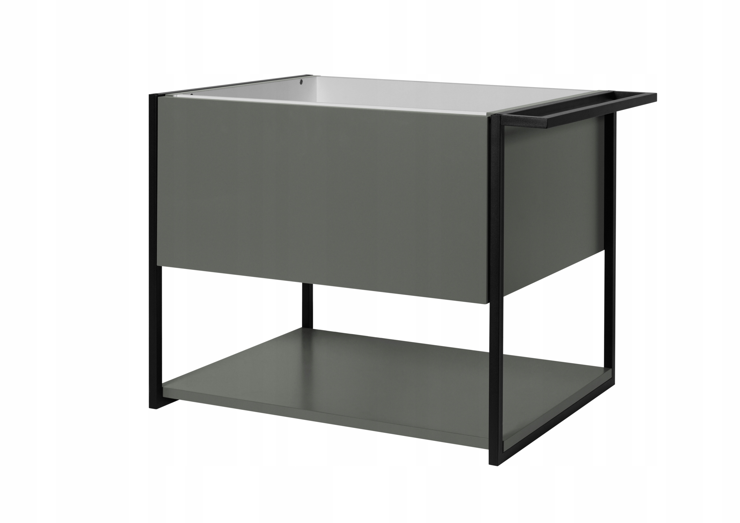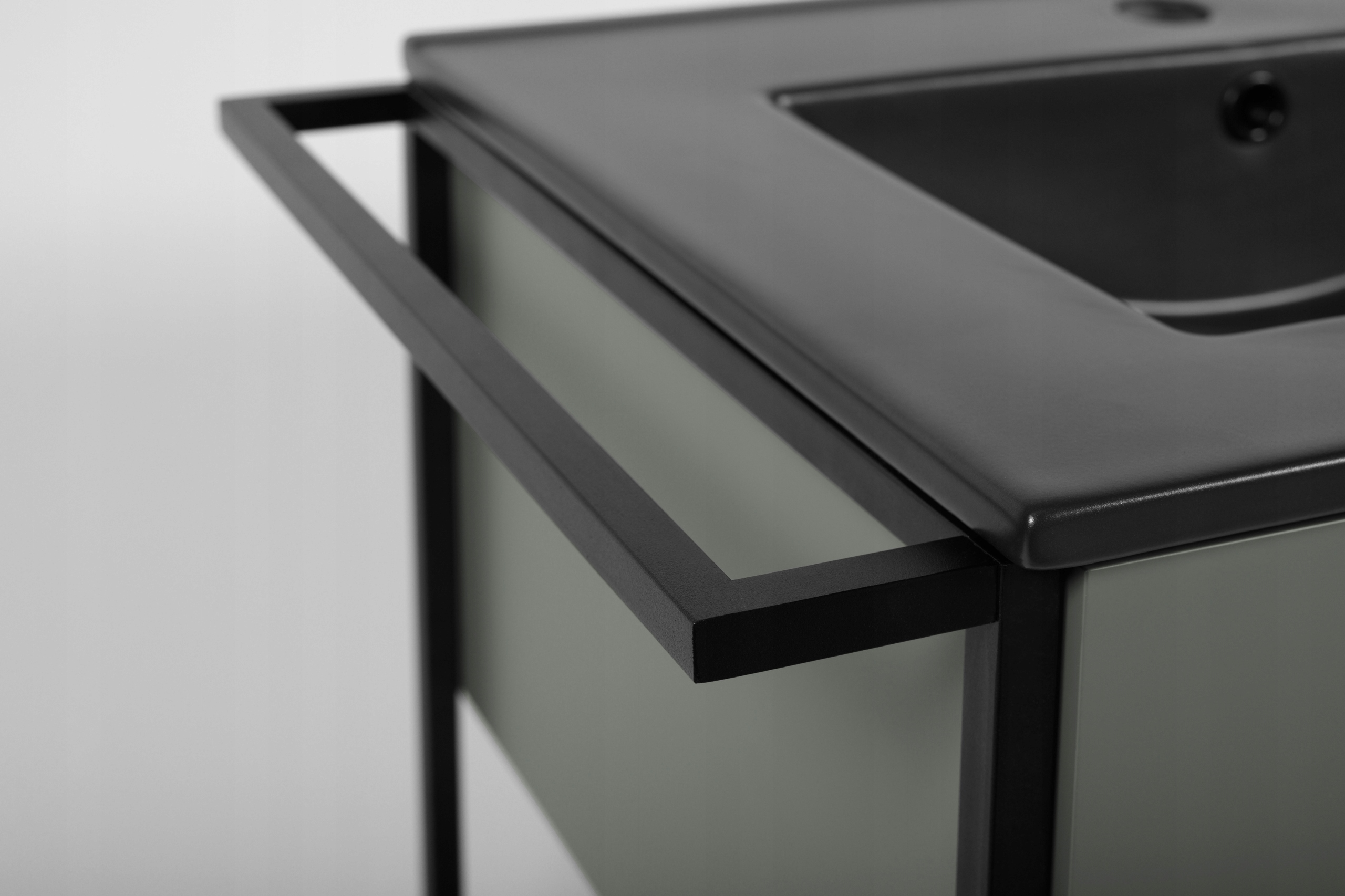 Korpus i front zostały wykonane z lakierowanej płyty laminowanej, odpornej na wilgoć. Czarne ramy boczne z profilu stalowego 15 x 15 mm dodają całości charakteru. Szuflada o pełnym wysuwie wyposażona została w prowadnice Hettich Quadro oraz bezuchwytowy system push-to-open, który ułatwia dostęp do wnętrza. Funkcjonalność mebla podnosi metalowy organizer oraz dolna, otwarta półka, idealna na ręczniki lub dekoracyjne pojemniki.