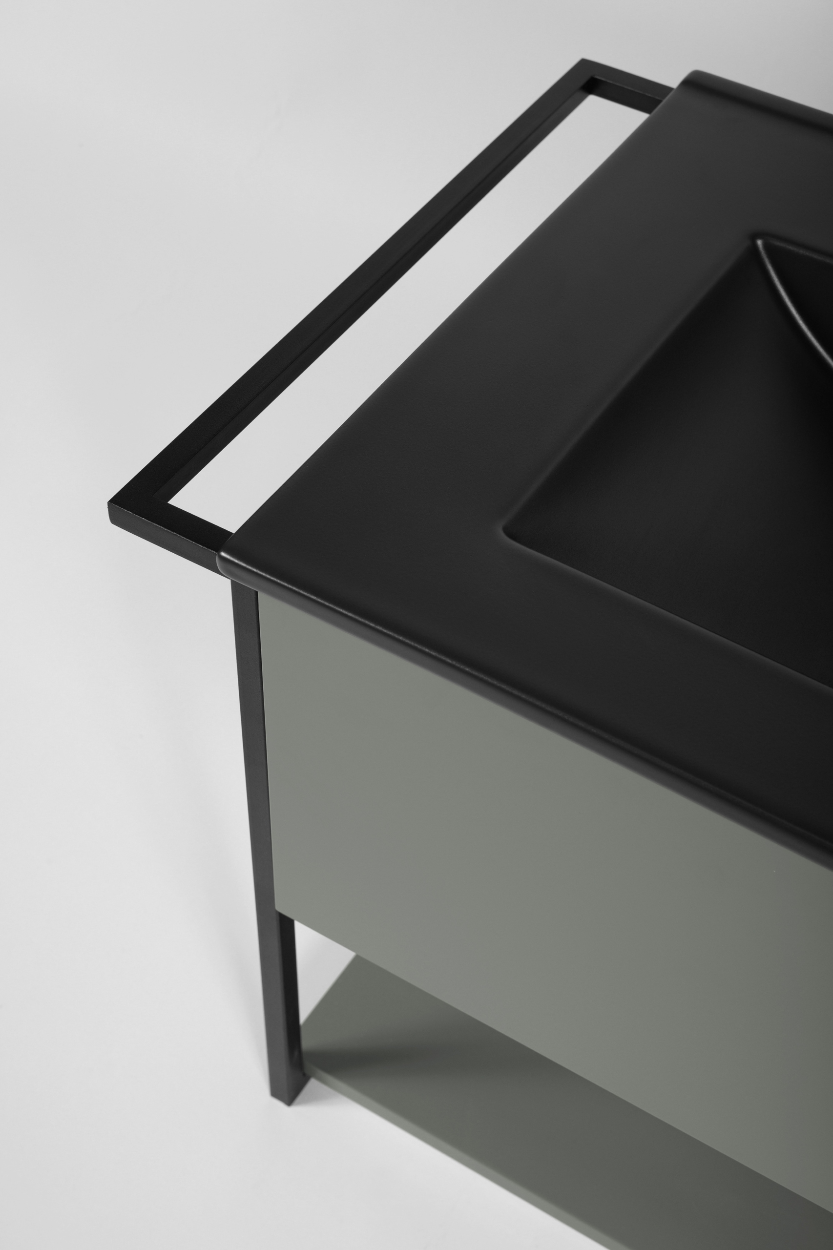 Front i korpus zostały wykonane z lakierowanej płyty laminowanej, co zapewnia trwałość oraz odporność na wilgoć. Akcentem industrialnym są czarne metalowe ramy boczne z profilu 15 x 15 mm – malowane proszkowo, idealnie kontrastują z zielonym kolorem bryły. Mebel wyposażono w przestronną szufladę z prowadnicami Hettich Quadro i systemem push-to-open, a wewnętrzny metalowy organizer pozwala utrzymać porządek w kosmetykach. Otwarta dolna półka doskonale sprawdza się jako miejsce na ręczniki lub pojemniki.