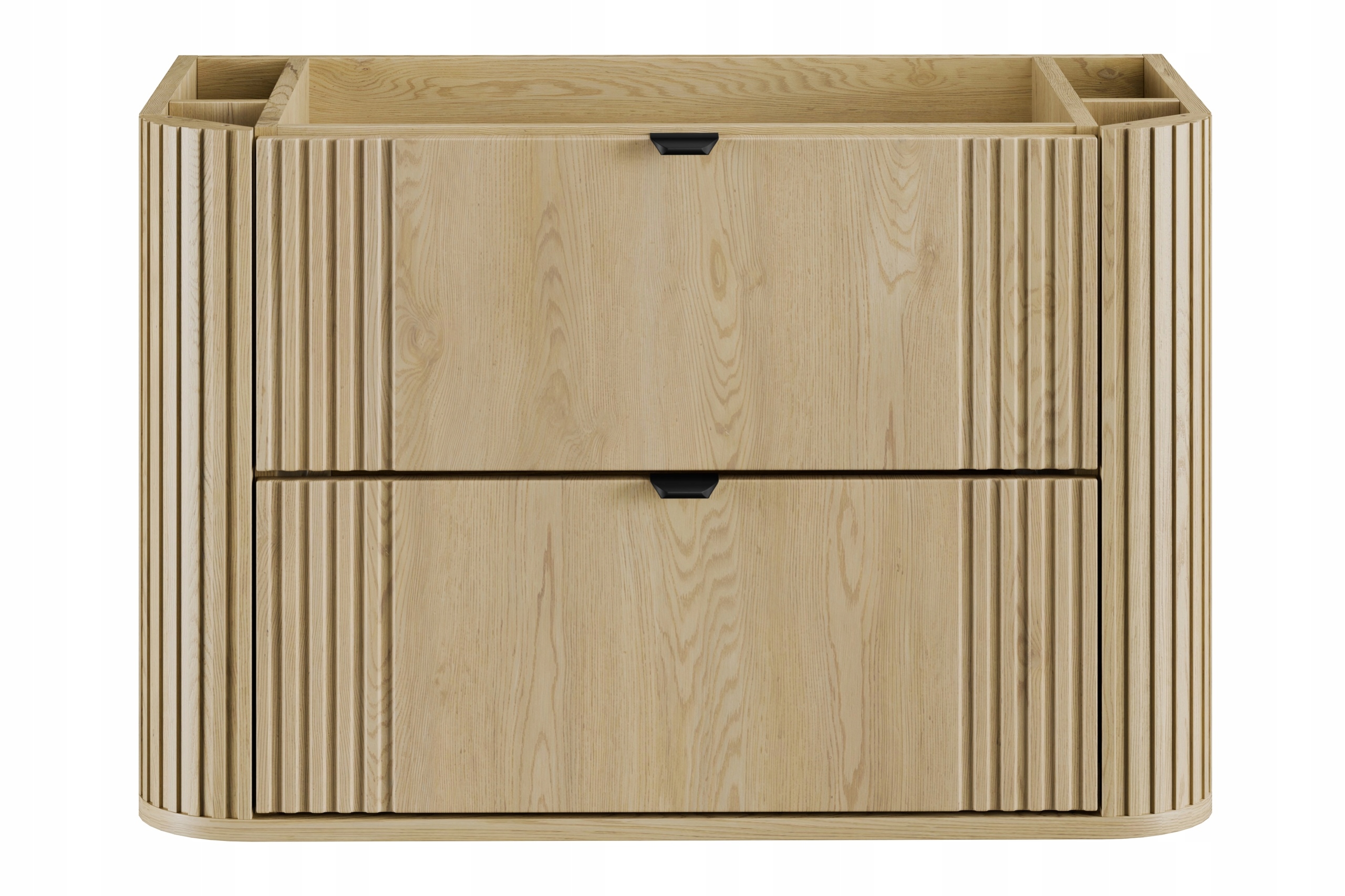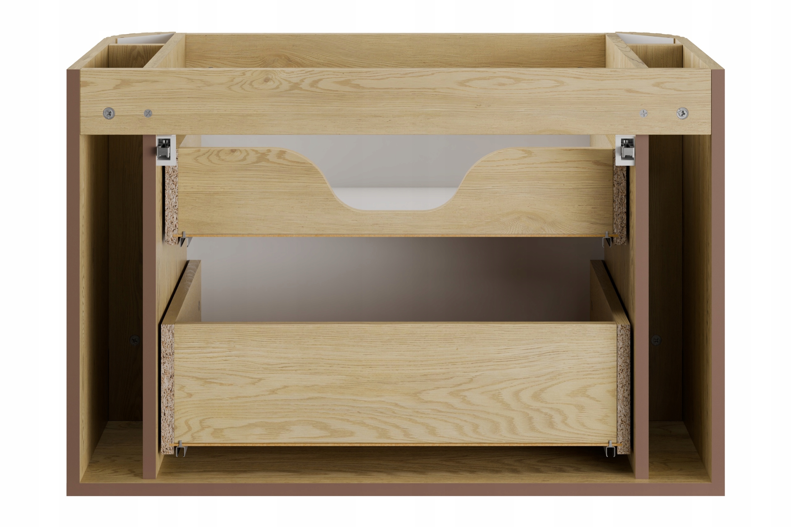 Kolekcja OVALIA CREMONA to harmonijne połączenie naturalnego piękna z nowoczesną formą. Szafka łazienkowa o szerokości 80 cm wyróżnia się frezowanymi frontami oraz zaokrąglonymi narożnikami, które nadają bryle miękki, elegancki charakter. Ciepły dekor dąb Cremona wnosi do wnętrza przytulność i spójność aranżacyjną, natomiast czarne uchwyty krawędziowe z metalu dodają kontrastu i nowoczesnego wyrazu. Model został wyposażony w dwie pojemne szuflady z systemem cichego domyku oraz dopasowany blat z MDF-u w tym samym kolorze. Do zestawu dołączona jest również nablatowa umywalka ceramiczna CLOUD o delikatnie zaokrąglonej formie, która świetnie komponuje się z łagodnymi liniami mebla. Szafka jest przeznaczona do montażu wiszącego, co podkreśla jej lekkość i ułatwia utrzymanie czystości. Całość wykonana została w Polsce, z certyfikowanych materiałów o wysokiej trwałości.
