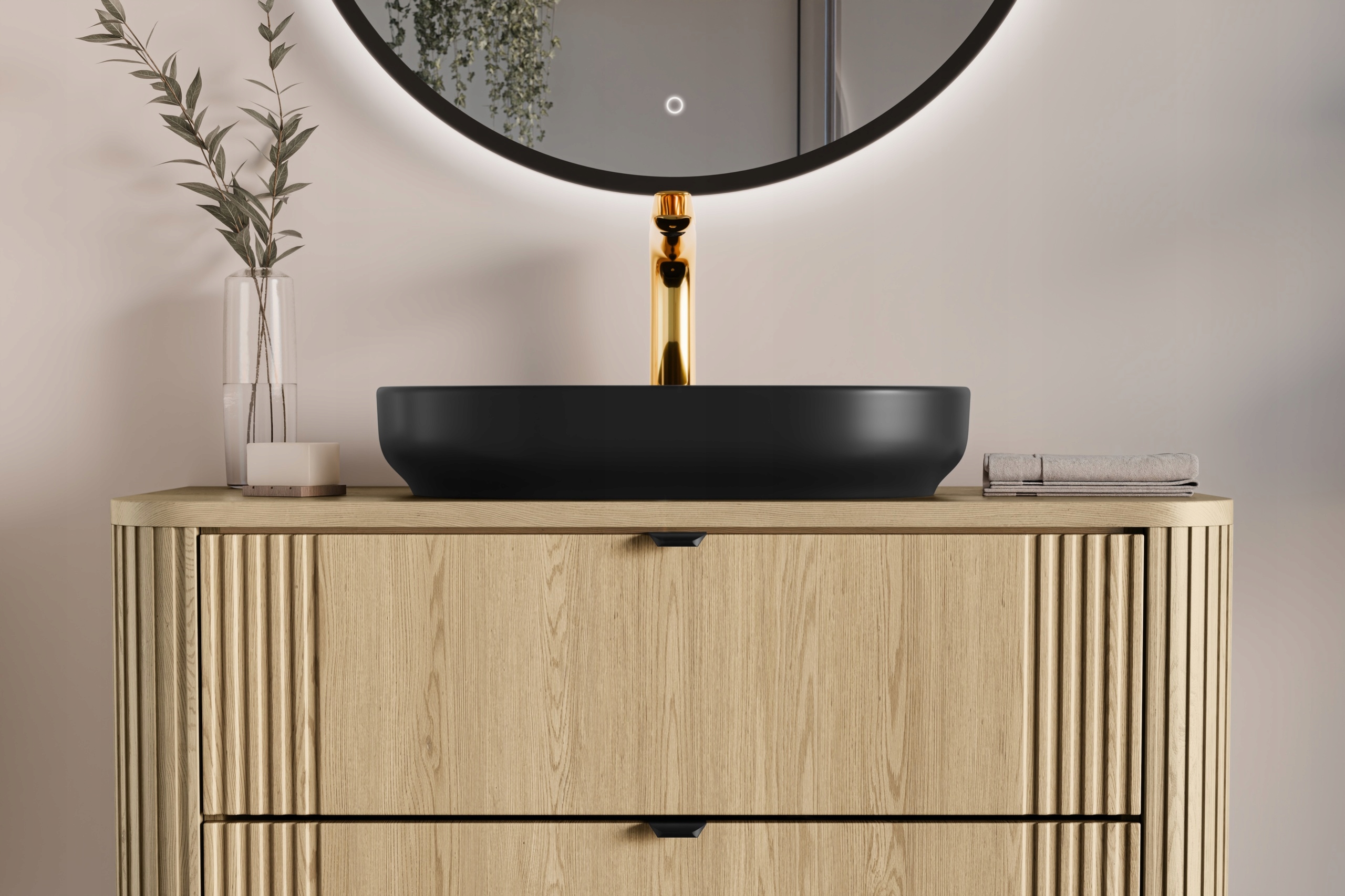 Kolekcja OVALIA CREMONA to nowoczesna propozycja inspirowana naturalnym pięknem drewna, w której elegancja spotyka się z funkcjonalnością. Szafka łazienkowa o szerokości 100 cm wyróżnia się efektownymi frezowaniami na frontach i zaokrąglonymi narożnikami, które nadają bryle harmonijny i miękki wygląd. Ciepły dekor dąb Cremona doskonale oddaje strukturę drewna, wprowadzając do łazienki przytulność, natomiast czarne, metalowe uchwyty krawędziowe tworzą nowoczesny kontrapunkt. Model wyposażony jest w dwie pojemne szuflady z systemem cichego domykania oraz blat z MDF-u, który stanowi solidną i estetyczną bazę pod umywalkę nablatową. Konstrukcja wisząca nadaje meblowi lekkości i pozwala na łatwe utrzymanie porządku w strefie umywalkowej. Całość wykonana z trwałych, certyfikowanych materiałów gwarantuje nie tylko estetykę, ale również odporność na codzienne użytkowanie. Mebel został wyprodukowany w Polsce z dbałością o każdy detal.