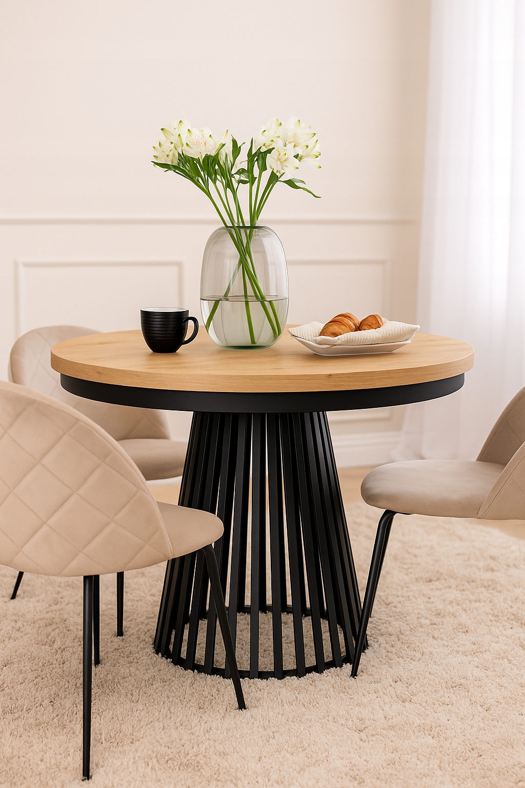 Stół rozkładany LAMELLA z blatem w dekorze dąb artisan i czarną, metalową podstawą to doskonałe połączenie ciepłego, naturalnego wykończenia z nowoczesną formą. W wersji złożonej zapewnia komfortową przestrzeń dla czterech osób, a dzięki dwóm dodatkowym wkładkom pozwala przedłużyć blat do stu osiemdziesięciu centymetrów. Takie rozwiązanie doskonale sprawdzi się przy rodzinnych spotkaniach i większych przyjęciach. Blat wykonany został z trwałej płyty laminowanej o grubości trzydziestu dwóch milimetrów z wyraźną strukturą drewna, co nadaje mu realistyczny i przytulny wygląd. Obrzeża wykończono odpornym tworzywem ABS, co gwarantuje trwałość i estetykę przez długi czas. Stół wyposażono w prowadnice szynowe renomowanej marki Pöttker, które umożliwiają szybkie i płynne rozkładanie blatu bez użycia siły. Stabilność konstrukcji wzmacnia metalowa obręcz umieszczona pod blatem. Najbardziej wyróżniającym się elementem modelu LAMELLA jest jego podstawa – wykonana z pionowych, stalowych lameli malowanych proszkowo, które tworzą efektowny okrągły kształt. To unikalne połączenie funkcjonalności i designu, które przyciąga wzrok i nadaje wnętrzu charakteru. Wkładki należy przechowywać osobno. Ten model stołu produkowany jest w Polsce i doskonale odnajdzie się w nowoczesnych wnętrzach, jadalniach oraz otwartych strefach dziennych.