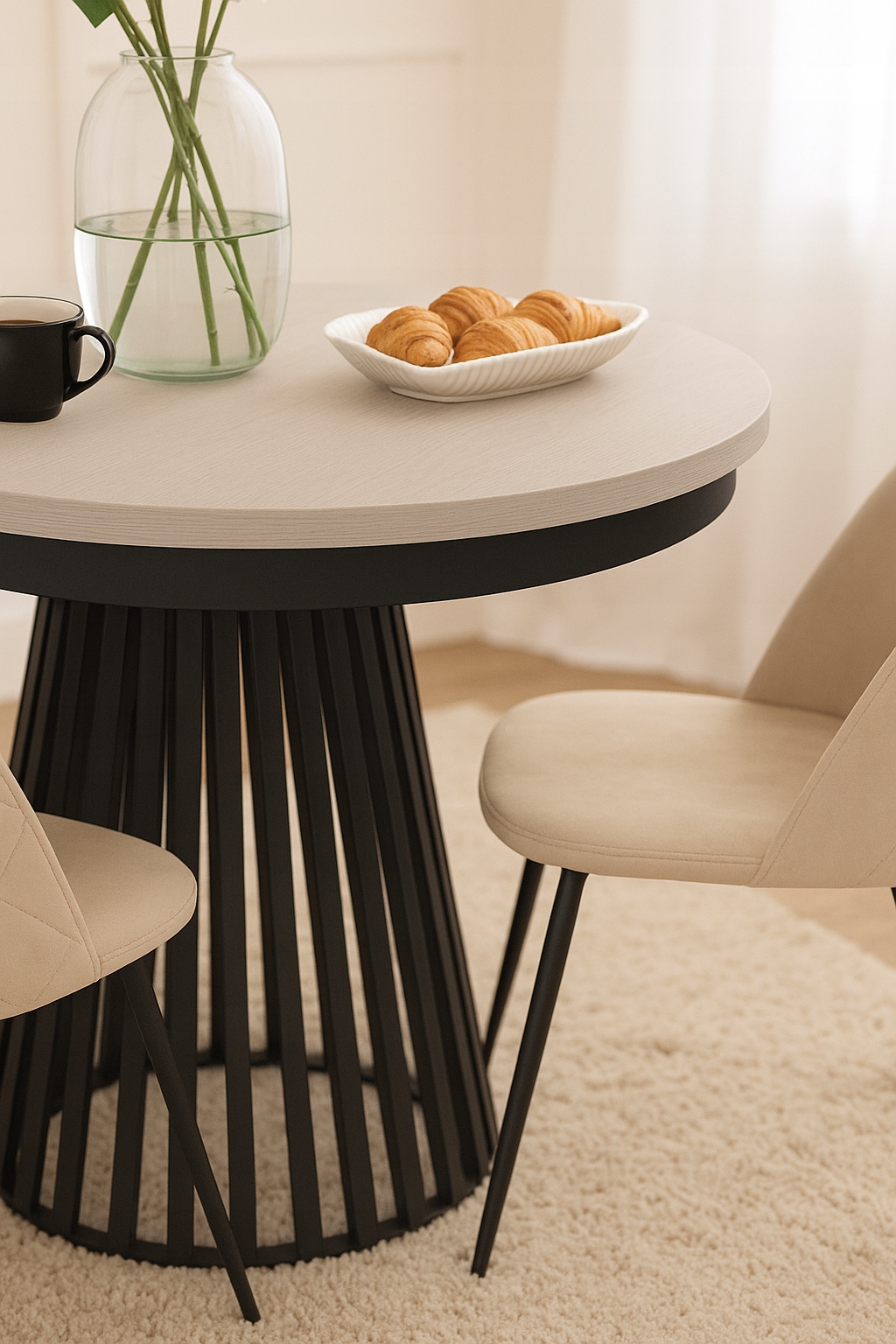 Stół rozkładany LAMELLA z blatem w odcieniu kaszmiru i czarną metalową podstawą to połączenie ponadczasowej elegancji z funkcjonalnością, które idealnie wpisuje się w estetykę nowoczesnych wnętrz. Okrągły blat w wersji złożonej zapewnia komfortowe miejsce dla czterech osób, a dzięki dwóm wkładkom o długości czterdziestu centymetrów można łatwo zwiększyć jego powierzchnię nawet do stu osiemdziesięciu centymetrów. To idealne rozwiązanie na co dzień i od święta – do kuchni, jadalni czy salonu z otwartą przestrzenią dzienną. Blat o grubości trzydziestu dwóch milimetrów został wykonany z płyty laminowanej i wykończony trwałym obrzeżem ABS, co gwarantuje wysoką odporność na uszkodzenia. System rozkładania oparty na szynowych prowadnicach marki Pöttker umożliwia płynną i wygodną obsługę, bez konieczności stosowania dodatkowych podpór. Wyjątkową cechą stołu jest czarna, metalowa podstawa w formie pionowych lameli, tworzących stabilną i przyciągającą wzrok konstrukcję. Kolor kaszmirowy nadaje meblowi subtelności, a kontrastująca czarna podstawa podkreśla jego nowoczesny charakter. Wkładki do rozkładania przechowuje się osobno. Stół został wyprodukowany w Polsce.