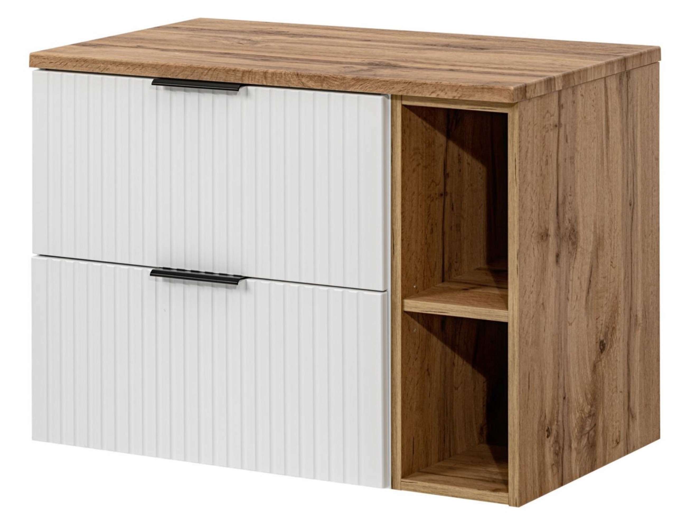 Zestaw łazienkowy z kolekcji ADEL WHITE łączy nowoczesny design z funkcjonalnością. Szafka pod umywalkę z dwoma pojemnymi szufladami, wyposażona w system SOFT CLOSE, zapewnia ciche i komfortowe użytkowanie, a ryflowane fronty dodają meblowi elegancji. W komplecie znajduje się również praktyczny regał w kolorze Dąb Wotan, który wprowadza ciepły, naturalny akcent do wnętrza, zapewniając dodatkową przestrzeń do przechowywania.