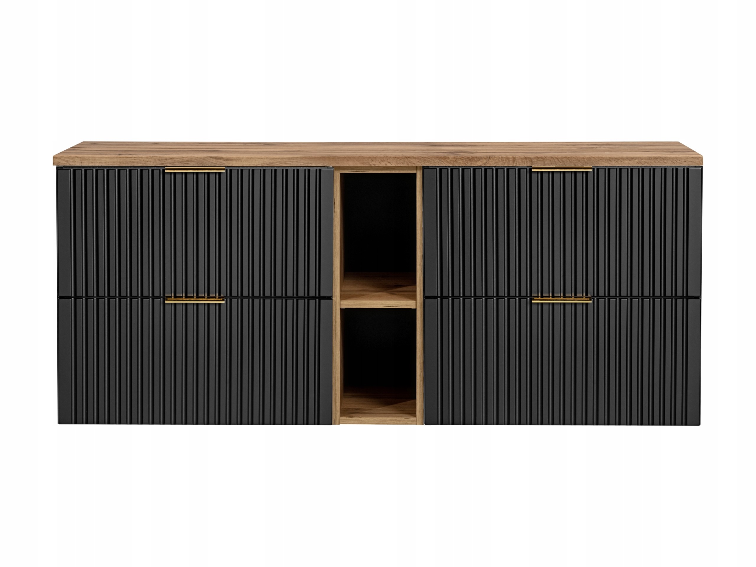 Blat w dekorze dąb wotan nadaje całości eleganckiego charakteru i tworzy stylowy kontrast z czarnymi frontami, podkreślając nowoczesny wygląd zestawu.