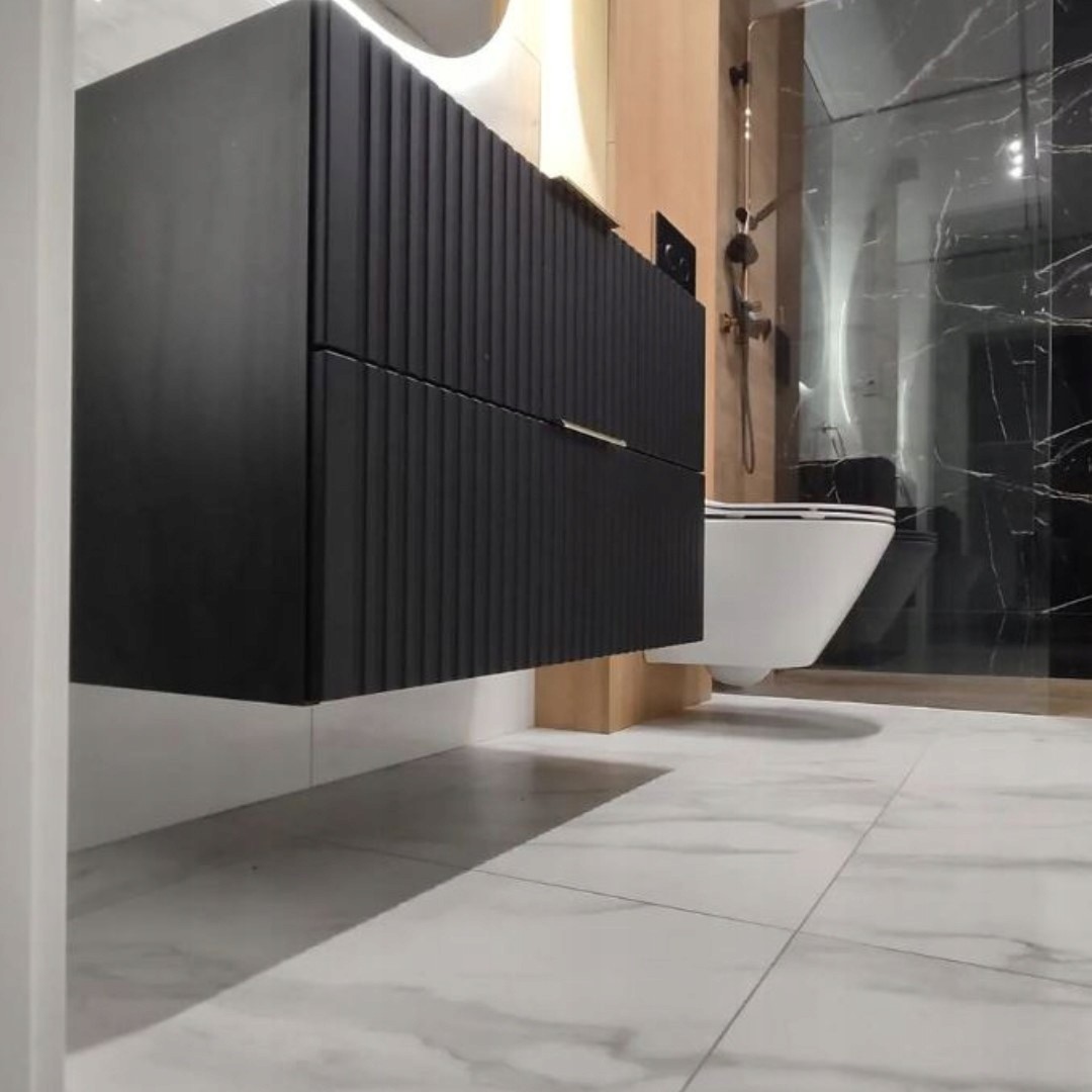 Szafka łazienkowa ADEL BLACK to elegancka propozycja, która wprowadza nowoczesny styl i funkcjonalność do każdej łazienki. Ryflowane fronty szuflad w połączeniu z czarnym, matowym wykończeniem tworzą wyjątkowy design, idealnie komponujący się zarówno w minimalistycznych, jak i bardziej klasycznych wnętrzach.