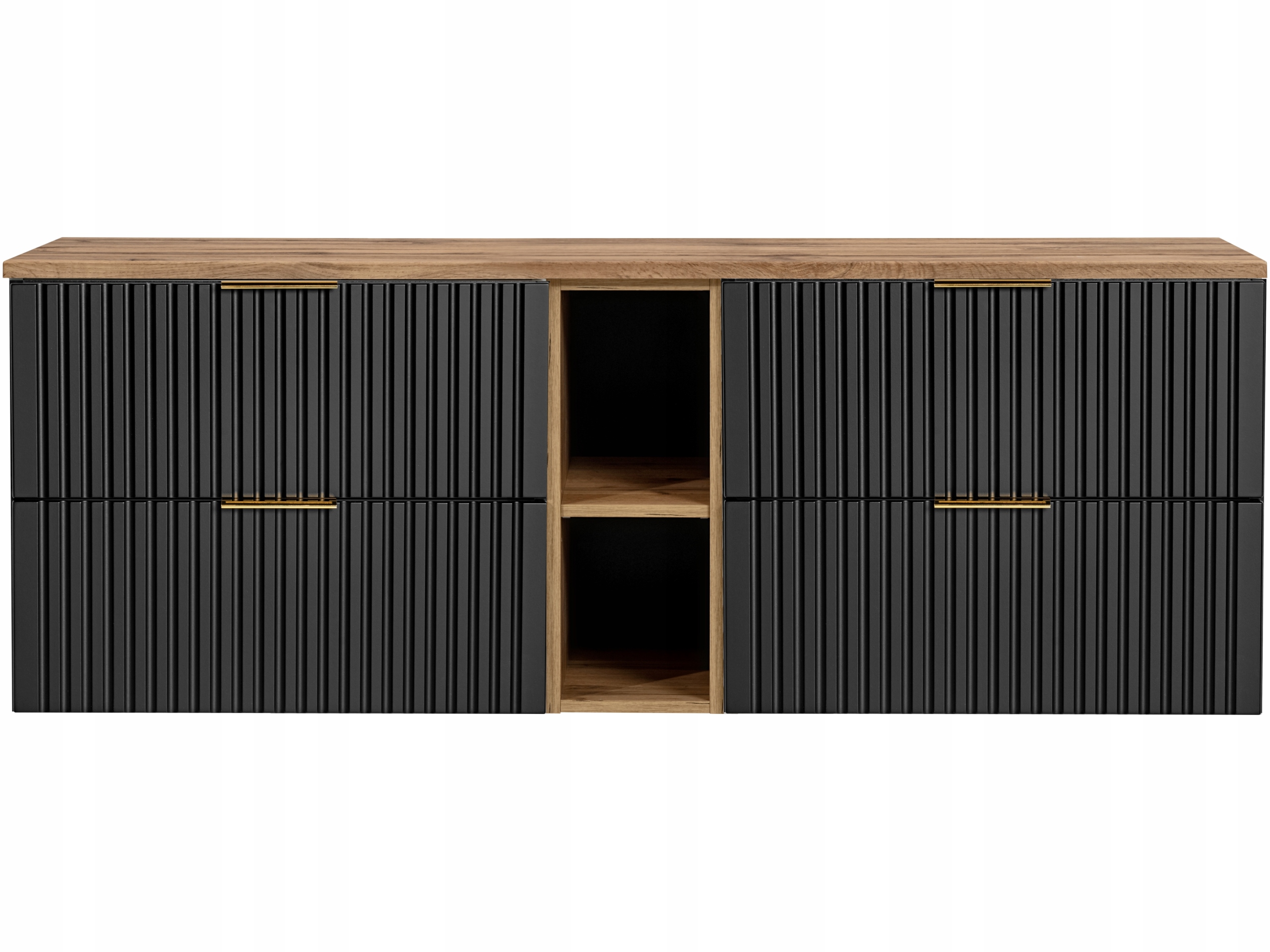 Blat w dekorze dąb wotan tworzy elegancki kontrast z czarnymi frontami, podkreślając styl całego zestawu.