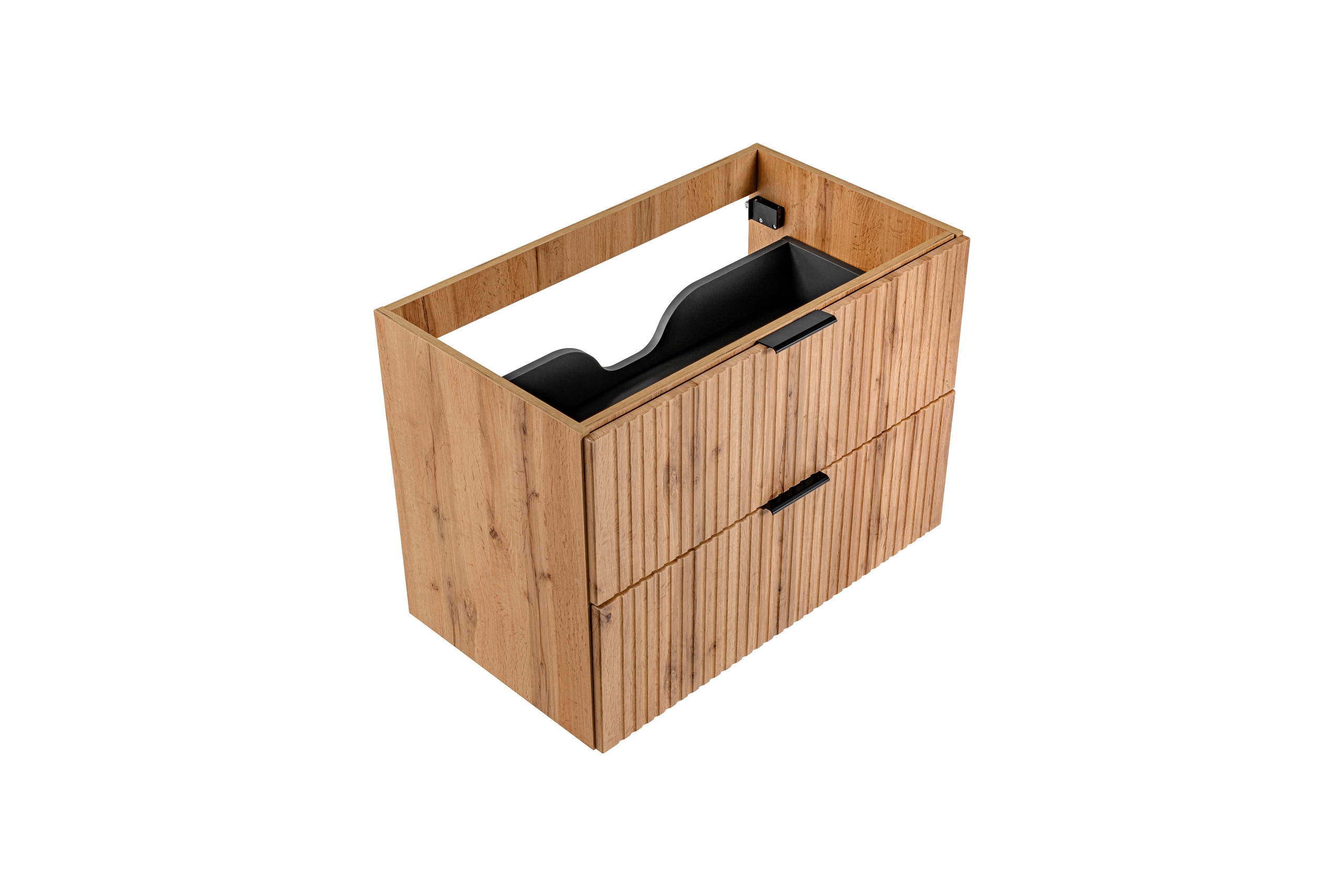 Szafka wyróżnia się ryflowanymi frontami oraz naturalnym odcieniem dąb wotan, który ociepla aranżację i nadaje wnętrzu ponadczasowy charakter. Pojemne szuflady z systemem cichego domyku zapewniają wygodne przechowywanie kosmetyków, ręczników i akcesoriów łazienkowych. Górna szuflada jest przygotowana pod syfon — posiada specjalne wycięcie na tylnej ściance, co ułatwia montaż umywalki nablatowej.