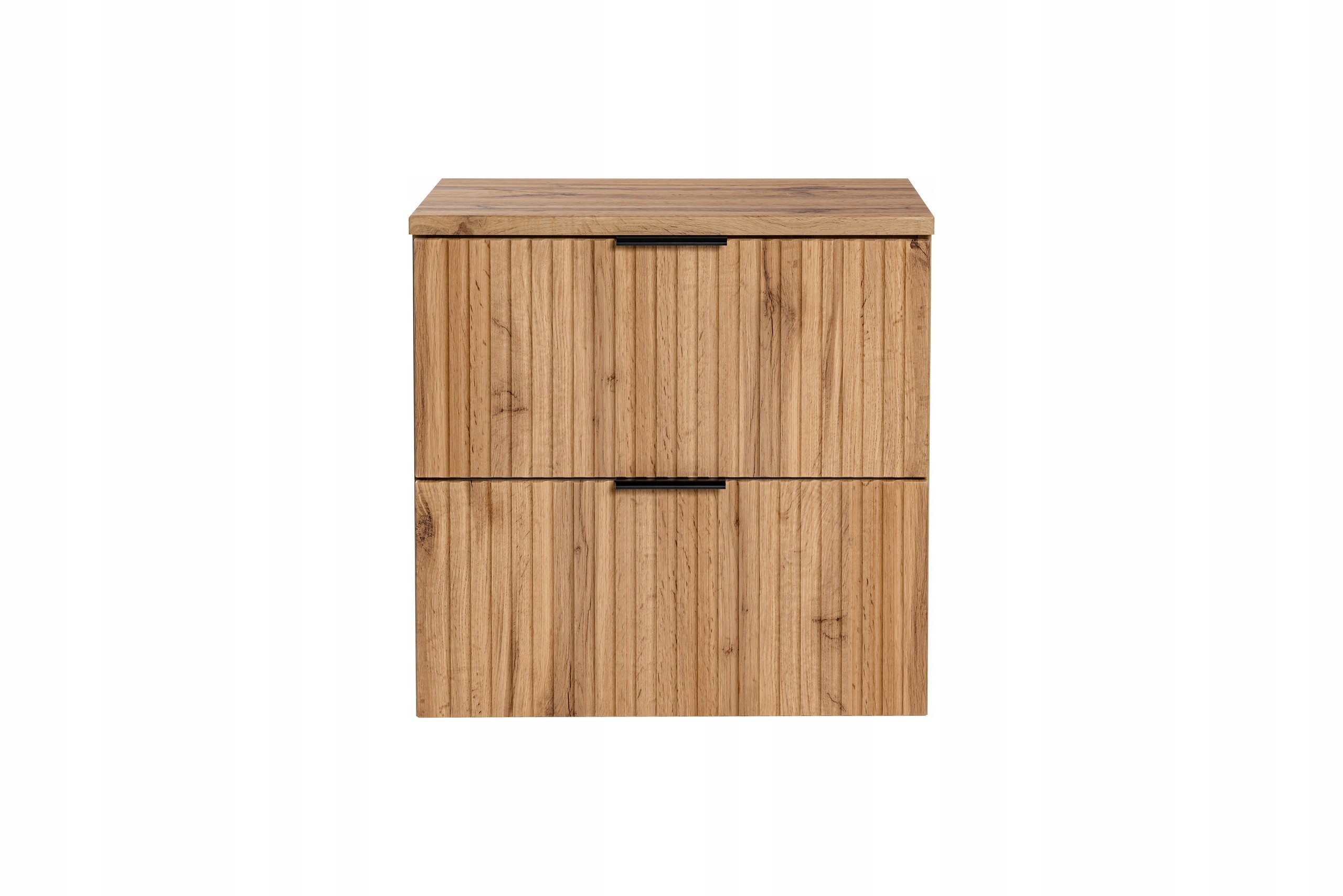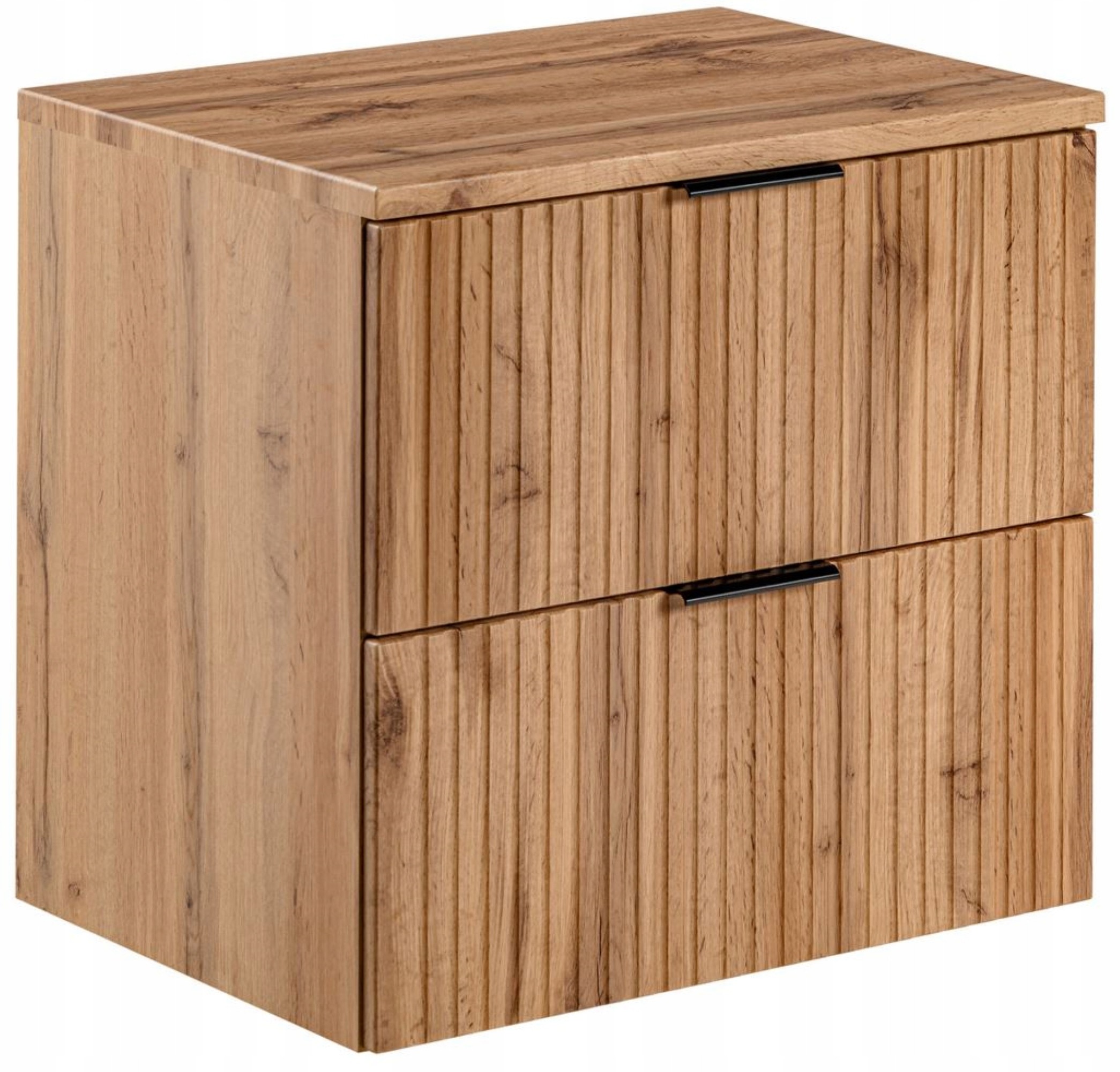 Dębowe, ryflowane fronty w połączeniu z matowym wykończeniem nadają szafce nowoczesny, stylowy wygląd. W zestawie znajduje się blat w kolorze dębu, który doskonale dopełnia całość. Do wyboru są trzy kolory uchwytów: czarny, chrom i złoty połysk, co pozwala na dopasowanie szafki do indywidualnych preferencji.