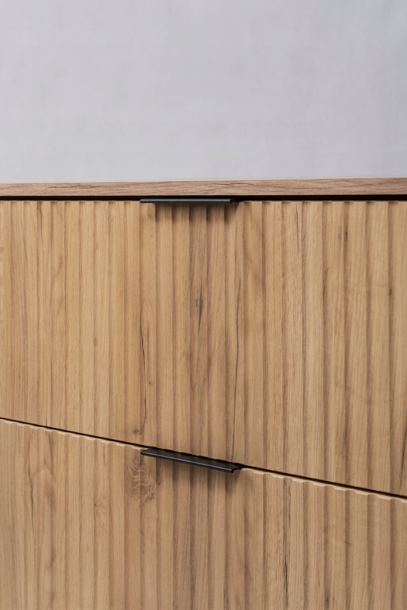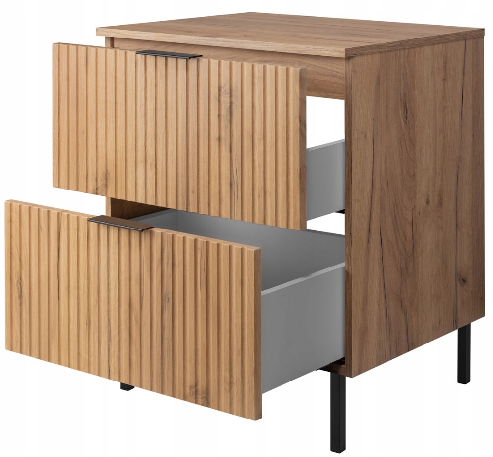 Dwie pojemne szuflady z pełnym wysuwem oraz systemem cichego domyku SOFT CLOSE zapewniają wygodne i komfortowe użytkowanie na co dzień. Czarne, metalowe nóżki o wysokości 15 cm dodają meblowi lekkości i nowoczesnego charakteru, a jednocześnie ułatwiają utrzymanie czystości pod szafką.