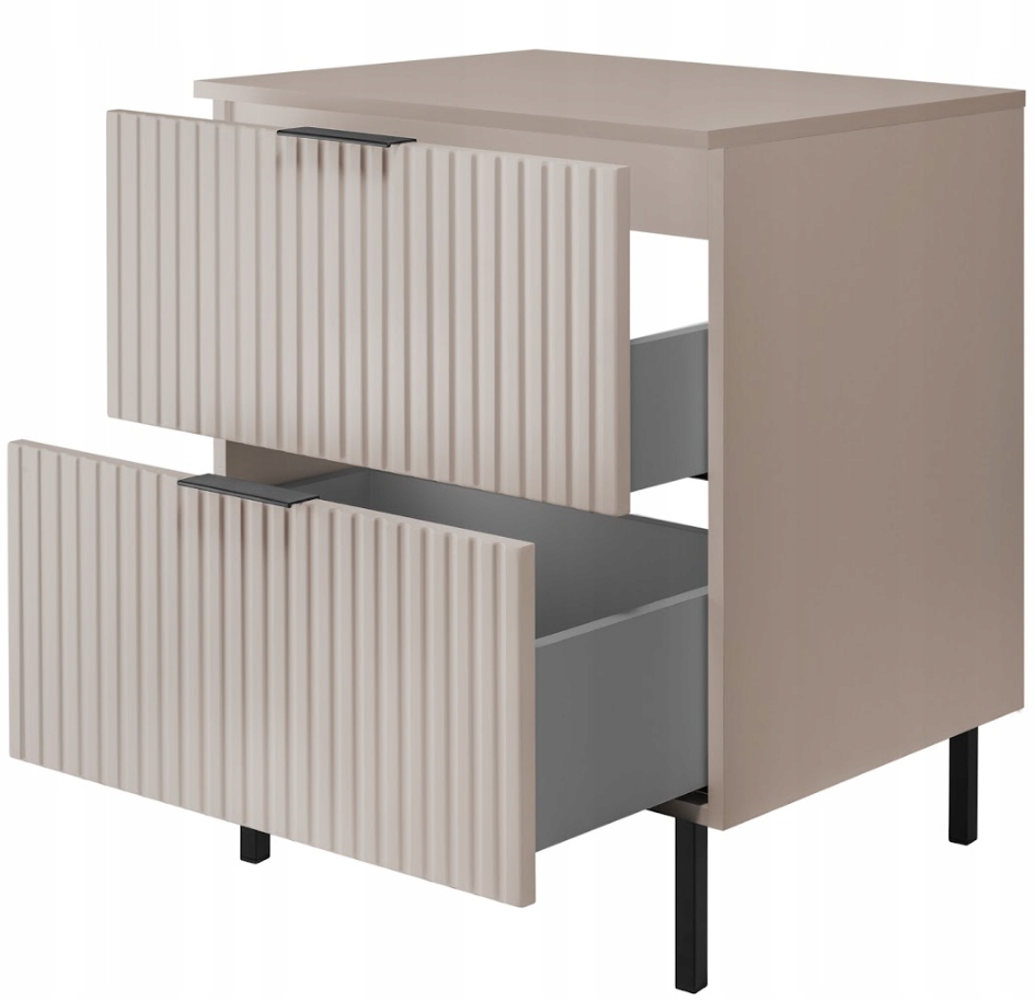 Szafka stoi na czarnych, metalowych nóżkach o wysokości 15 cm, które nadają konstrukcji lekkości, podkreślają nowoczesny charakter mebla oraz ułatwiają utrzymanie czystości pod szafką. Do zestawu dołączone są również plastikowe ślizgacze, umożliwiające alternatywny sposób ustawienia.