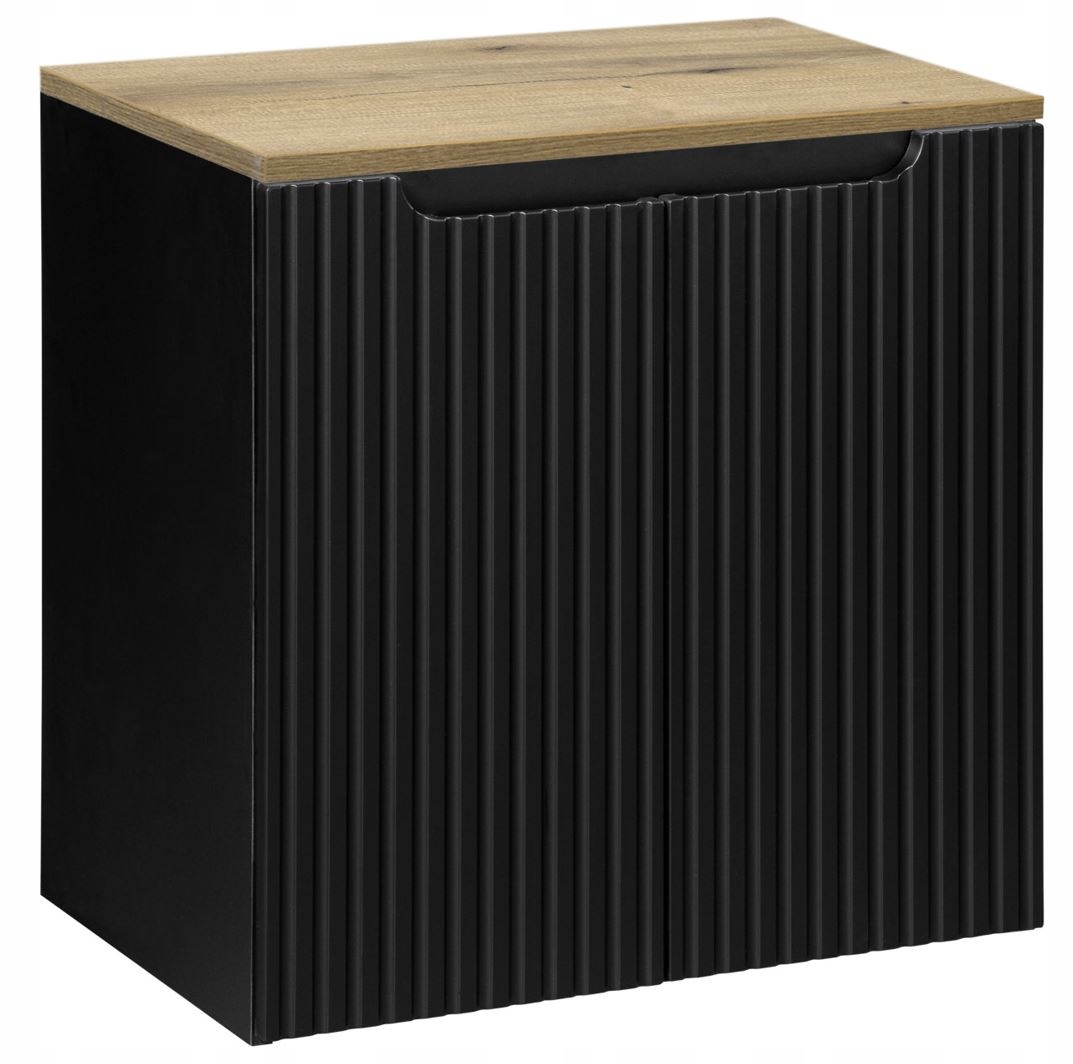Szafka pod umywalkę z kolekcji NOVA BLACK to kwintesencja nowoczesnej elegancji w kompaktowym rozmiarze, idealna do każdej łazienki, która wymaga stylowego i praktycznego rozwiązania. Ryflowane fronty i frezowane uchwyty nadają jej wyjątkowy, przyciągający uwagę charakter, podczas gdy konstrukcja wisząca pozwala zaoszczędzić miejsce i utrzymać porządek. Dzięki dwóm drzwiom i wygodnej półce wewnętrznej, szafka ułatwia organizację, zapewniając optymalną przestrzeń na przechowywanie akcesoriów łazienkowych.