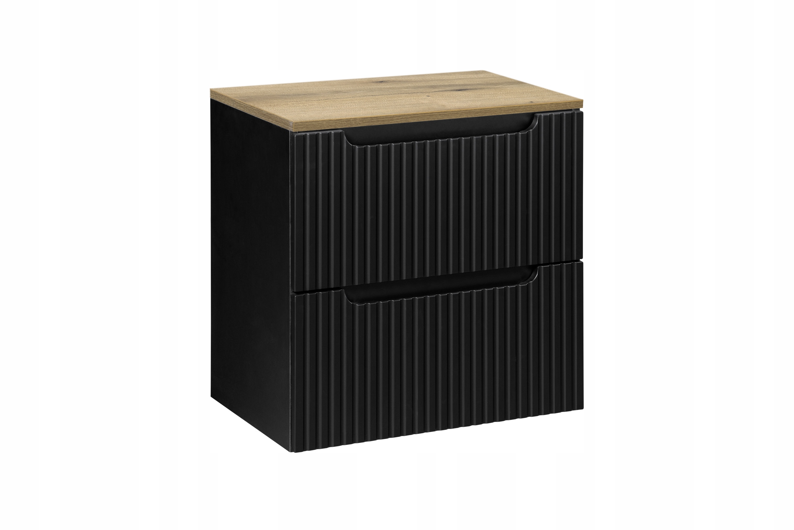Szafka pod umywalkę z kolekcji Nova Black z blatem w kolorze dębu łączy minimalistyczny design z praktycznością, dostosowaną do dynamicznego stylu życia. Szafka wyróżnia się eleganckim, czarnym matowym wykończeniem i pionowymi ryflowaniami na frontach, nadającymi jej unikalny charakter i głębię. Dębowy blat Dąb Coast Evoke wprowadza naturalny akcent, kontrastując z czarnymi frontami i tworząc nowoczesną, harmonijną kompozycję.