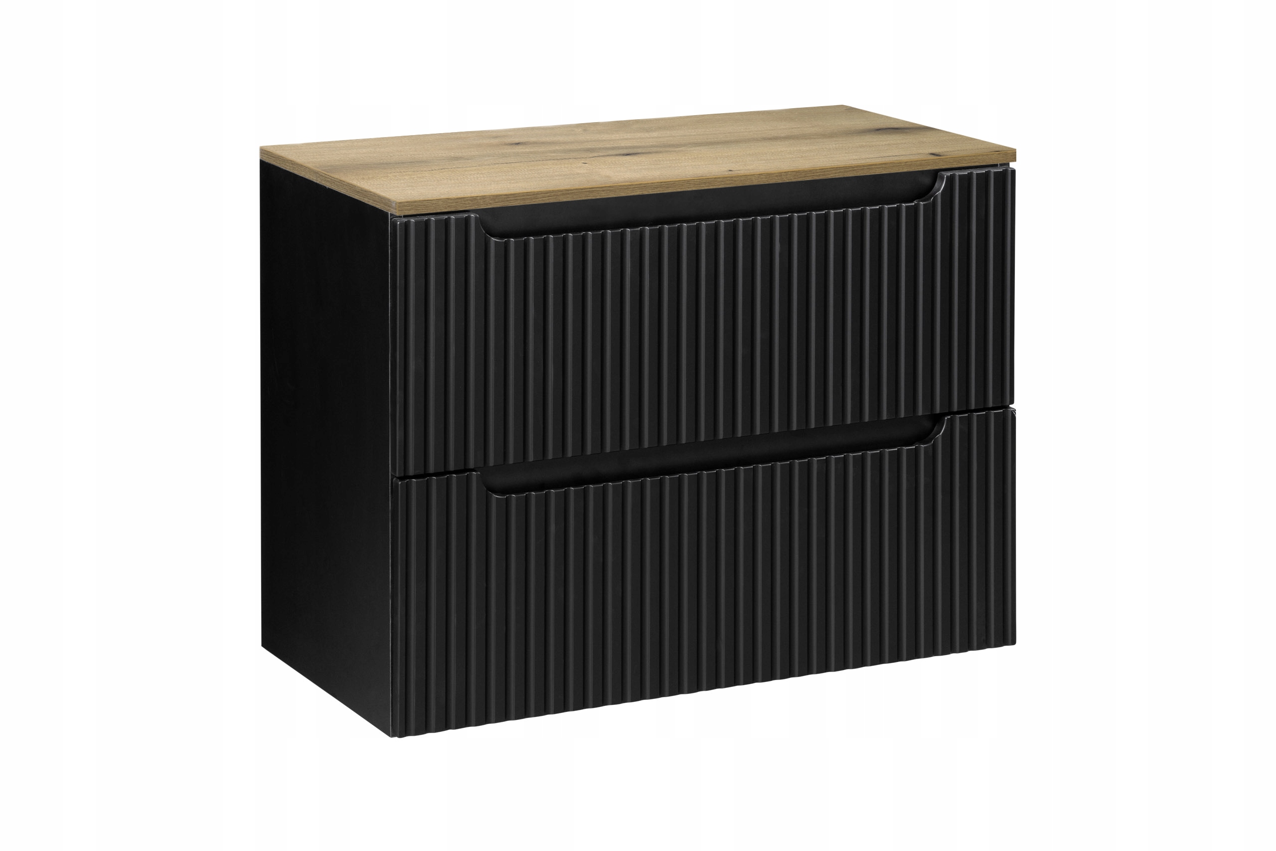 Czarna szafka pod umywalkę z blatem dąb to nowoczesne rozwiązanie dla eleganckich łazienek, zaprojektowane w ramach kolekcji Nova Black. Szafka wyróżnia się minimalistycznym stylem z pionowymi ryflowaniami na frontach szuflad, które nadają jej wyrazistości i głębi. Czarne, matowe wykończenie korpusu pięknie kontrastuje z naturalnym blatem w kolorze Dąb Coast Evoke, tworząc elegancką i harmonijną kompozycję.