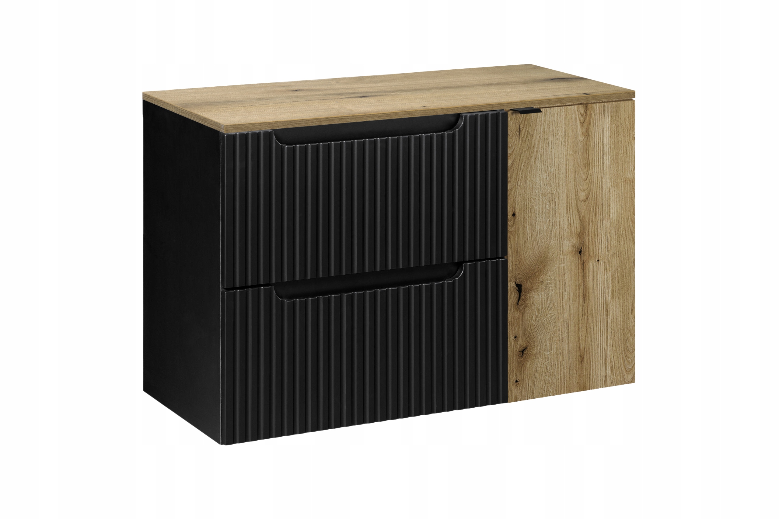 Szafka pod umywalkę z kolekcji Nova Black to połączenie minimalistycznego designu i wysokiej funkcjonalności. Wyróżnia się eleganckim, matowym wykończeniem czarnych frontów, ozdobionych pionowymi ryflowaniami, które dodają głębi i nowoczesnego charakteru. Drewniany blat w odcieniu Dąb Coast Evoke wprowadza ciepły, naturalny akcent, który doskonale współgra z czarną kolorystyką.