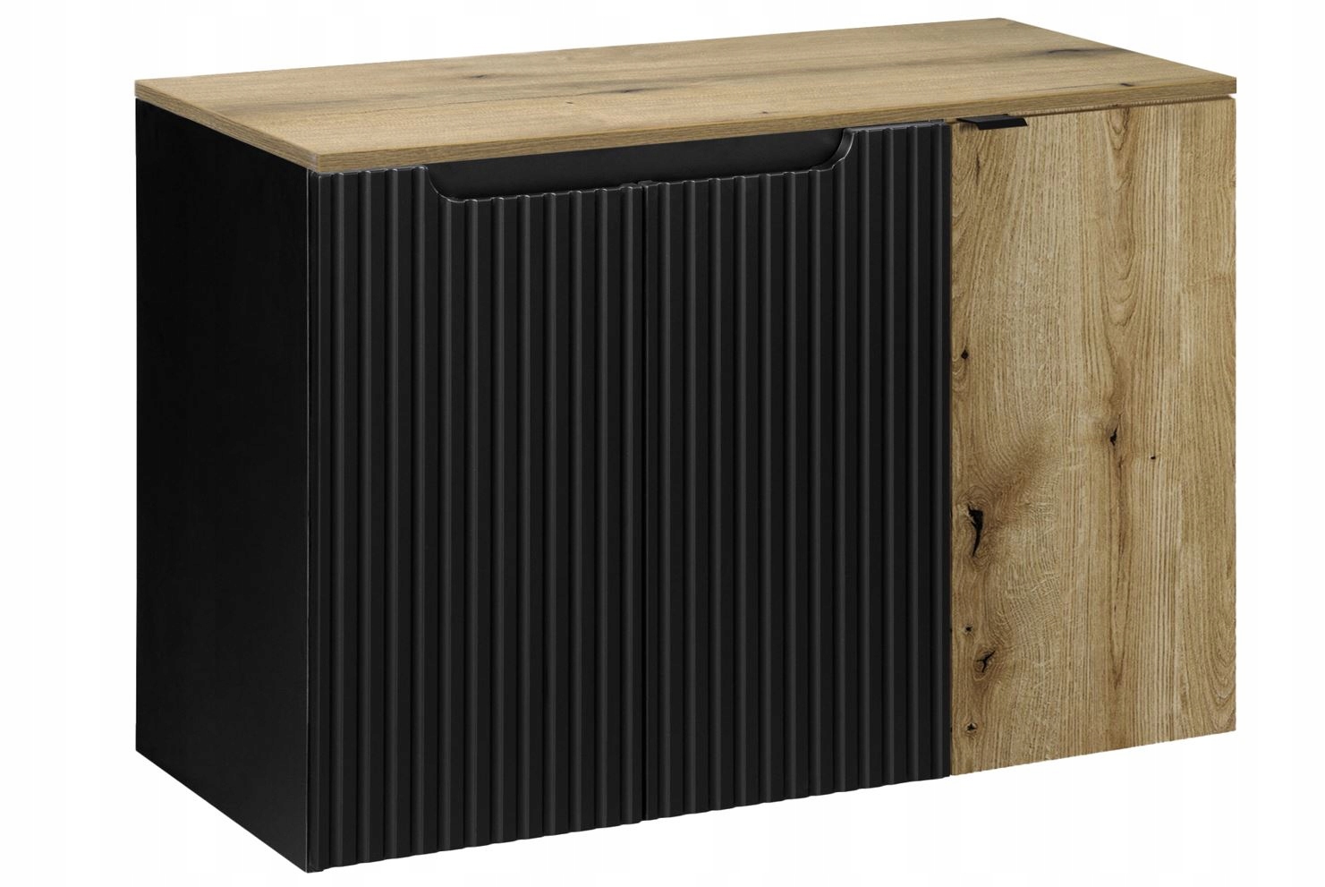 Szafka pod umywalkę z kolekcji NOVA BLACK z blatem w odcieniu dębu to idealne połączenie stylu i funkcjonalności. Czarne ryflowane fronty nadają szafce elegancji i wyrafinowanego charakteru, podczas gdy blat w kolorze dębu wprowadza naturalne ciepło do wnętrza.