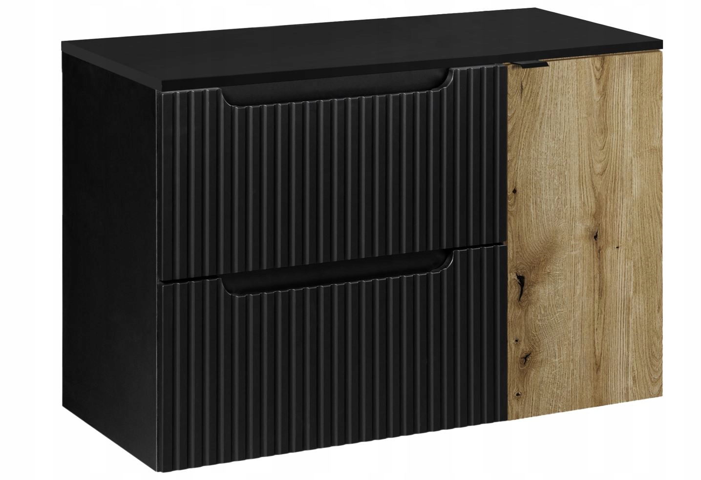 Fronty szafki zdobią subtelne, pionowe ryflowania, które nadają meblowi unikalnego charakteru, a ich matowe, czarne wykończenie emanuje elegancją. Konstrukcja wisząca ułatwia utrzymanie czystości oraz sprawdza się w małych przestrzeniach, dzięki zmniejszonej głębokości mebla.