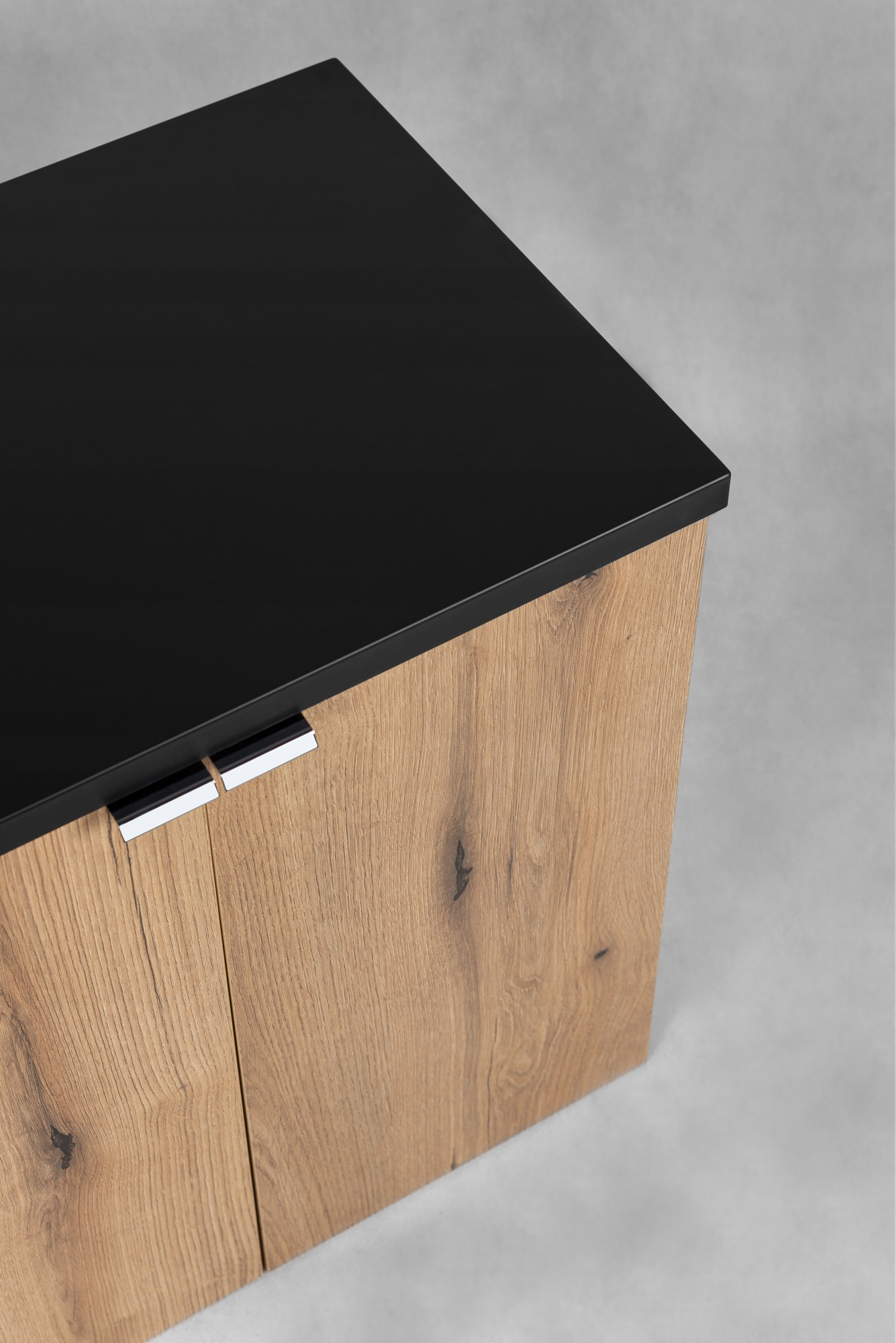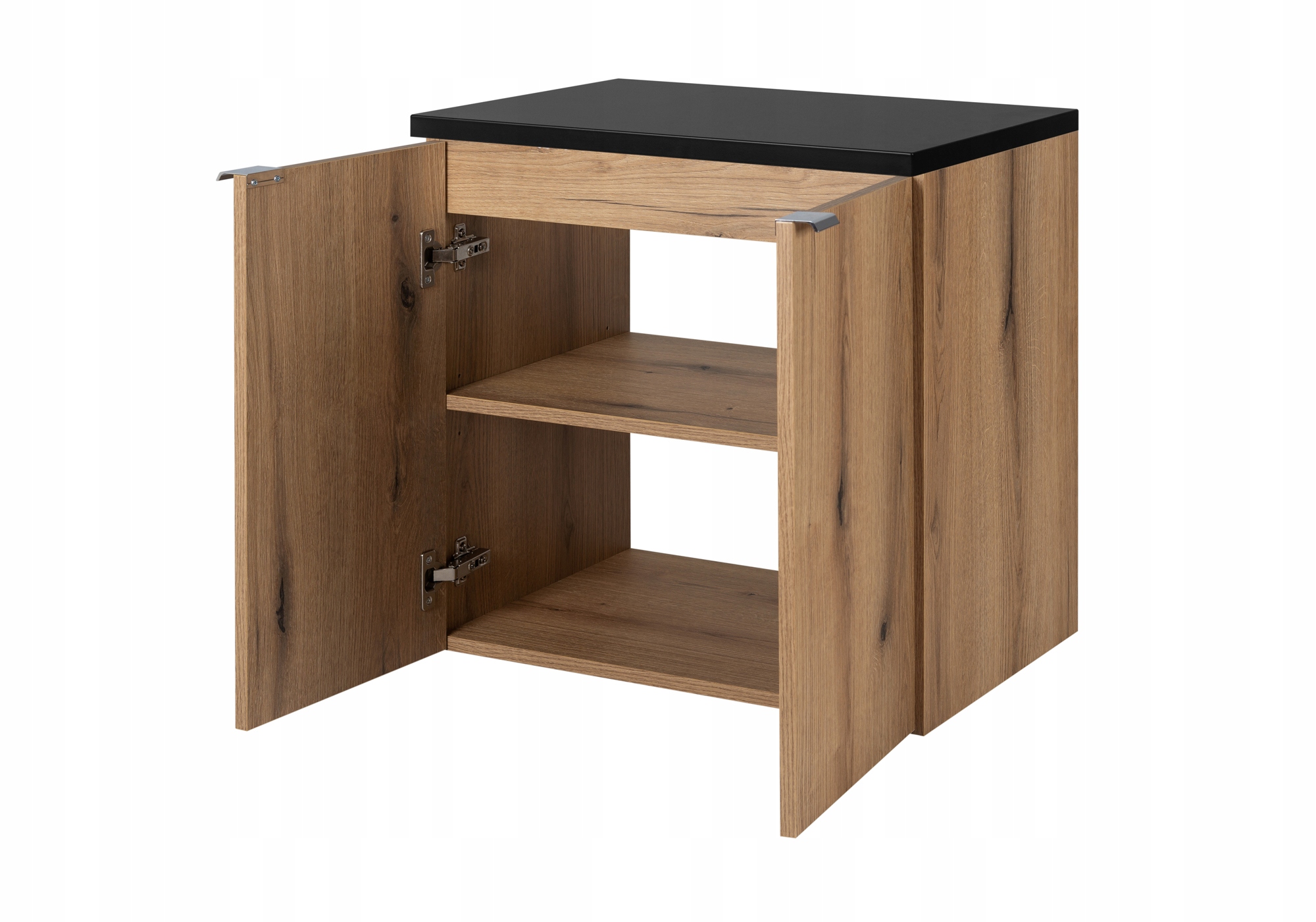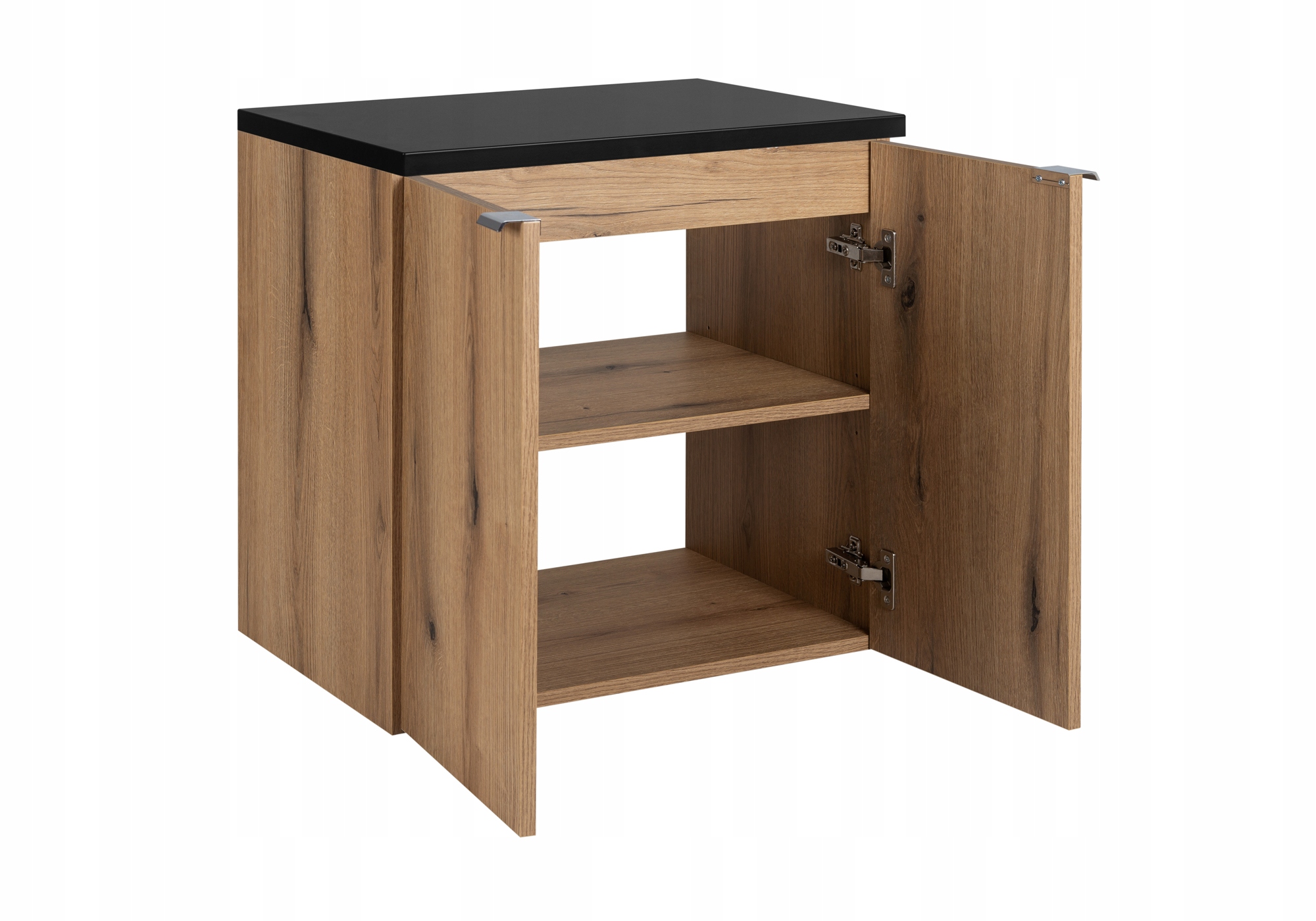 Szafka pod umywalkę z kolekcji NOVA OAK wyposażona w dopasowany blat w kolorze czarnym, to połączenie naturalnej elegancji i nowoczesnej funkcjonalności. Wykończona ciepłym odcieniem drewna, szafka wprowadza do łazienki przytulność i stylowy akcent. Dwudrzwiowa konstrukcja z funkcją SOFT CLOSE zapewnia łatwe i ciche domykanie, a chromowane uchwyty dodają subtelnej elegancji, podkreślając minimalistyczny charakter mebla.