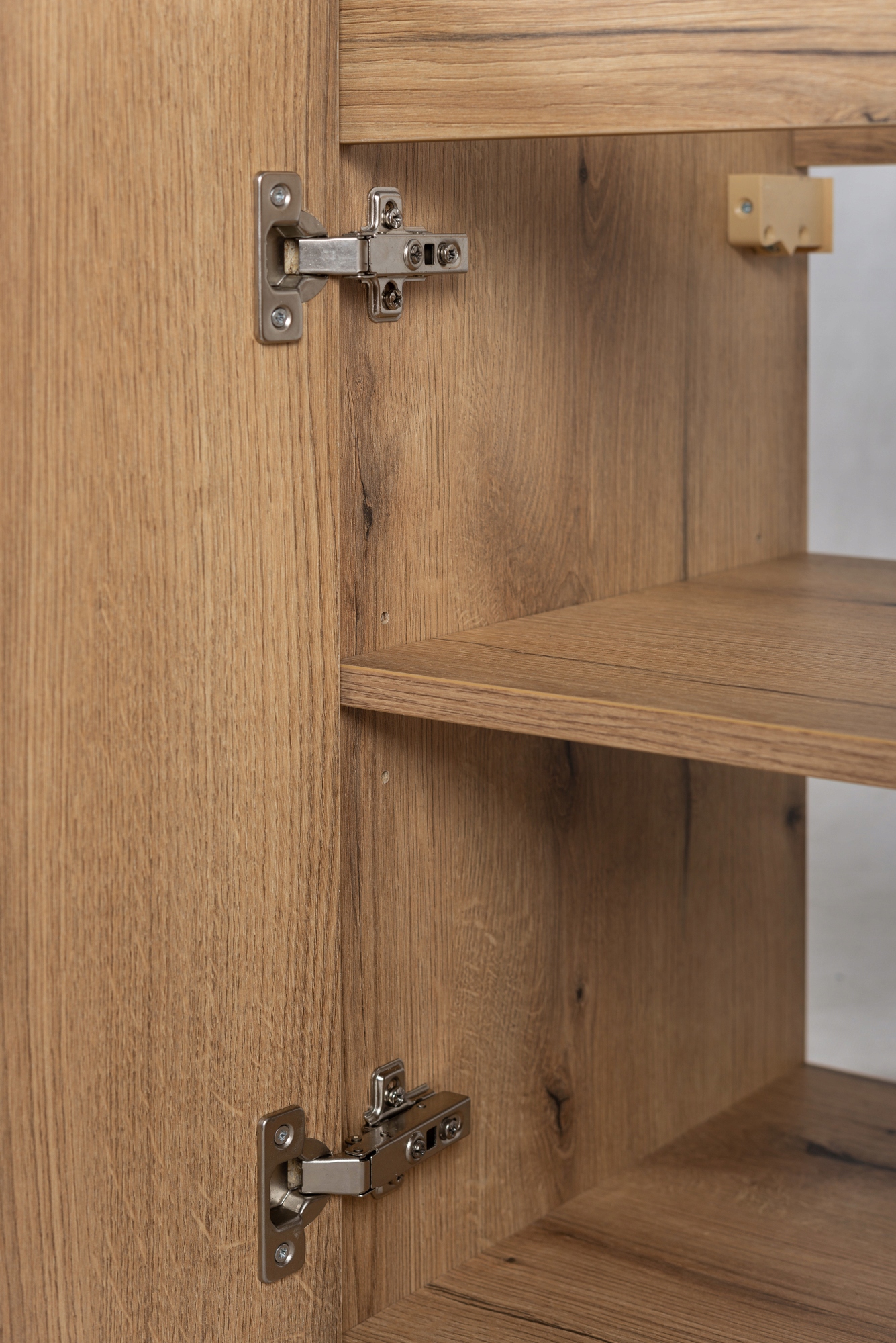 Szafka pod umywalkę z kolekcji NOVA OAK wyposażona w dopasowany blat w kolorze dąb coast evoke, to połączenie naturalnej elegancji i nowoczesnej funkcjonalności. Wykończona ciepłym odcieniem drewna, szafka wprowadza do łazienki przytulność i stylowy akcent. Dwudrzwiowa konstrukcja z funkcją SOFT CLOSE zapewnia łatwe i ciche domykanie, a chromowane uchwyty dodają subtelnej elegancji, podkreślając minimalistyczny charakter mebla.