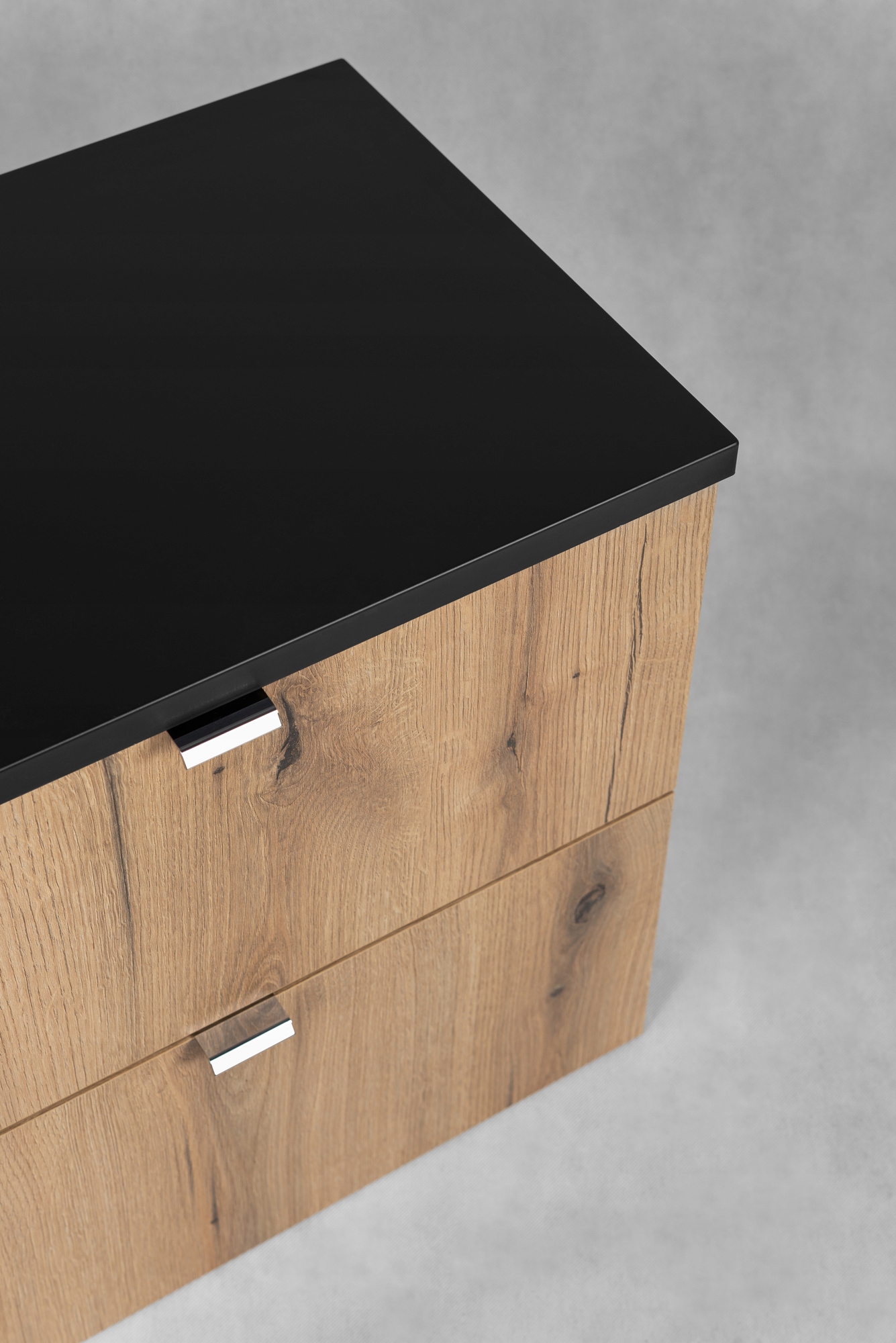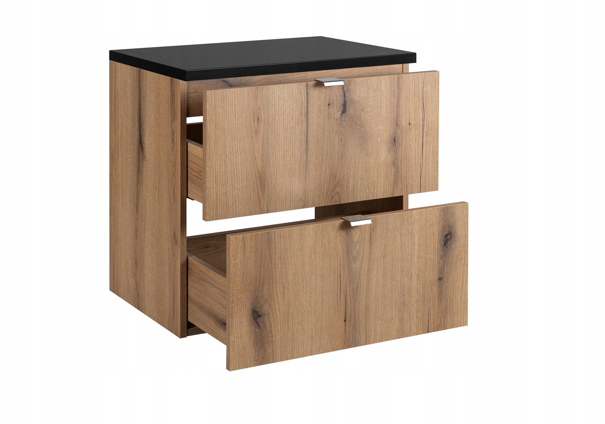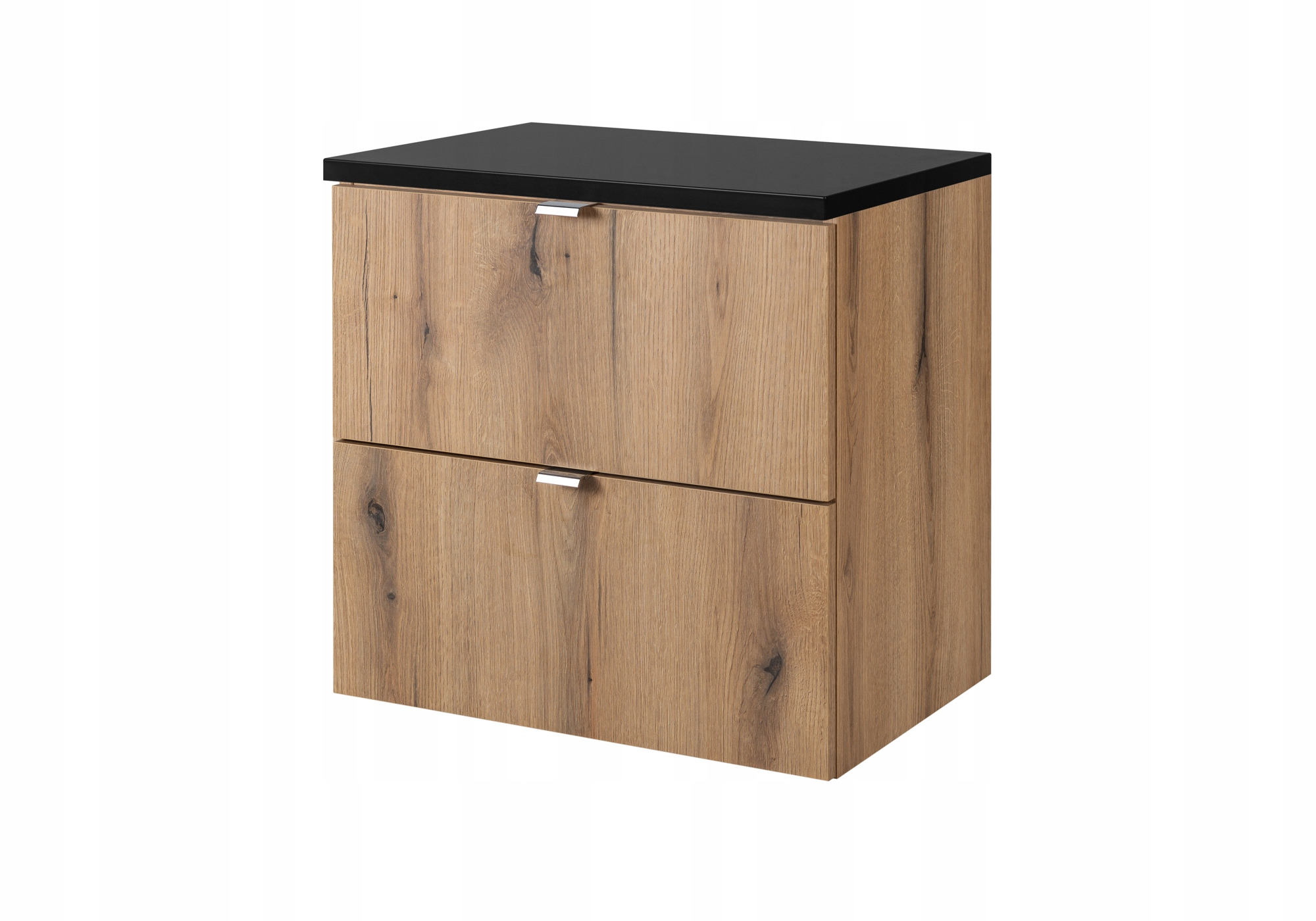 Szafka pod umywalkę z kolekcji NOVA OAK wyposażona w elegancki czarny blat, to połączenie naturalnego uroku drewna z nowoczesnym akcentem. Wykonana w odcieniu dąb coast evoke, szafka dodaje wnętrzu przytulności, a czarny blat w matowym wykończeniu podkreśla jej stylowy charakter. Dwie szuflady z cichym domykiem SOFT CLOSE zapewniają wygodne i bezgłośne użytkowanie, a chromowane uchwyty dodają elegancji i funkcjonalności.