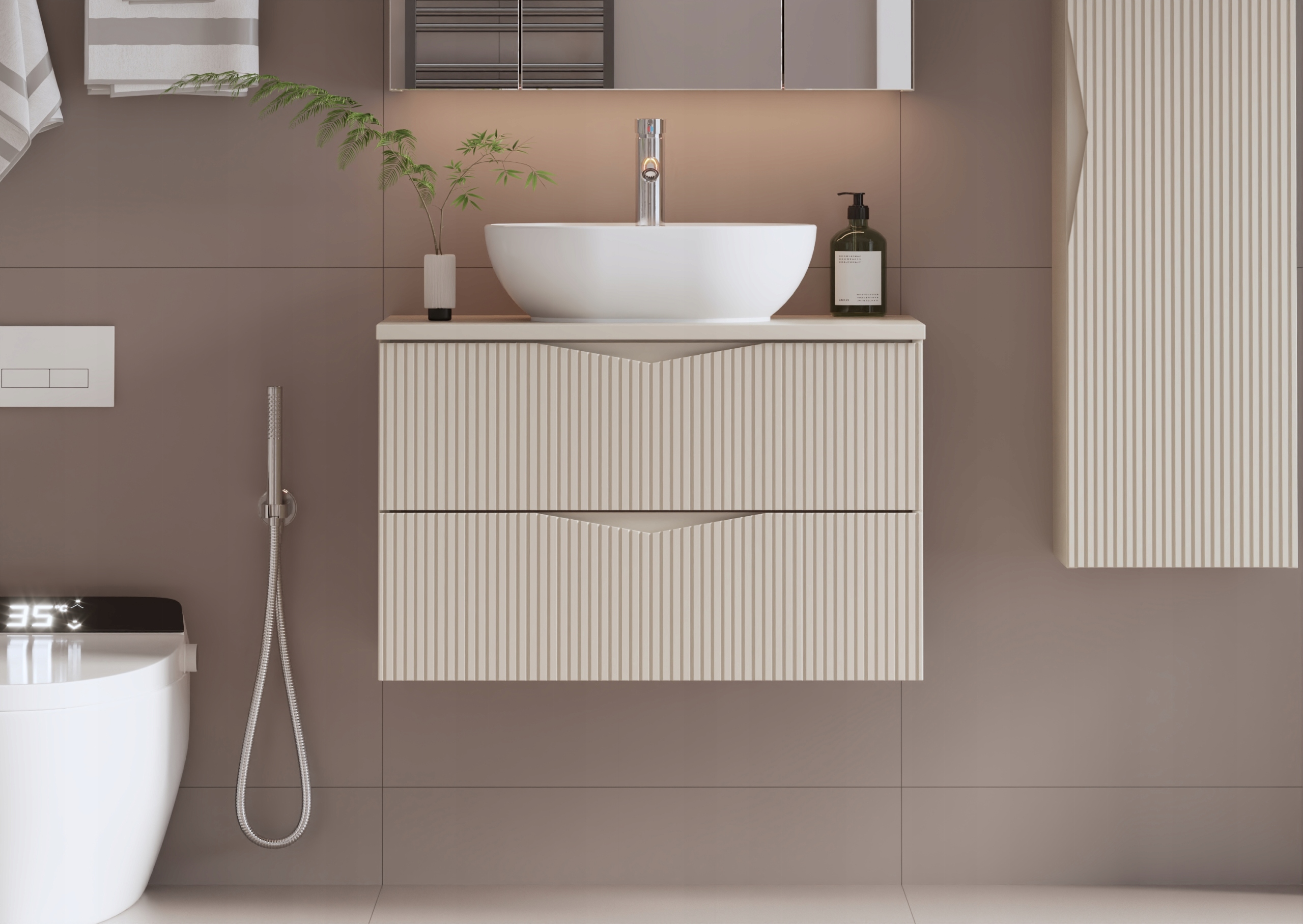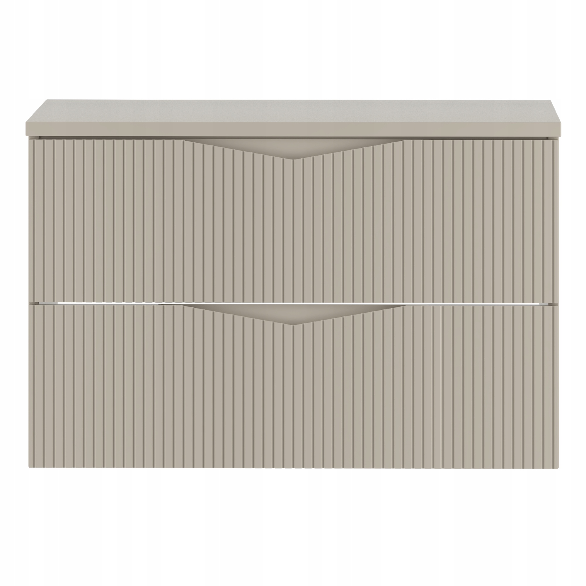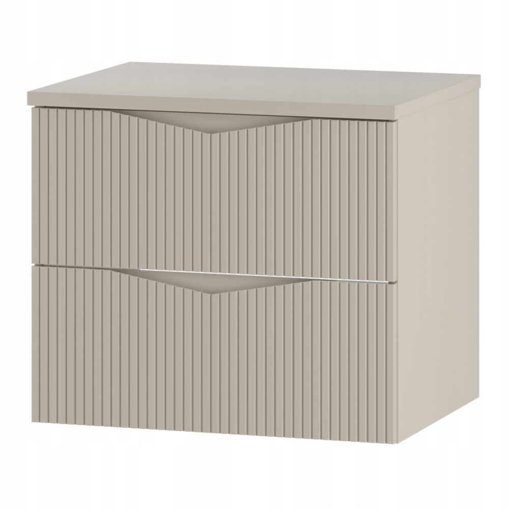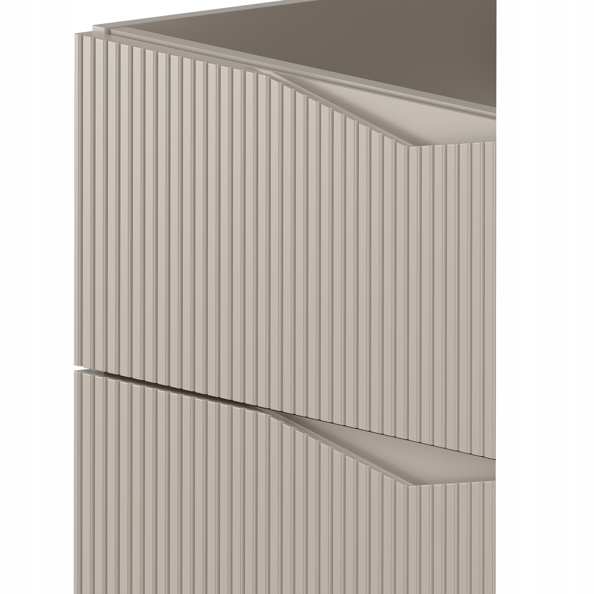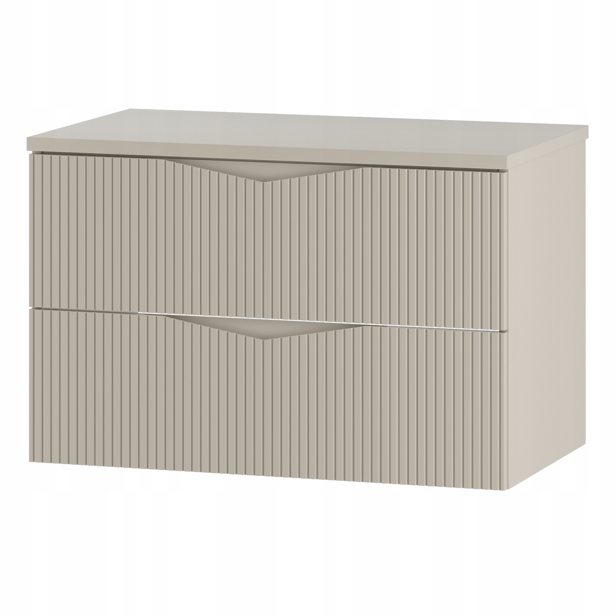 Szafka łazienkowa CLEO o szerokości 80 cm, wysokości 50 cm i głębokości 45,8 cm w kolorze beż piaskowy z dopasowanym blatem MDF o grubości 2,2 cm to idealne rozwiązanie dla nowoczesnych wnętrz, w których liczy się zarówno funkcjonalność, jak i elegancki wygląd. Ryflowane fronty z płyty MDF o grubości 18 mm dodają całości wyjątkowego charakteru, a zintegrowany frezowany uchwyt podkreśla minimalistyczny styl i zapewnia wygodę użytkowania.