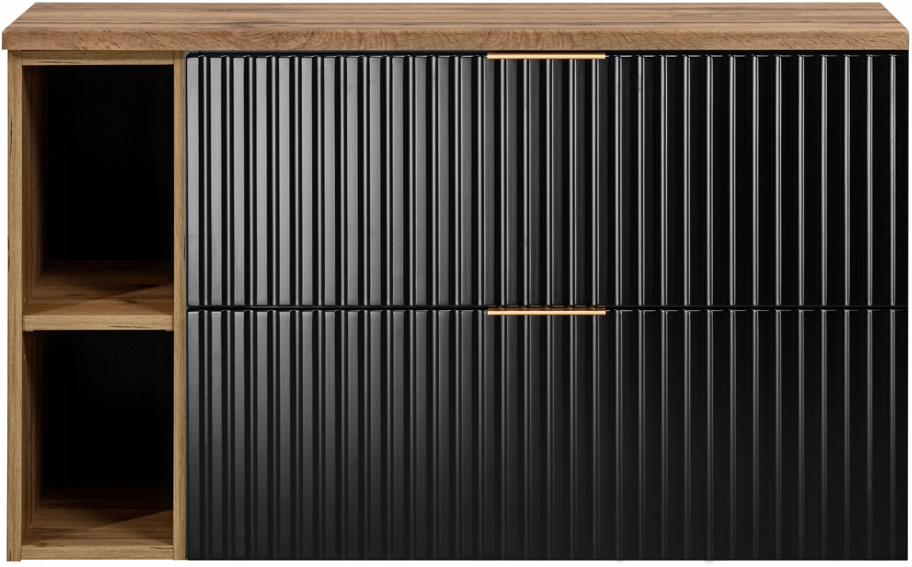 Czarna szafka pod umywalkę z kolekcji FLOW o szerokości 100 cm to eleganckie i funkcjonalne rozwiązanie stworzone z myślą o nowoczesnych łazienkach. Ryflowane fronty w matowej czerni nadają meblowi wyrazisty, luksusowy charakter, a blat w dekorze dąb Wotan wprowadza naturalne ocieplenie i efektowny kontrast, idealnie wpisując się w estetykę nowoczesnego glamour.