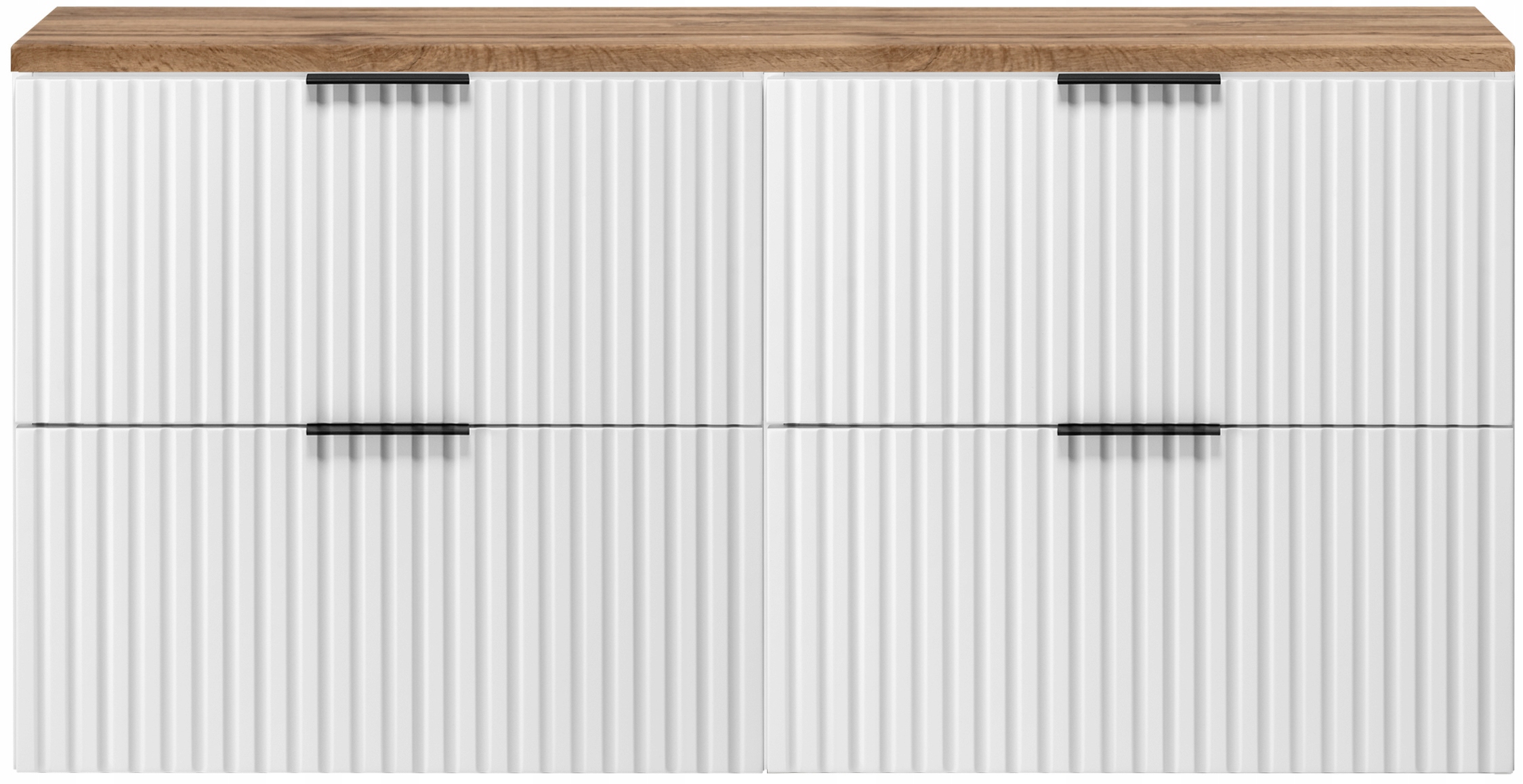 Ryflowane fronty w białym macie nadają bryle wyrazistości i elegancji, a ciepły odcień blatu wprowadza naturalny akcent do wnętrza. Cztery pojemne szuflady wyposażone w system SOFT CLOSE zapewniają ciche i płynne domykanie, zwiększając komfort codziennego użytkowania. Konstrukcja wisząca nadaje przestrzeni lekkości i ułatwia utrzymanie czystości.