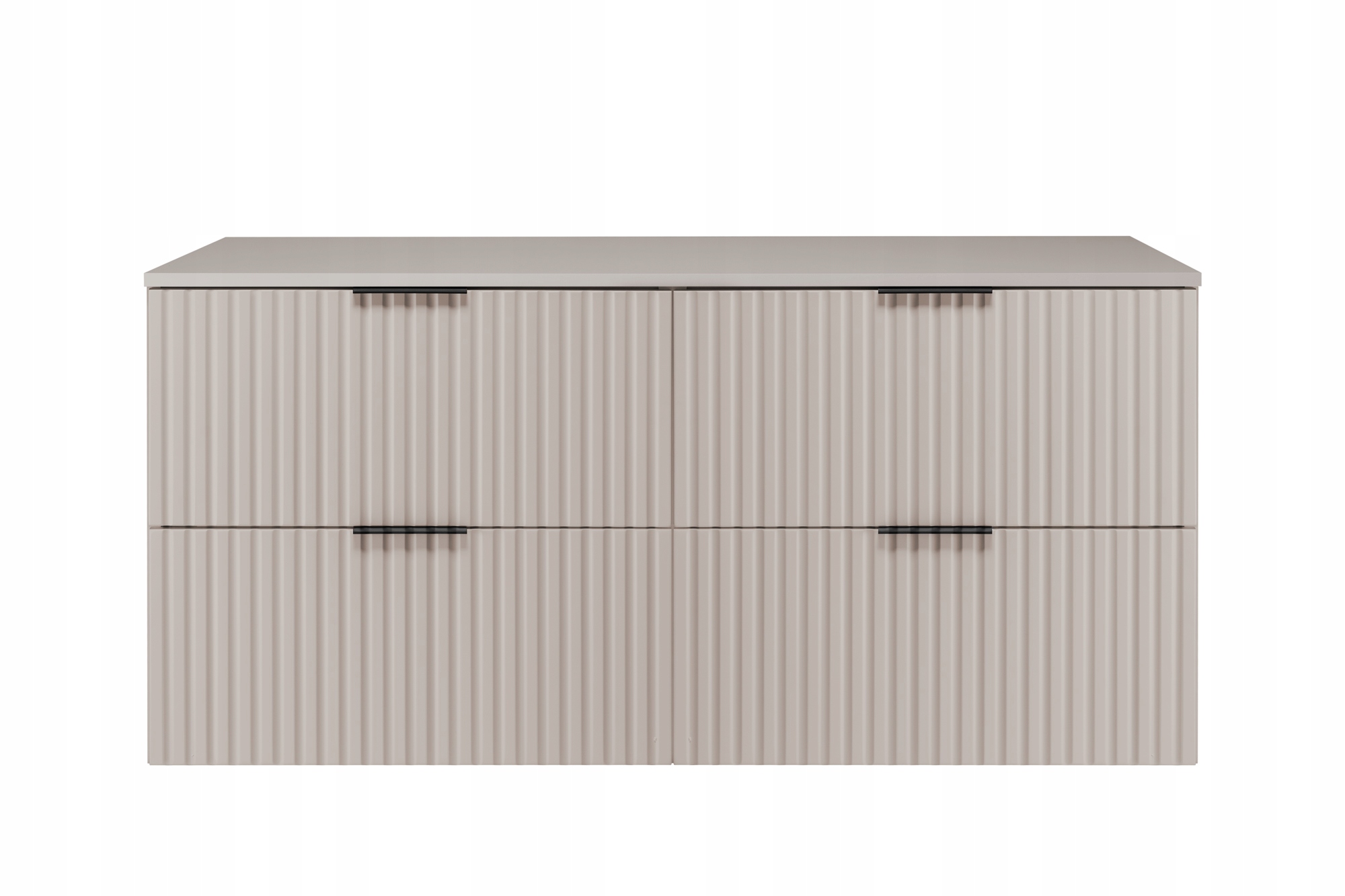 Szafka łazienkowa FLOW o szerokości 120 cm w kolorze kaszmir to eleganckie rozwiązanie dla nowoczesnych wnętrz. Matowa powierzchnia w połączeniu z dekoracyjnymi, ryflowanymi frontami tworzy harmonijną i luksusową formę, która subtelnie podkreśla charakter łazienki.