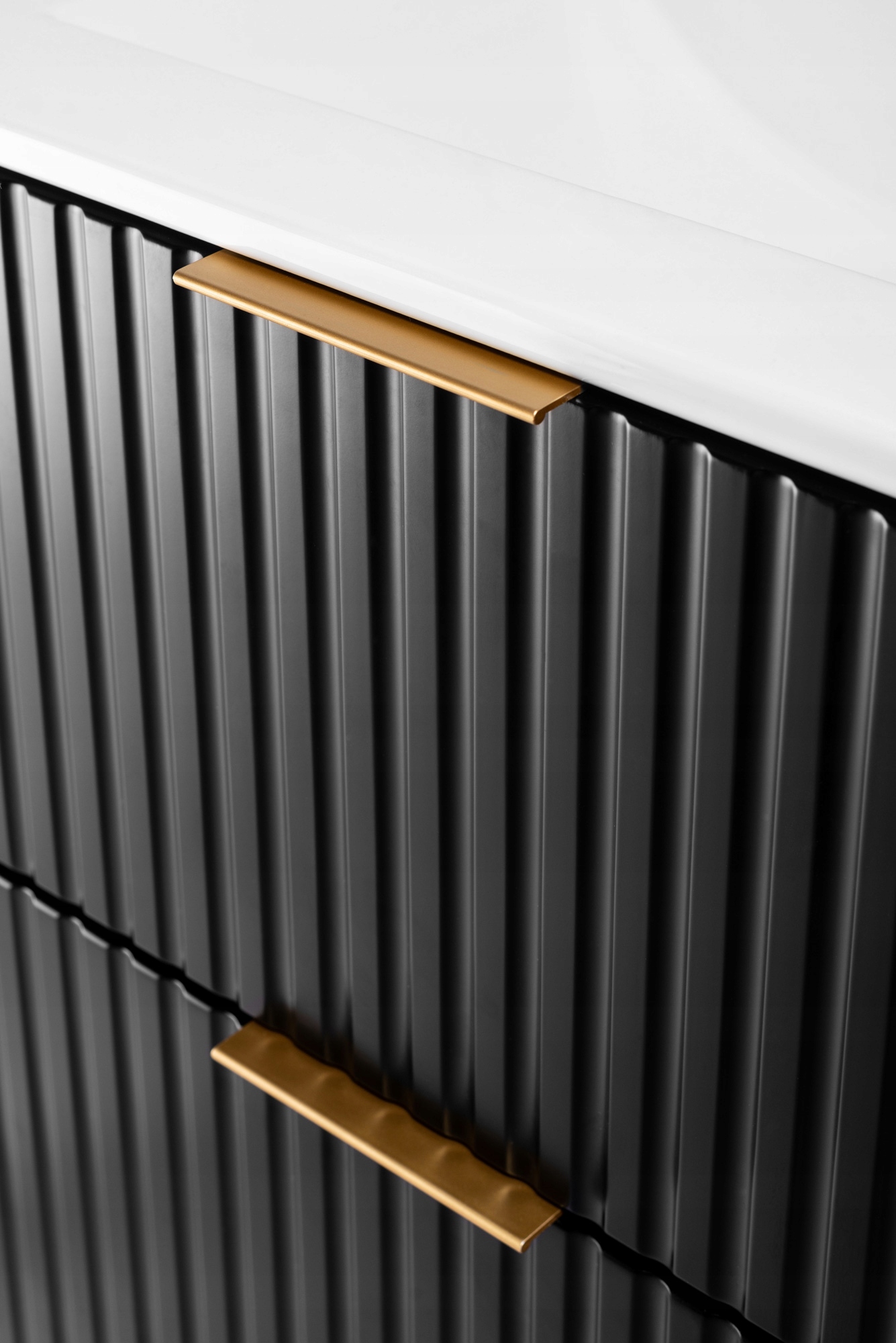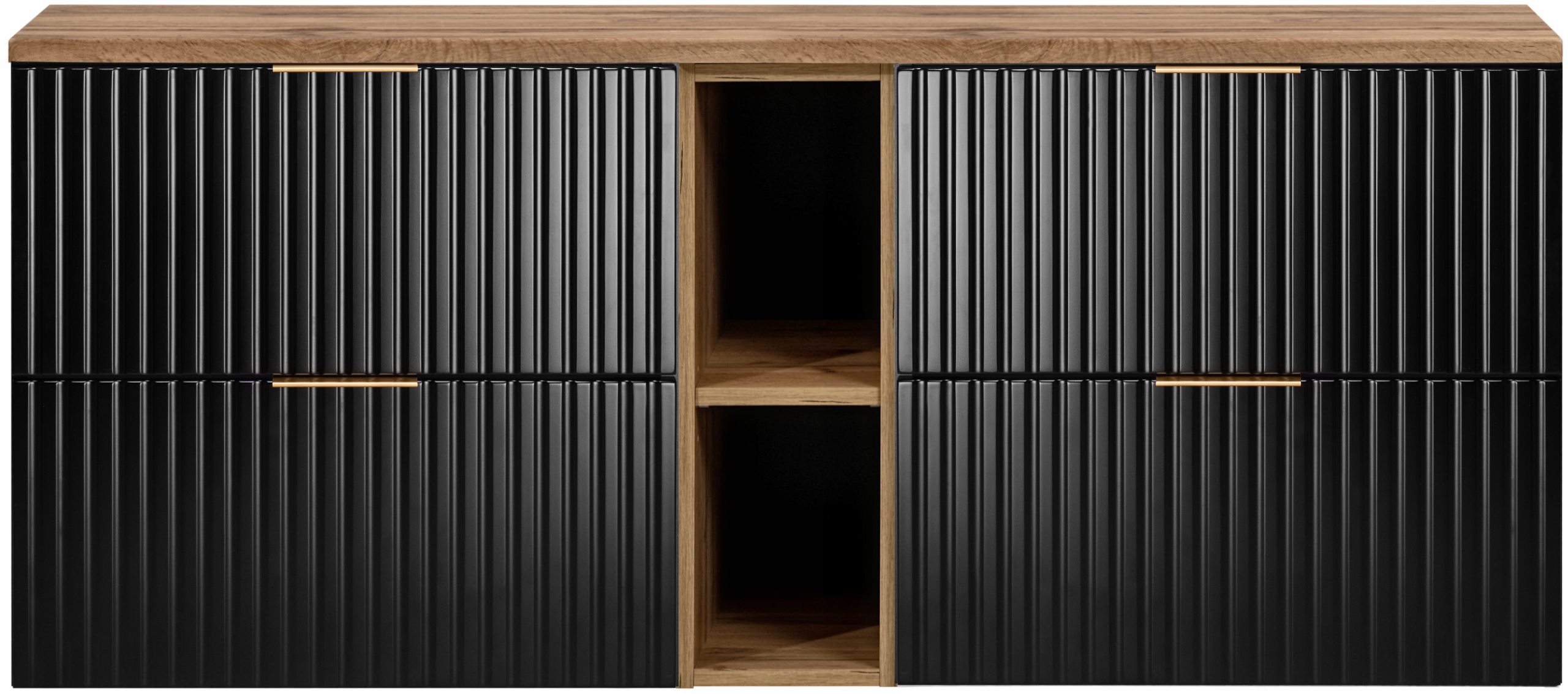 Czarna szafka pod umywalkę FLOW o łącznej szerokości 140 cm to elegancka i nowoczesna propozycja do łazienek urządzonych w stylu glamour oraz nowoczesnym. Ryflowane fronty w głębokim czarnym macie nadają meblom wyrazistego charakteru, a blat w dekorze dąb Wotan wprowadza ciepły, naturalny akcent, który doskonale przełamuje ciemną kolorystykę.