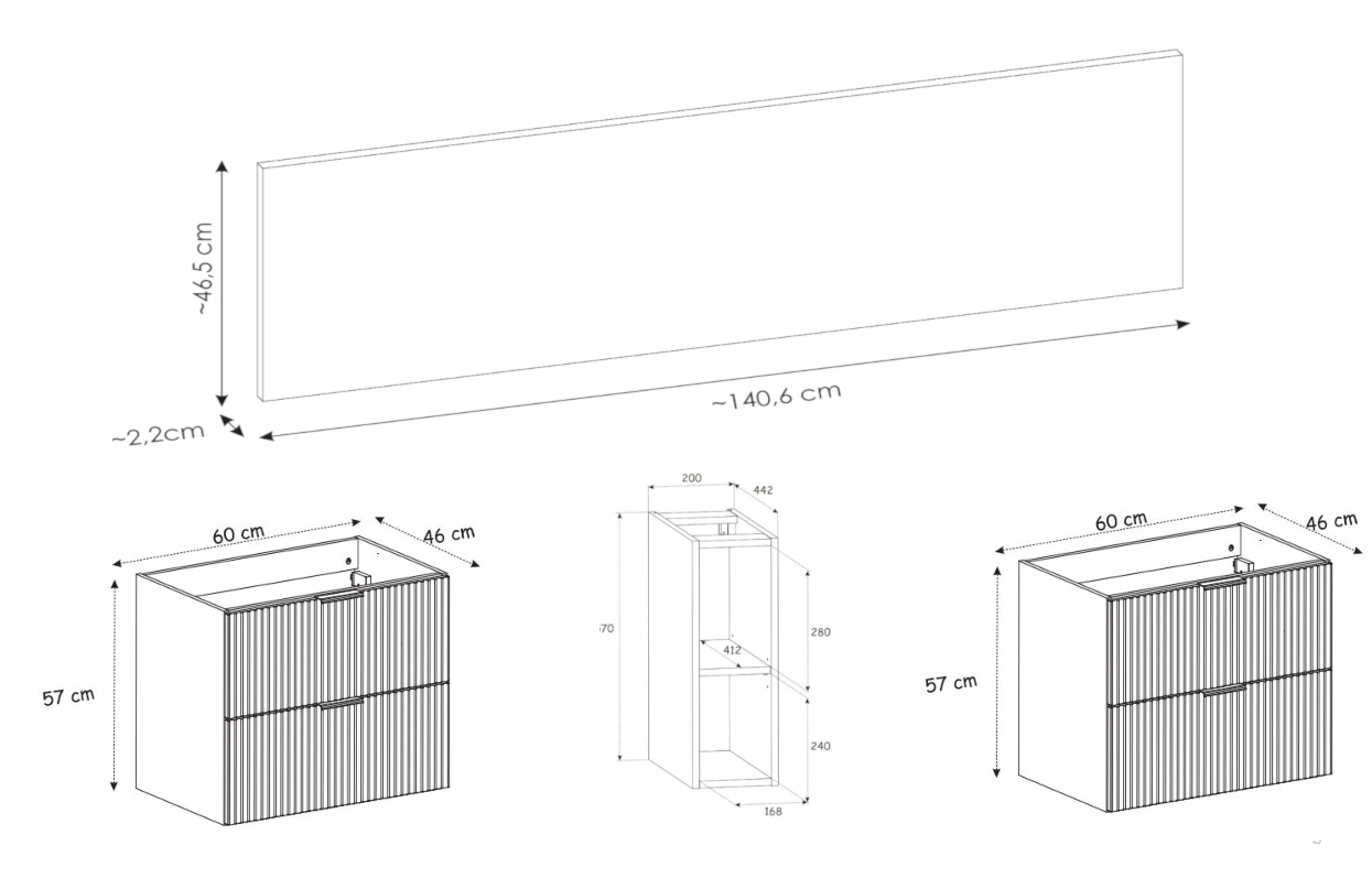 Zestaw składa się z dwóch wiszących szafek o szerokości 60 cm każda, które oferują funkcjonalną i wygodną przestrzeń do przechowywania. Pojemne szuflady wyposażone w system SOFT CLOSE zapewniają płynne i bezgłośne domykanie, podnosząc komfort codziennego użytkowania. Uzupełnieniem zestawu jest regał, który można zamontować po lewej stronie, prawej lub centralnie – w zależności od układu i potrzeb aranżacyjnych.
