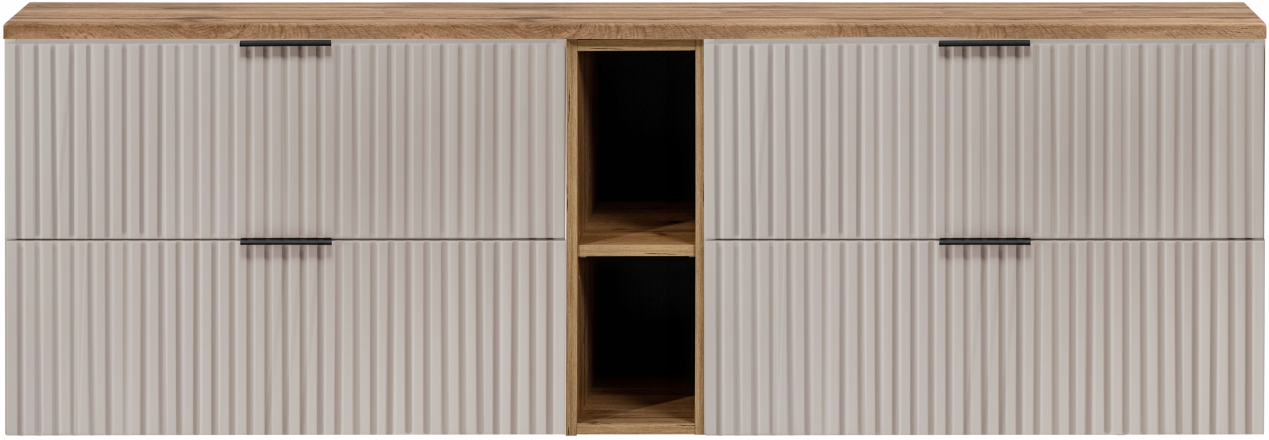 Zestaw składa się z dwóch wiszących modułów, tworzących zabudowę o szerokości 180 cm. Cztery pojemne szuflady zapewniają komfortową przestrzeń do przechowywania, a system cichego domyku SOFT CLOSE gwarantuje płynne i bezgłośne użytkowanie na co dzień. Blat w dekorze dąb Wotan wprowadza do wnętrza naturalne ciepło i stanowi efektowny kontrast dla kaszmirowych frontów, podkreślając nowoczesny styl całego zestawu.