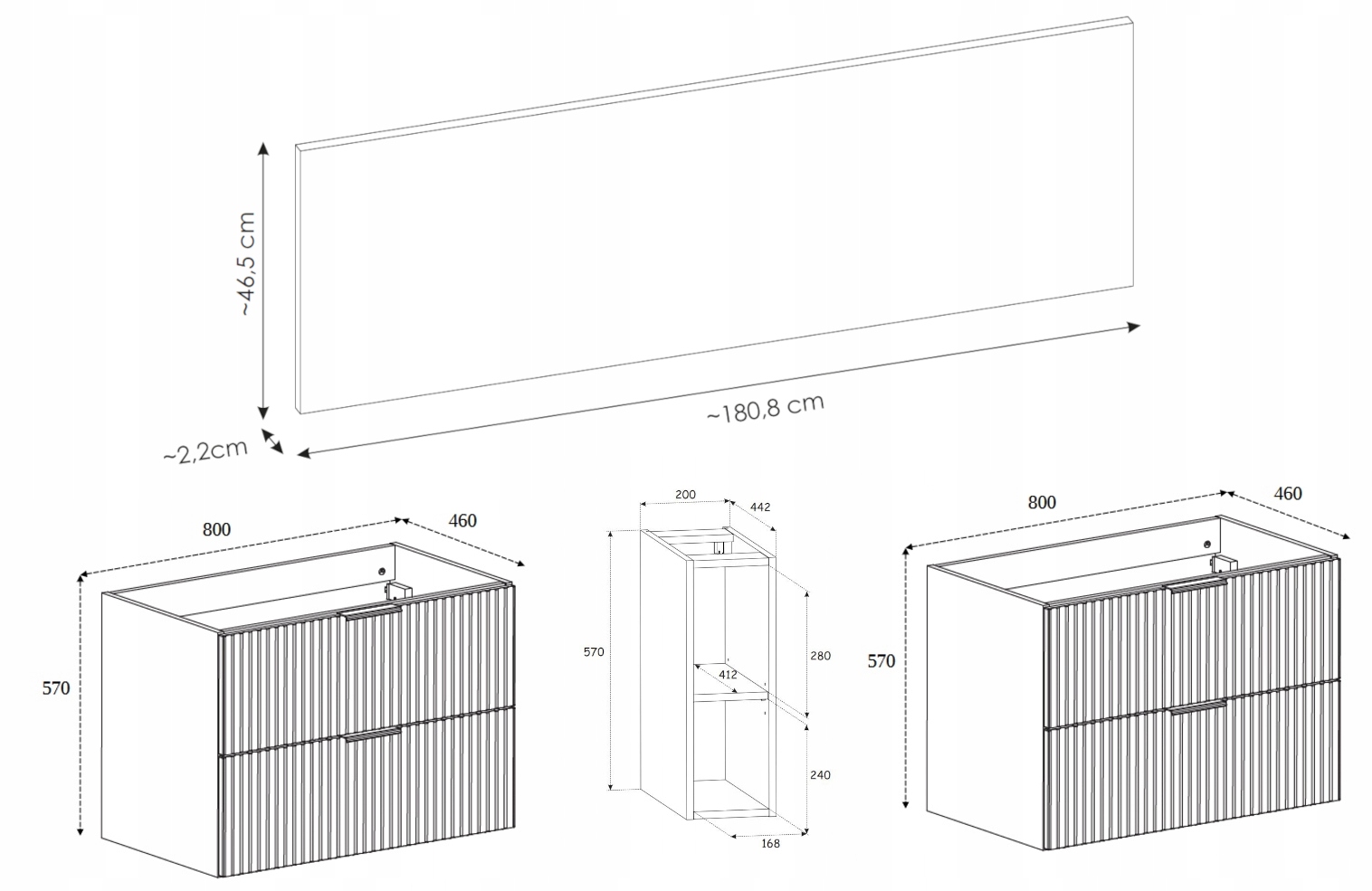 Uzupełnieniem kompozycji jest regał o uniwersalnym montażu, który można ustawić po lewej lub prawej stronie, a także pomiędzy szafkami, dopasowując układ do indywidualnych potrzeb i przestrzeni łazienki. W zestawie znajdują się trzy kolory uchwytów – czarne, złote i srebrne – co pozwala na pełną personalizację wyglądu mebla.
