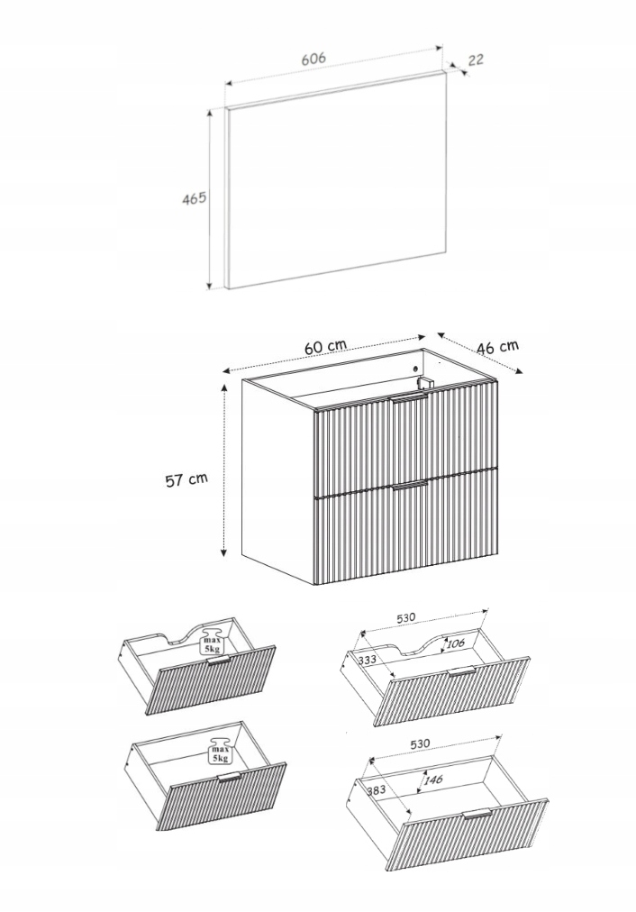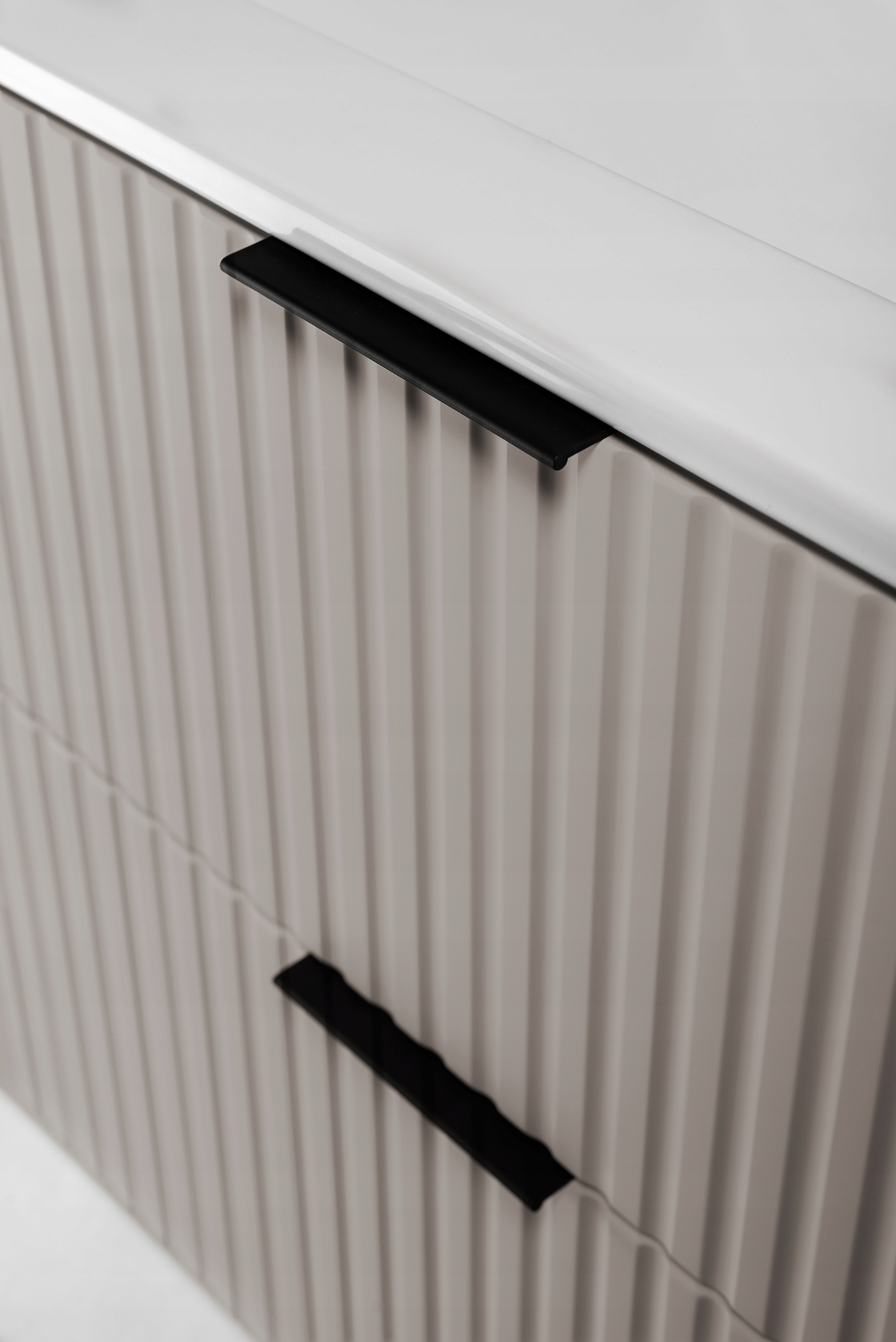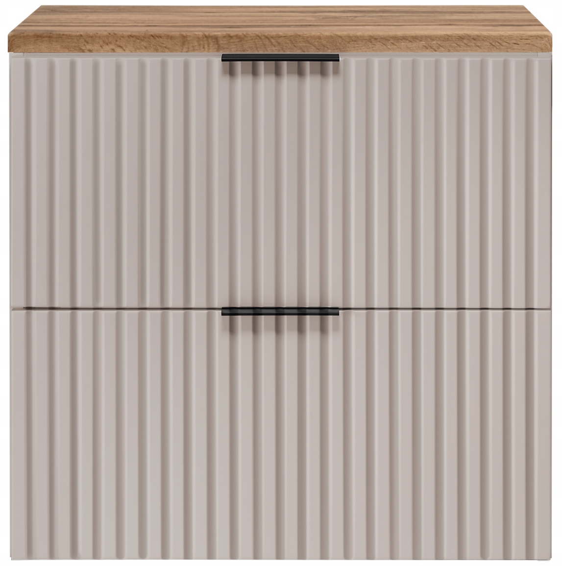 Ryflowane fronty nadają meblowi wyrazisty, a zarazem subtelny charakter, natomiast blat w dekorze dąb Wotan wprowadza do wnętrza naturalne ciepło i elegancki kontrast. Dwie pojemne szuflady wyposażone w system cichego domyku SOFT CLOSE zapewniają komfortowe, płynne i bezgłośne użytkowanie na co dzień.
