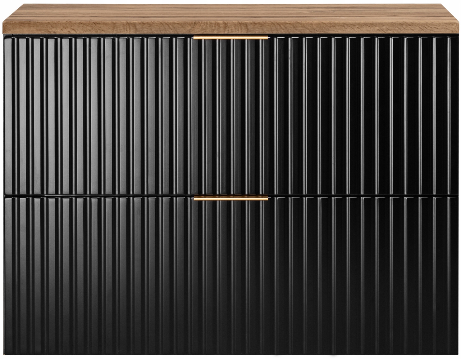 Czarna szafka łazienkowa z kolekcji FLOW to eleganckie i funkcjonalne rozwiązanie do nowoczesnych wnętrz. Ryflowane fronty w matowym czarnym wykończeniu nadają meblowi wyrazistego, designerskiego charakteru, a blat w dekorze dąb Wotan wprowadza naturalny akcent i efektowny kontrast. Całość tworzy spójną, stylową bryłę idealnie pasującą do aranżacji w stylu nowoczesnym i glamour.