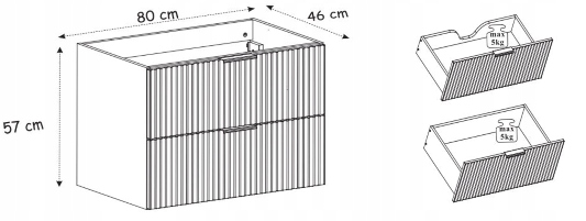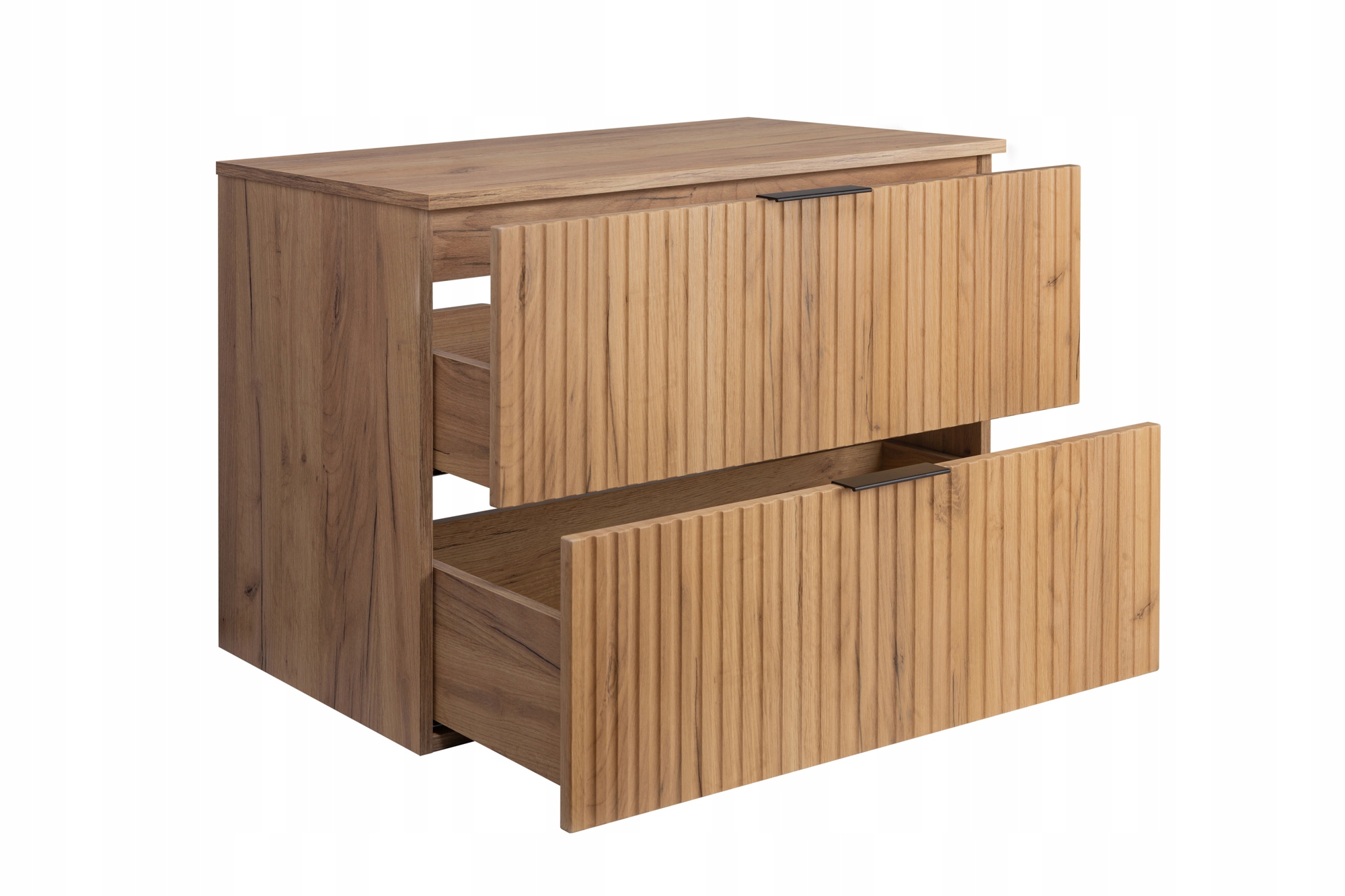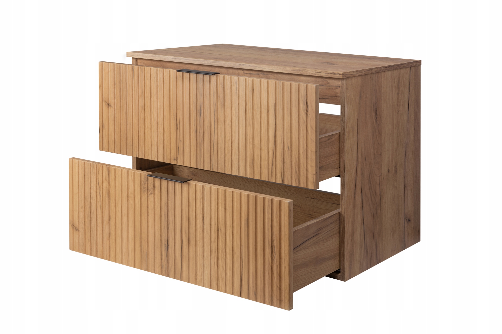 Dzięki dwóm pojemnym szufladom wyposażonym w system cichego domyku SOFT CLOSE codzienne korzystanie z łazienki staje się wygodne i komfortowe. Ryflowane fronty nadają szafce nowoczesnego charakteru, dzięki czemu doskonale wpisuje się ona zarówno w nowoczesne, jak i klasyczne aranżacje wnętrz.