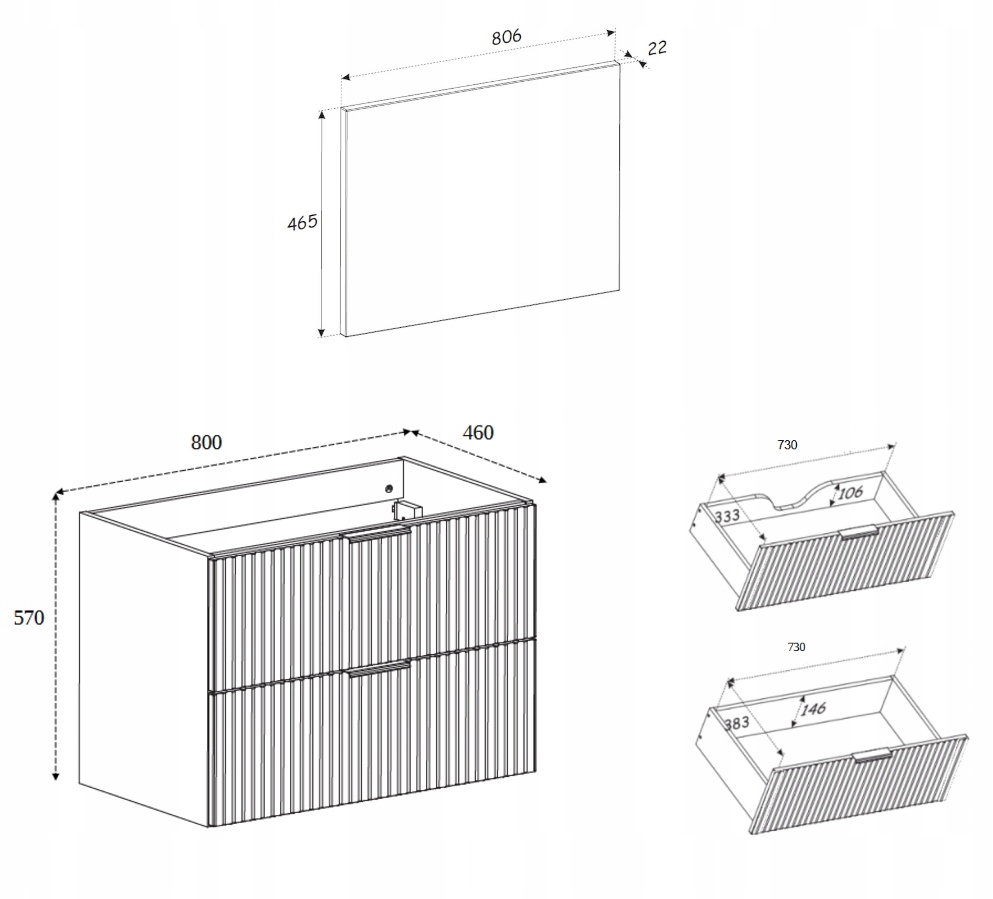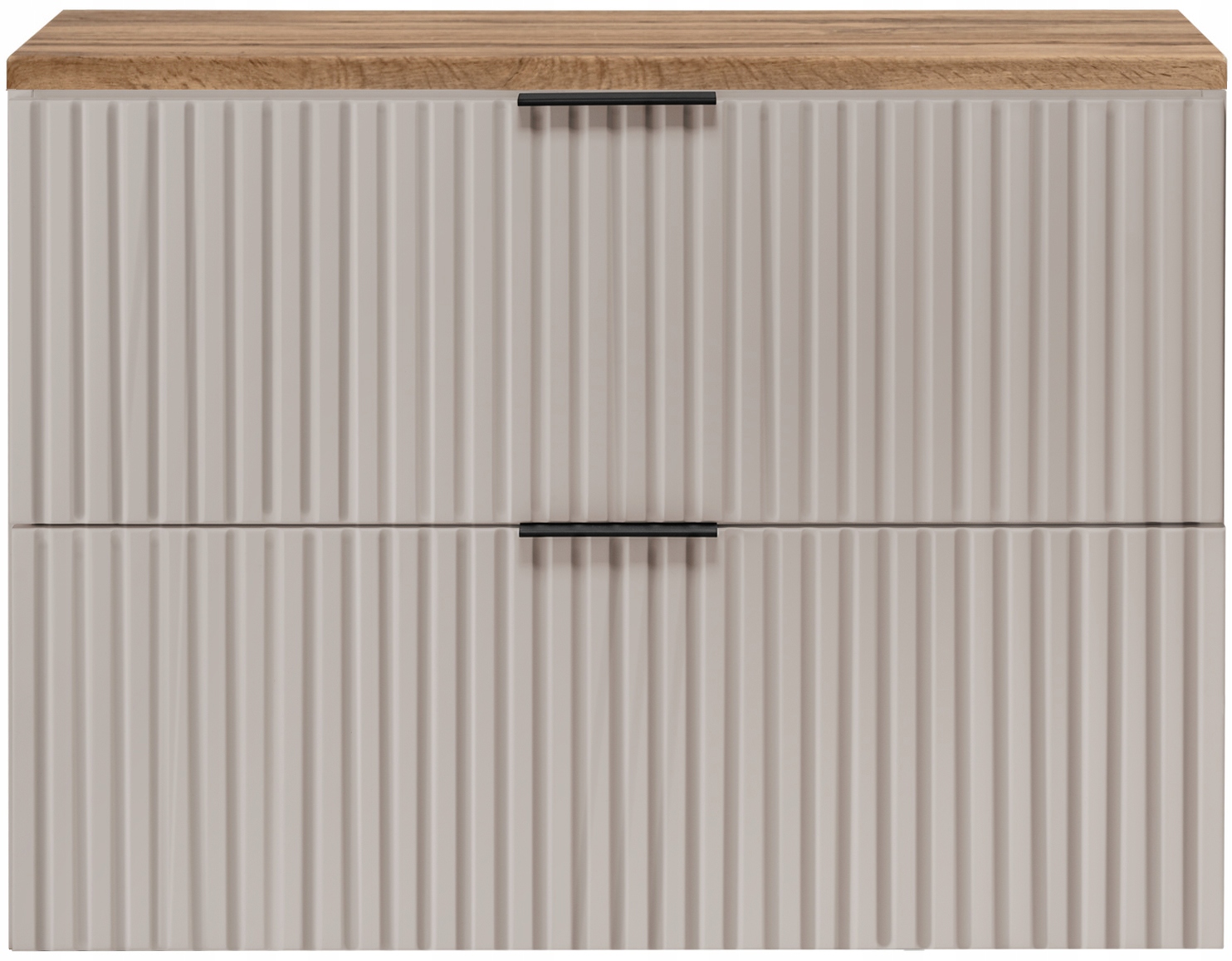 Mebel wyróżnia się dekoracyjnymi, ryflowanymi frontami oraz eleganckim blatem w dekorze dąb Wotan, który wprowadza do wnętrza naturalny i ciepły akcent. Dwie pojemne szuflady wyposażone w system cichego domyku SOFT CLOSE zapewniają wygodne, płynne i bezgłośne użytkowanie na co dzień.