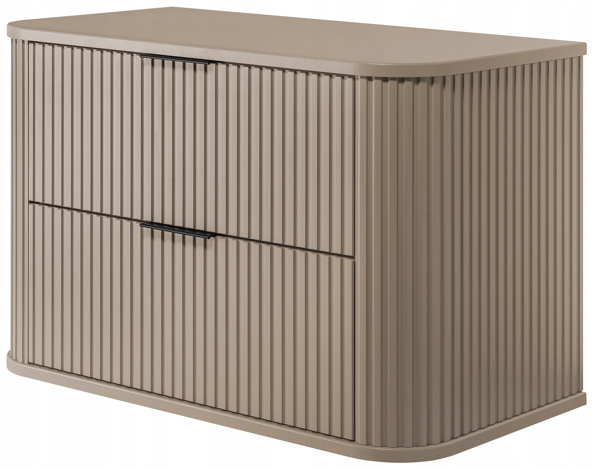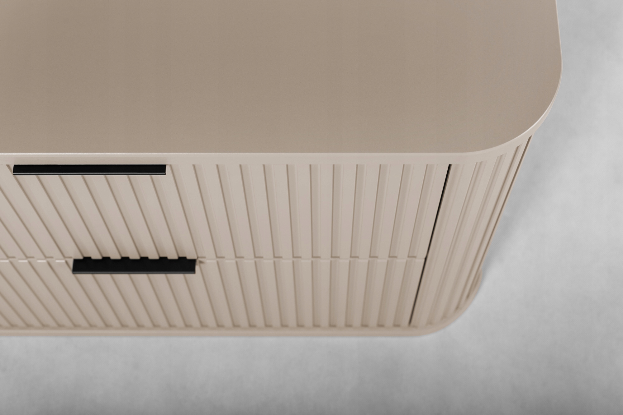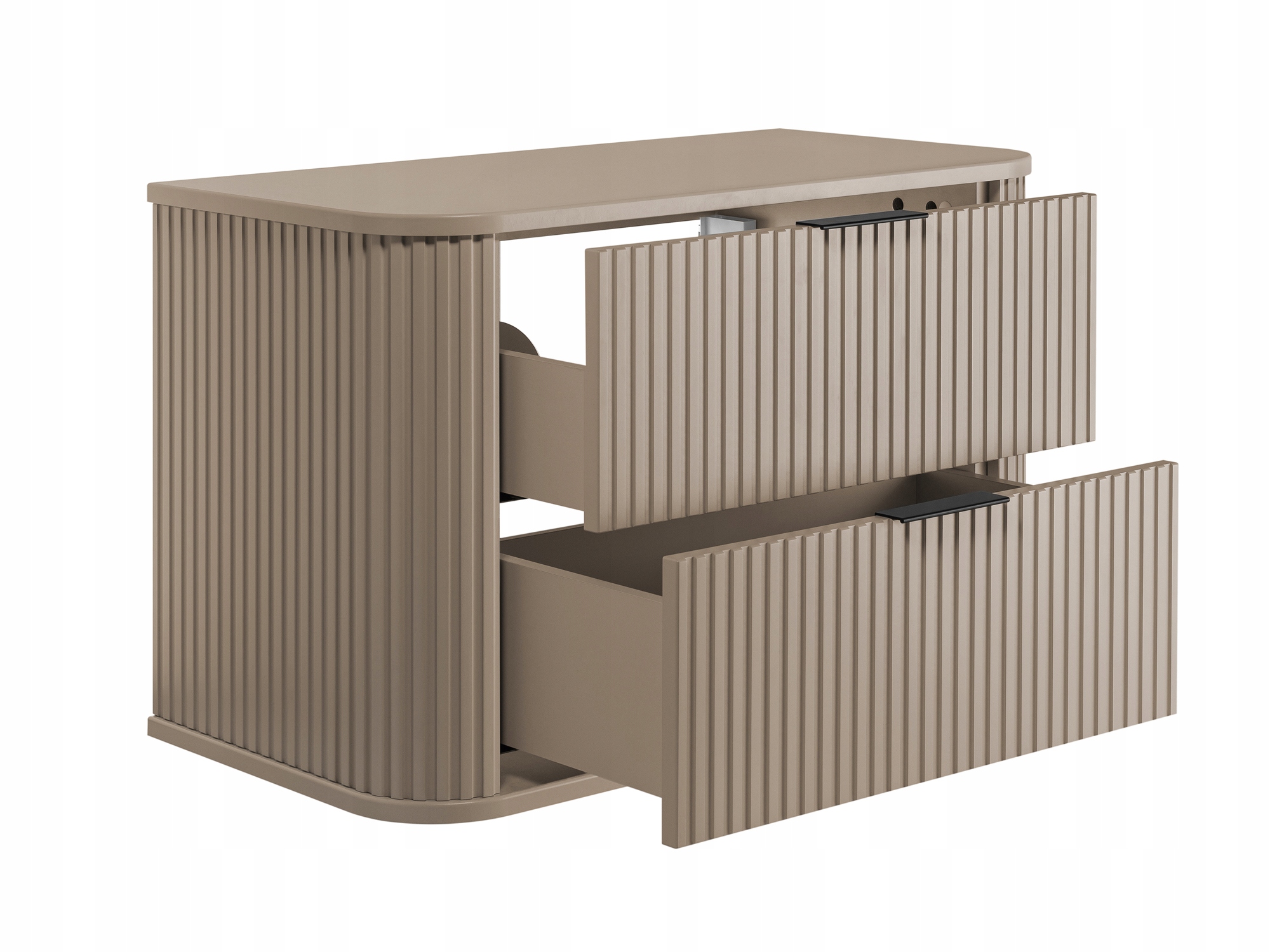 Dzięki przestronnym szufladom, szafka oferuje nie tylko estetykę, ale również praktyczne miejsce do przechowywania wszelkich niezbędnych akcesoriów. Stylowe fronty z ryflowanym wykończeniem w modnym odcieniu kaszmiru sprawiają, że mebel ten staje się centralnym punktem każdej łazienki.