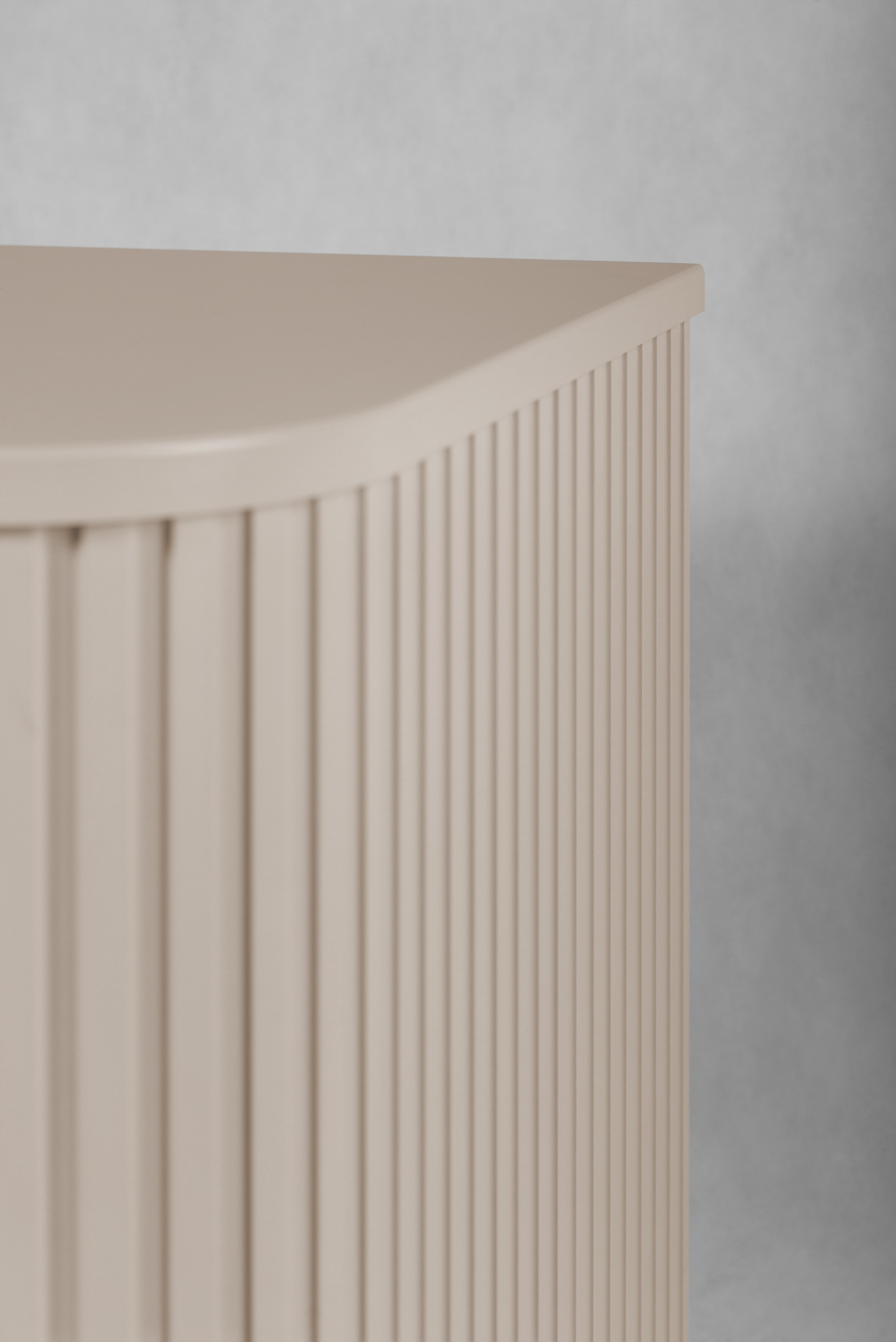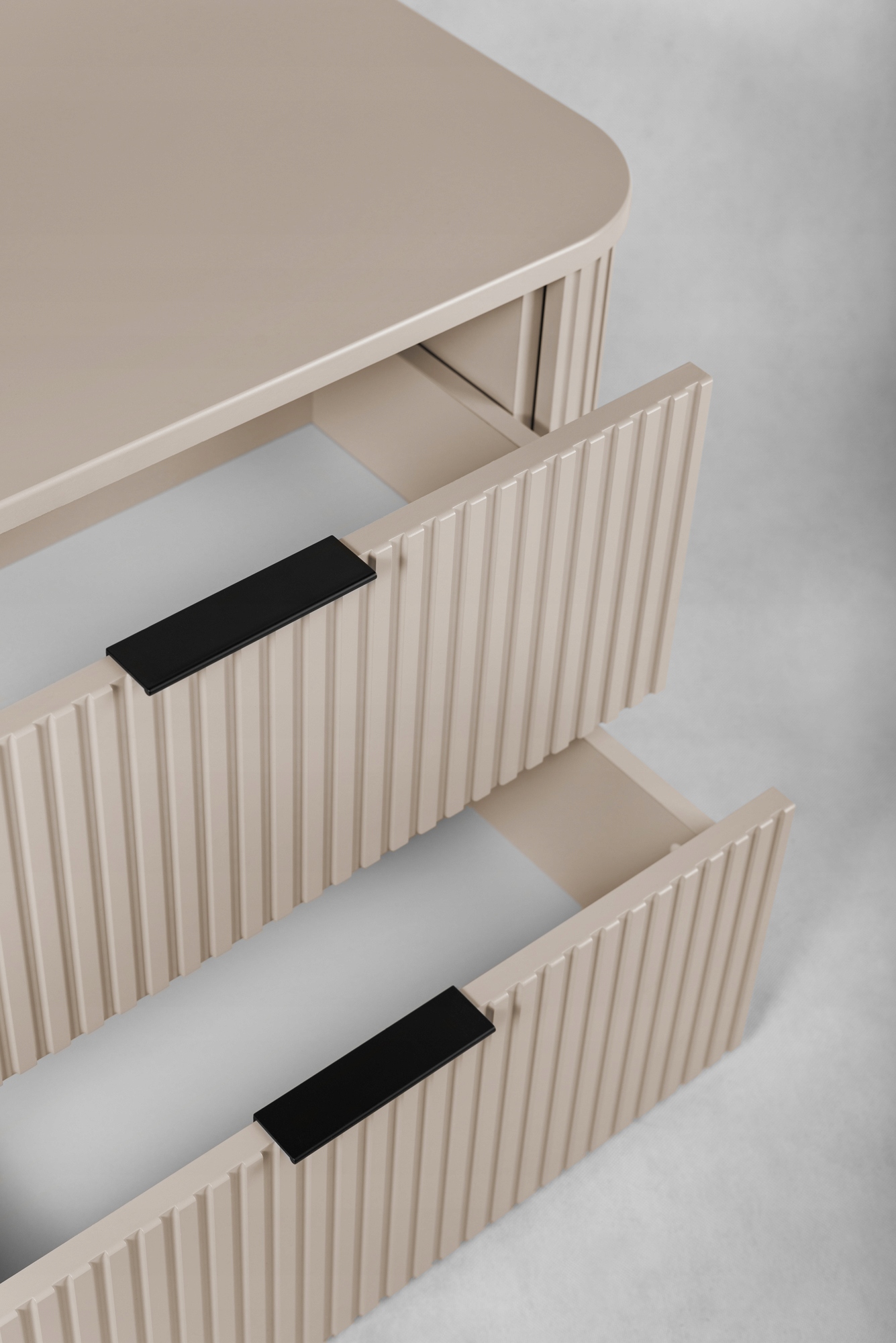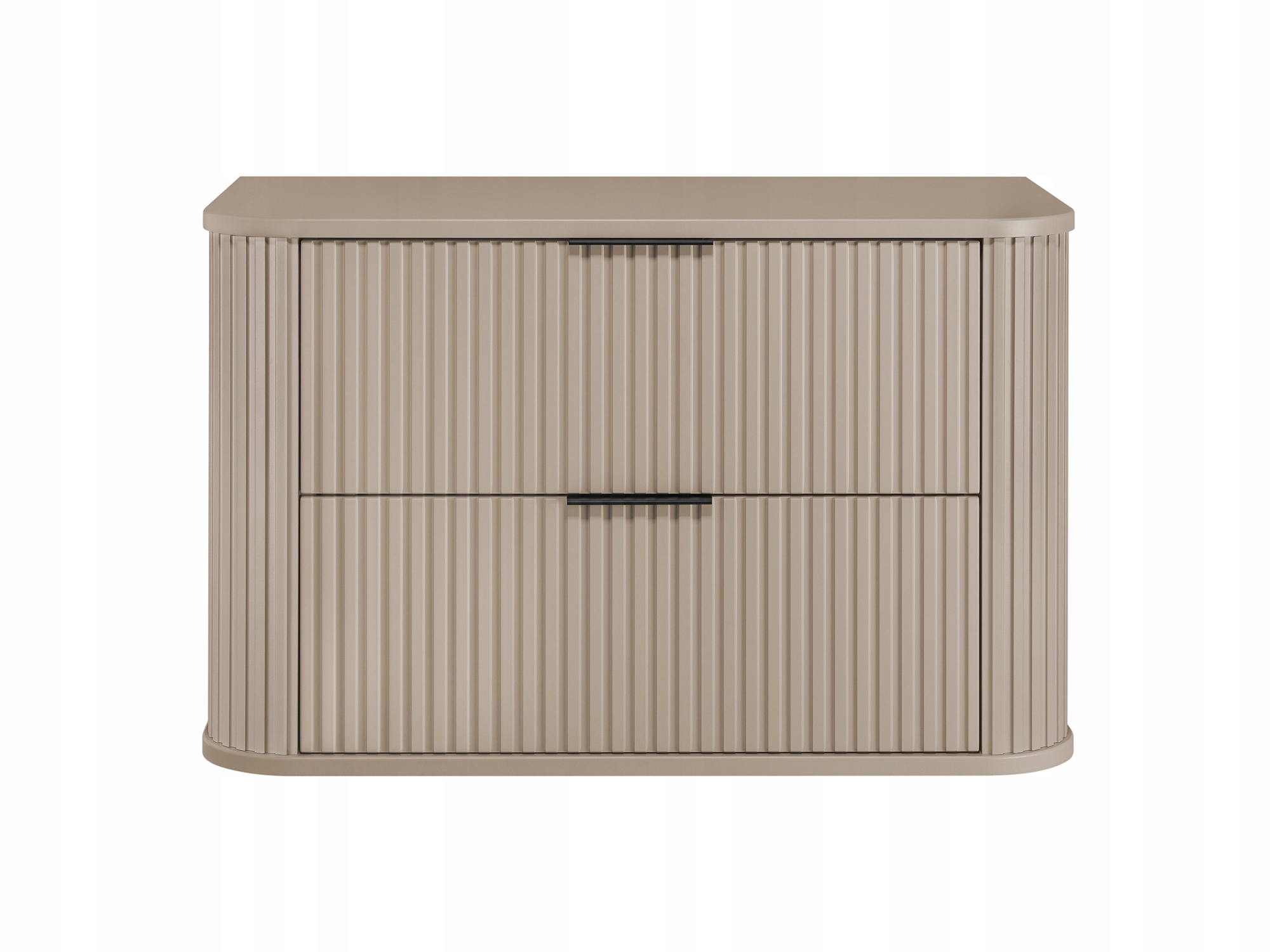 Dzięki przestronnym szufladom, szafka oferuje nie tylko estetykę, ale również praktyczne miejsce do przechowywania wszelkich niezbędnych akcesoriów. Stylowe fronty z ryflowanym wykończeniem w modnym odcieniu kaszmiru sprawiają, że mebel ten staje się centralnym punktem każdej łazienki.
