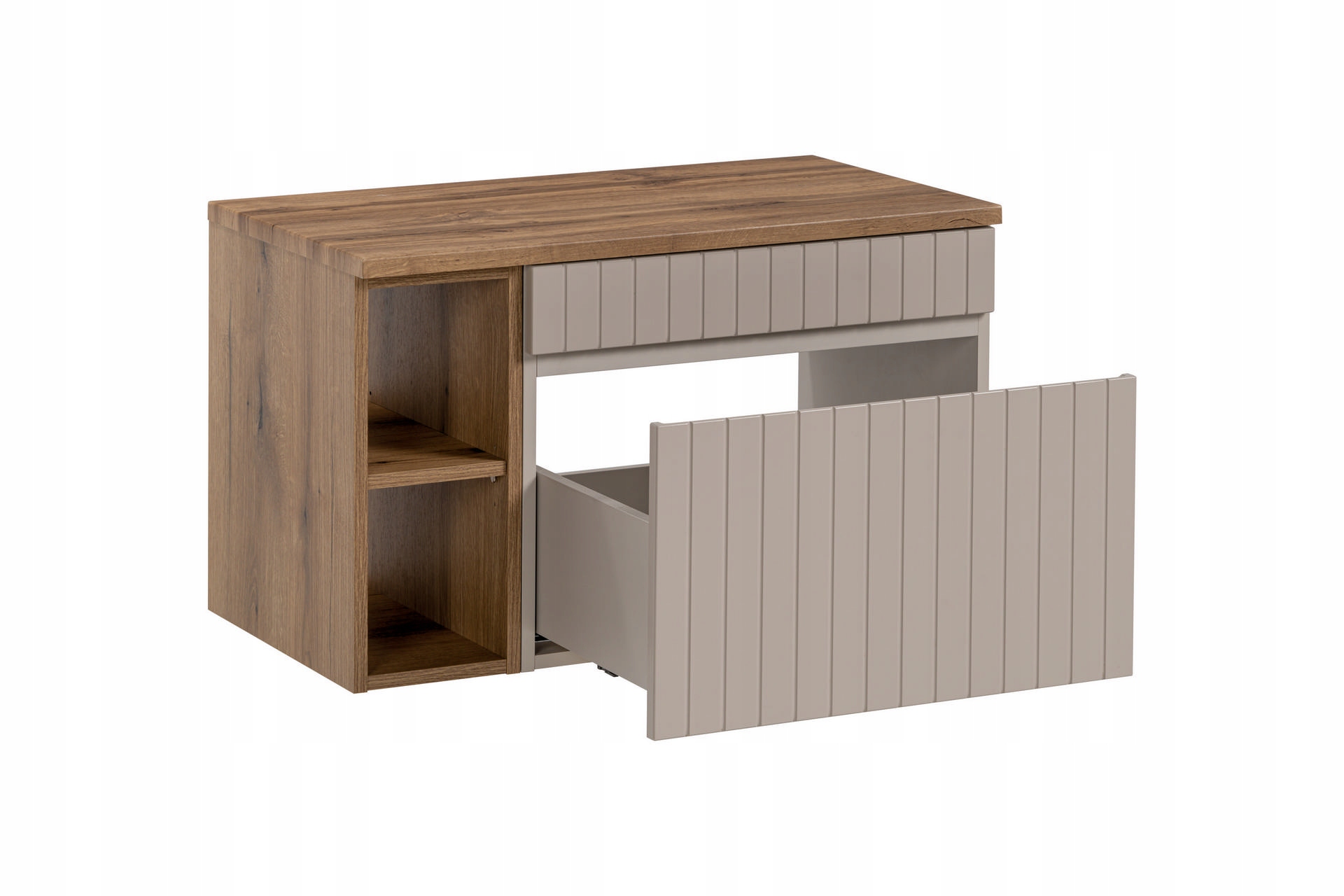 Odkryj elegancję i funkcjonalność z kolekcją ICONIC. Szafka Łazienkowa RYFLOWANA w kolorze kaszmirowym oraz z regałem w kolorze dębu. Jej nowoczesny design, wzbogacony o pionowe frezowania, nadaje łazience unikalny charakter, wprowadzając subtelny ruch i płynność do wnętrza.